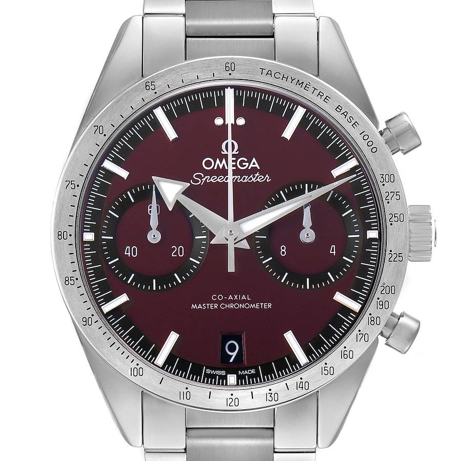 Omega Speedmaster 57 Steel Mens Watch 332.10.41.51.11.001 Box Card. Manual-winding chronograph with column wheel and CoAxial escapement. Certified Master Chronometer, approved by METAS, resistant to magnetic fields reaching 15,000 gauss. Silicon balance-spring, 2 barrels mounted in series, time zone function. Rhodium plated finish with Geneva waves in arabesque. Stainless steel round case 40.5 mm in diameter. Transparent exhibition sapphire crystal caseback. Stainless steel bezel with tachymetre function. Scratch-resistant sapphire crystal with anti-reflective treatment on both sides. Red dial with luminous index hour markers and broad arrow hands. Date window at 6 o'clock. Two chronograph subdials -- 60 seconds and 12 hours. Brushed and polished stainless steel bracelet with fold over clasp. Fits a 7 3/4" wrist.