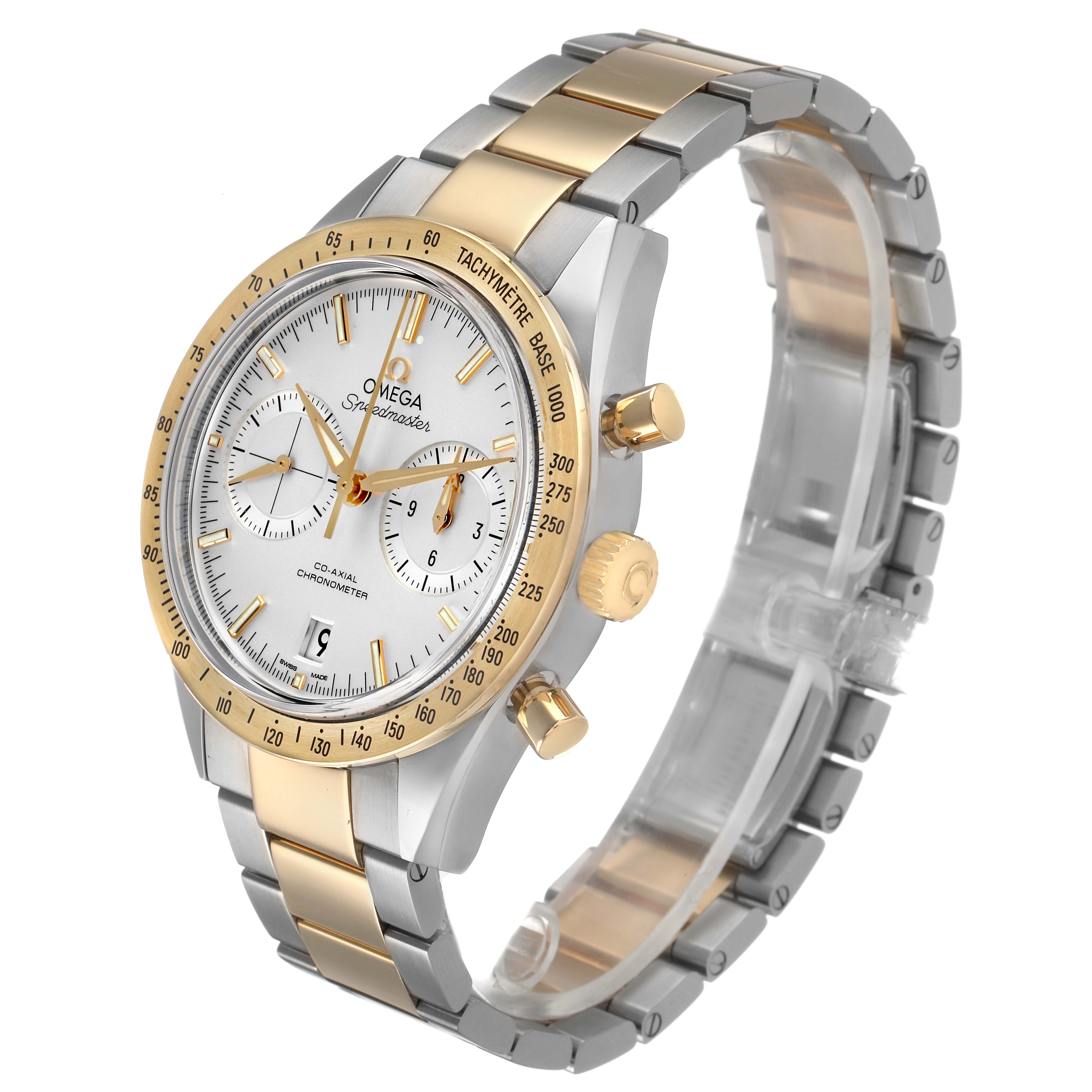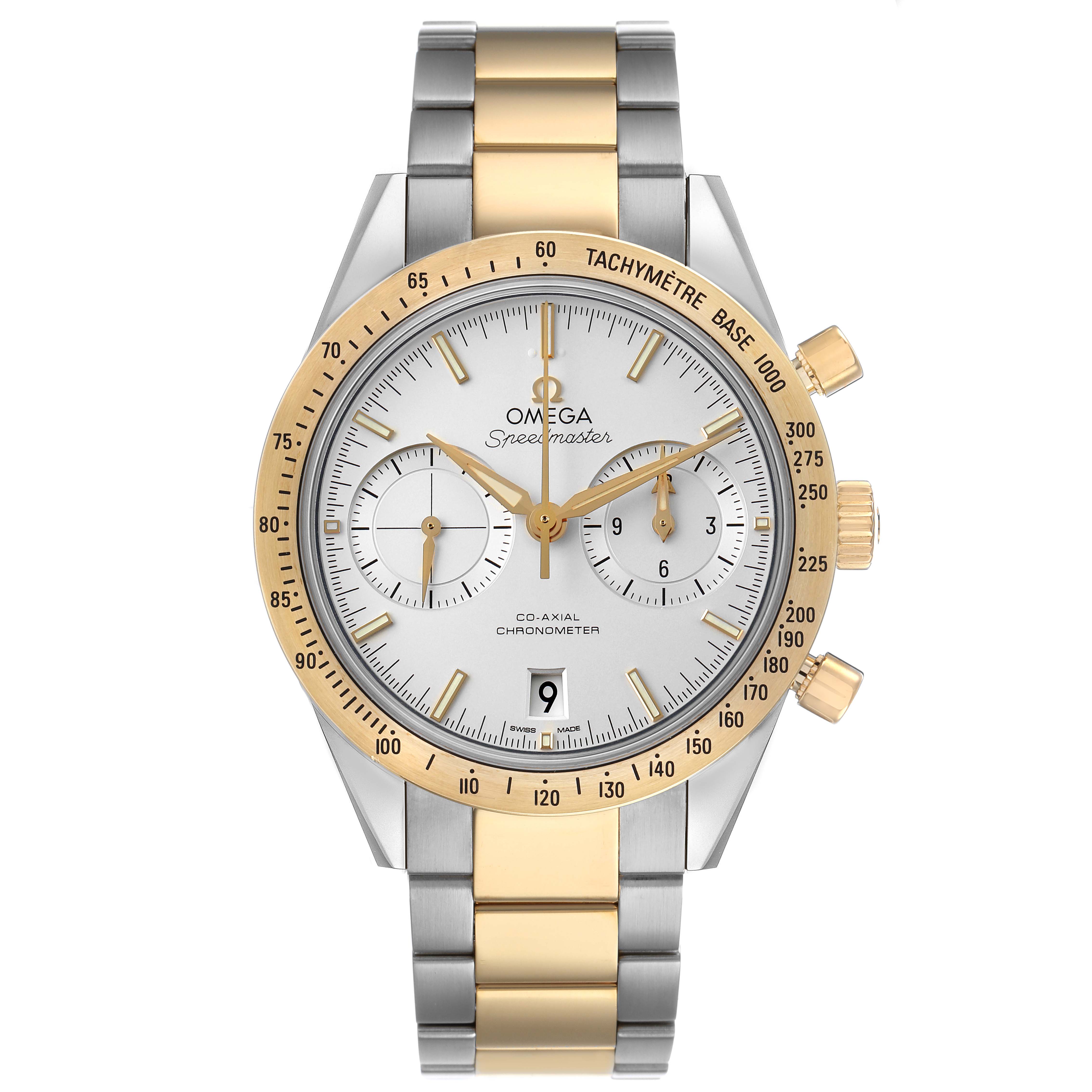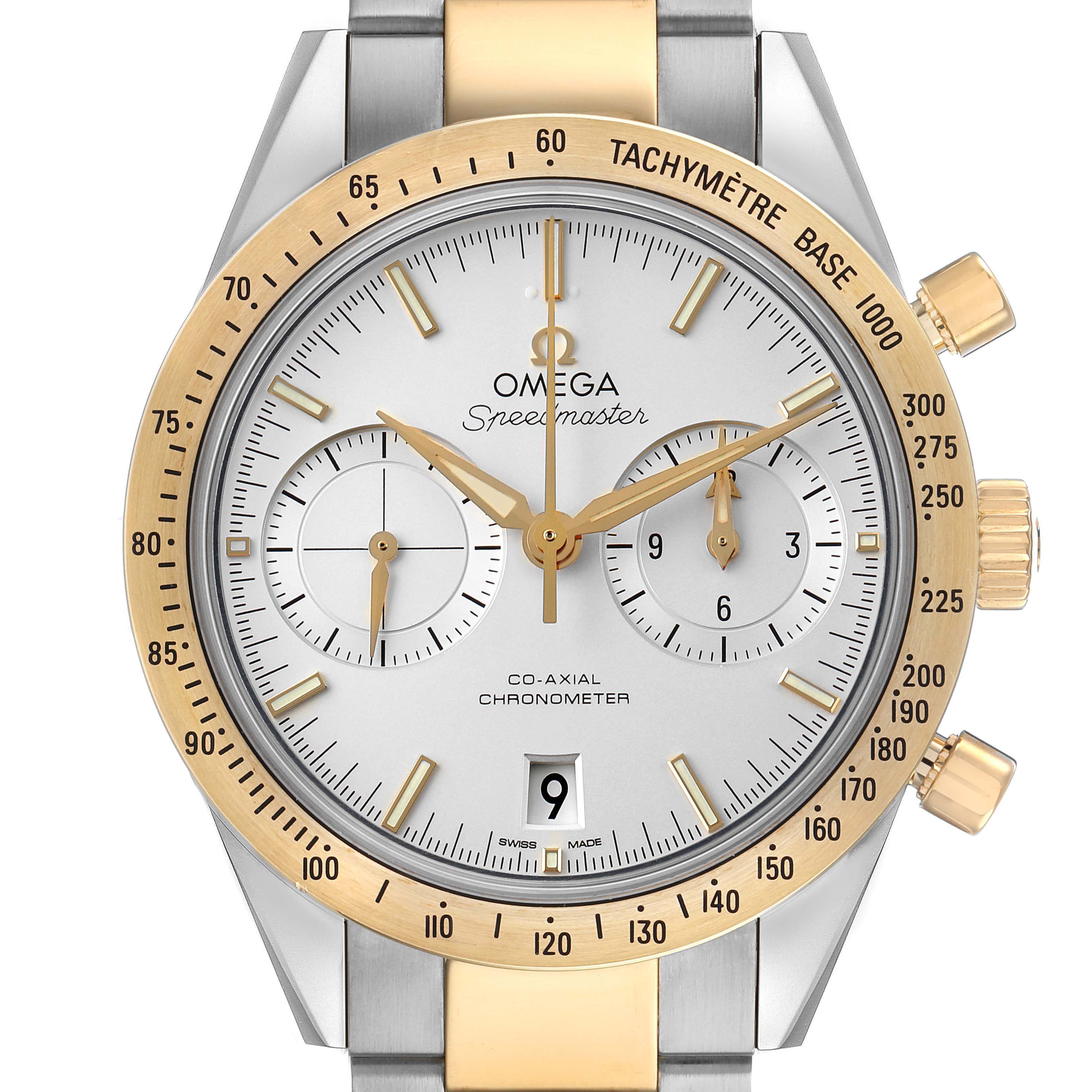 Omega Speedmaster 57 Steel Yellow Gold Mens Watch 331.20.42.51.02.001. Automatic self-winding chronograph movement with column wheel mechanism and Co-Axial escapement. Silicon balance-spring on free sprung-balance, 2 barrels mounted in series, automatic winding in both directions. Stainless steel and 18K yellow gold round case 41.5 mm in diameter. 18K yellow gold bezel with tachymetre scale. Scratch-resistant sapphire crystal with anti-reflective treatment inside. Silver dial with luminous baton hour markers and yellow gold outlined luminous hands. Seconds sub-dial at 9 o’clock and a 12-hour and 60-minute chronograph recorder on the sub-dial at 3 o’clock. Central chronograph seconds hand. Date window at 6 o’clock. Stainless steel and yellow gold bracelet with deployant clasp. Fits an 8 1/4" wrist.
