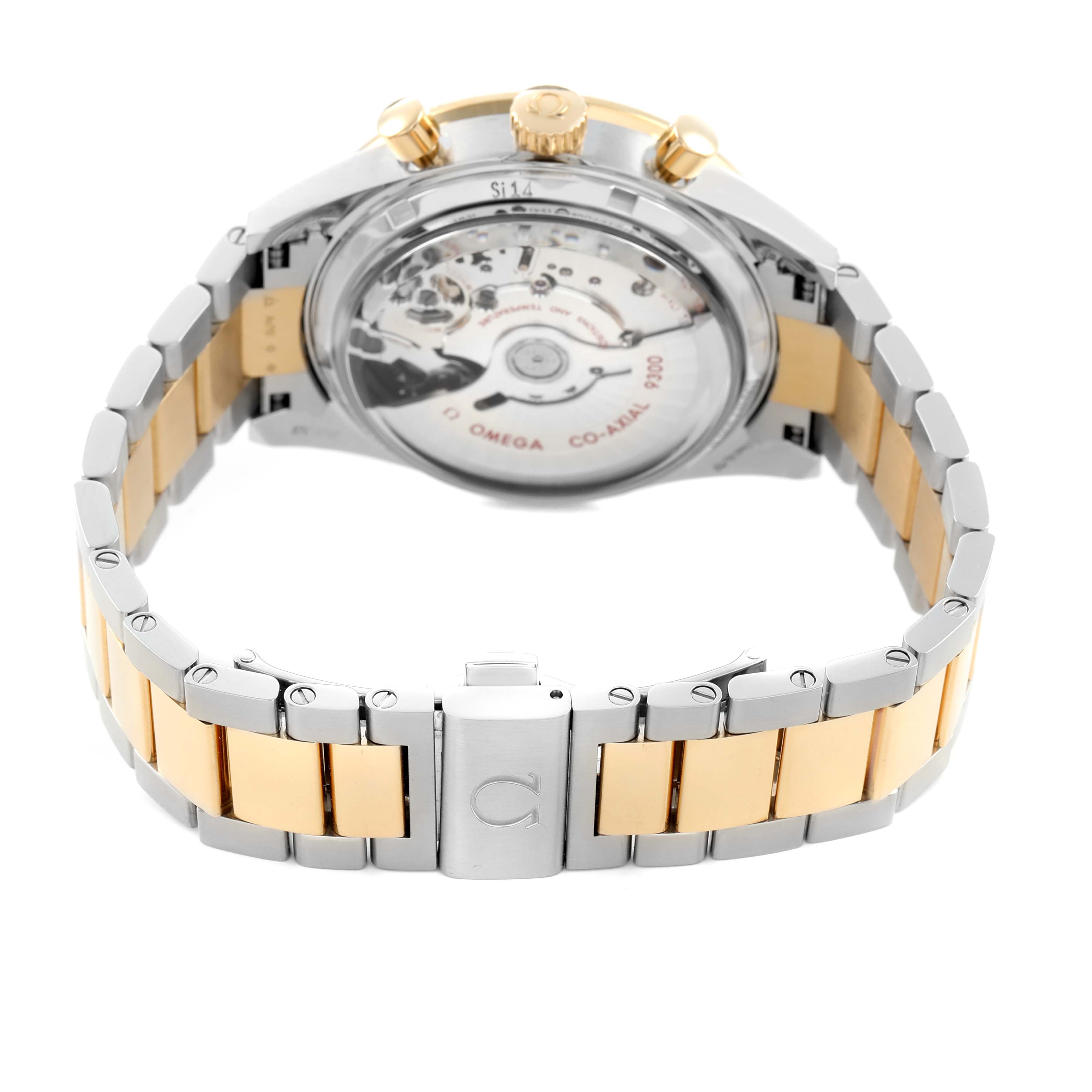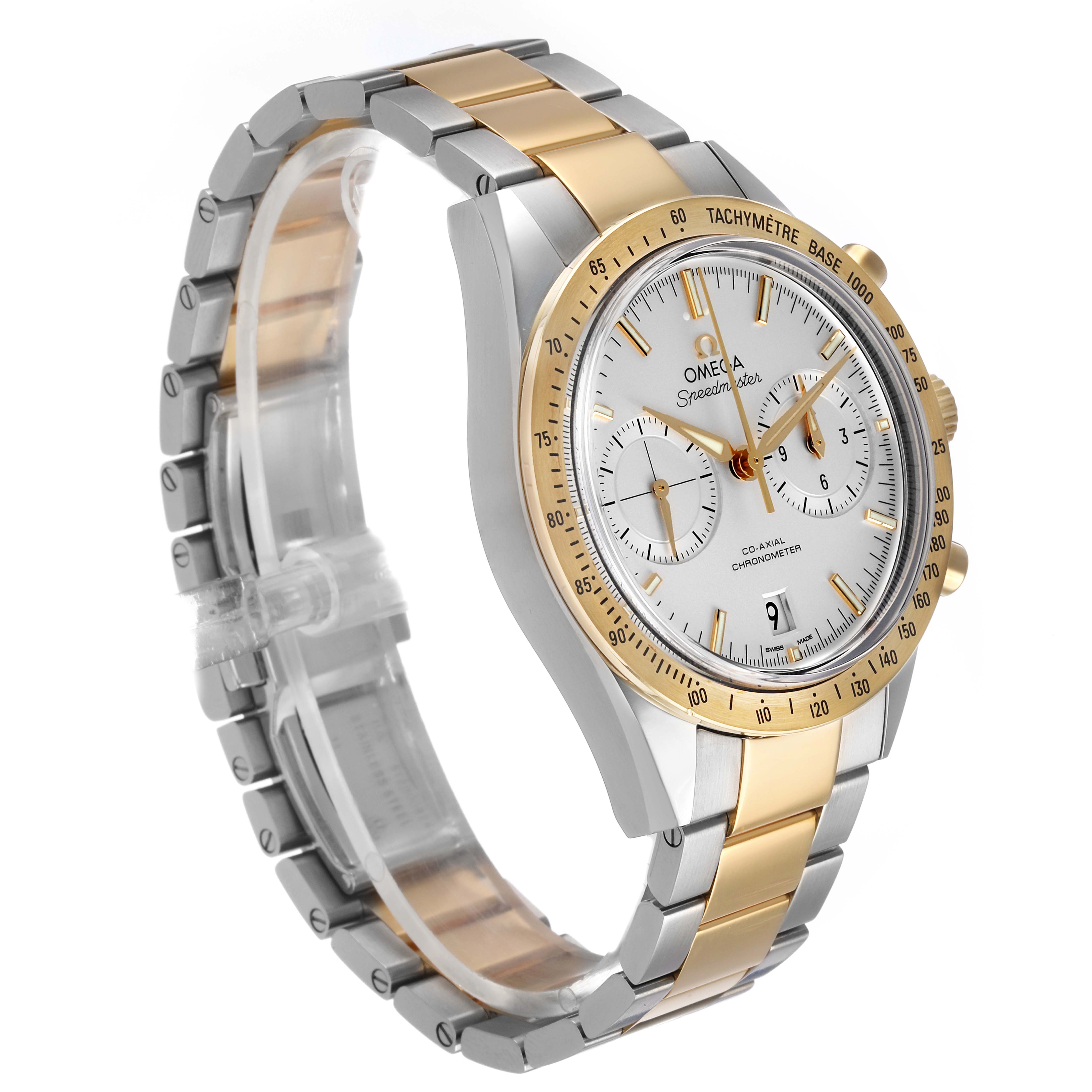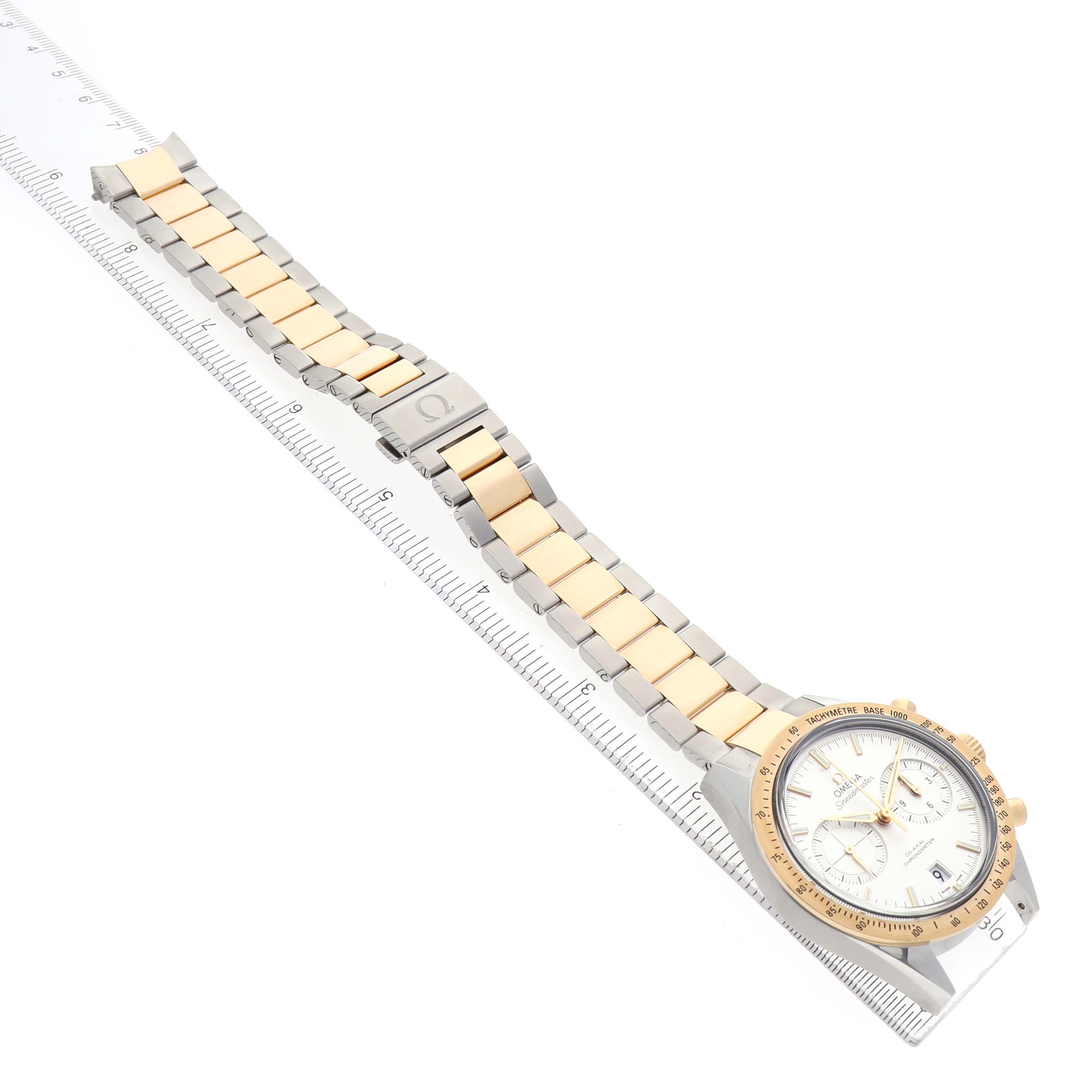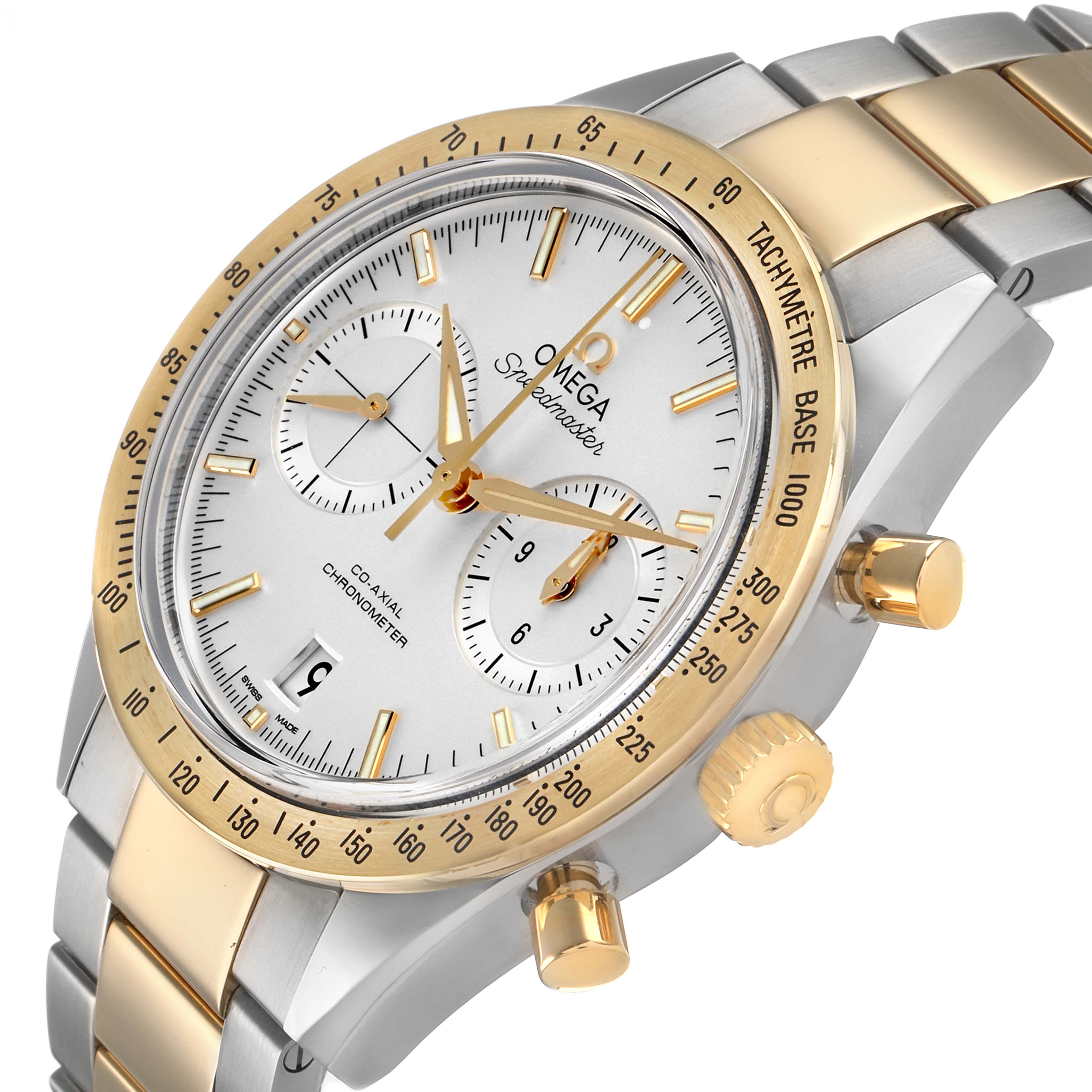 Omega Speedmaster 57 Steel Yellow Gold Mens Watch 331.20.42.51.02.001. Automatic self-winding chronograph movement with column wheel mechanism and Co-Axial escapement. Silicon balance-spring on free sprung-balance, 2 barrels mounted in series, automatic winding in both directions. Stainless steel and 18K yellow gold round case 41.5 mm in diameter. 18K yellow gold bezel with tachymetre scale. Scratch-resistant sapphire crystal with anti-reflective treatment inside. Silver dial with luminous baton hour markers and yellow gold outlined luminous hands. Seconds sub-dial at 9 o’clock and a 12-hour and 60-minute chronograph recorder on the sub-dial at 3 o’clock. Central chronograph seconds hand. Date window at 6 o’clock. Stainless steel and yellow gold bracelet with deployant clasp. Fits an 8 1/4" wrist.