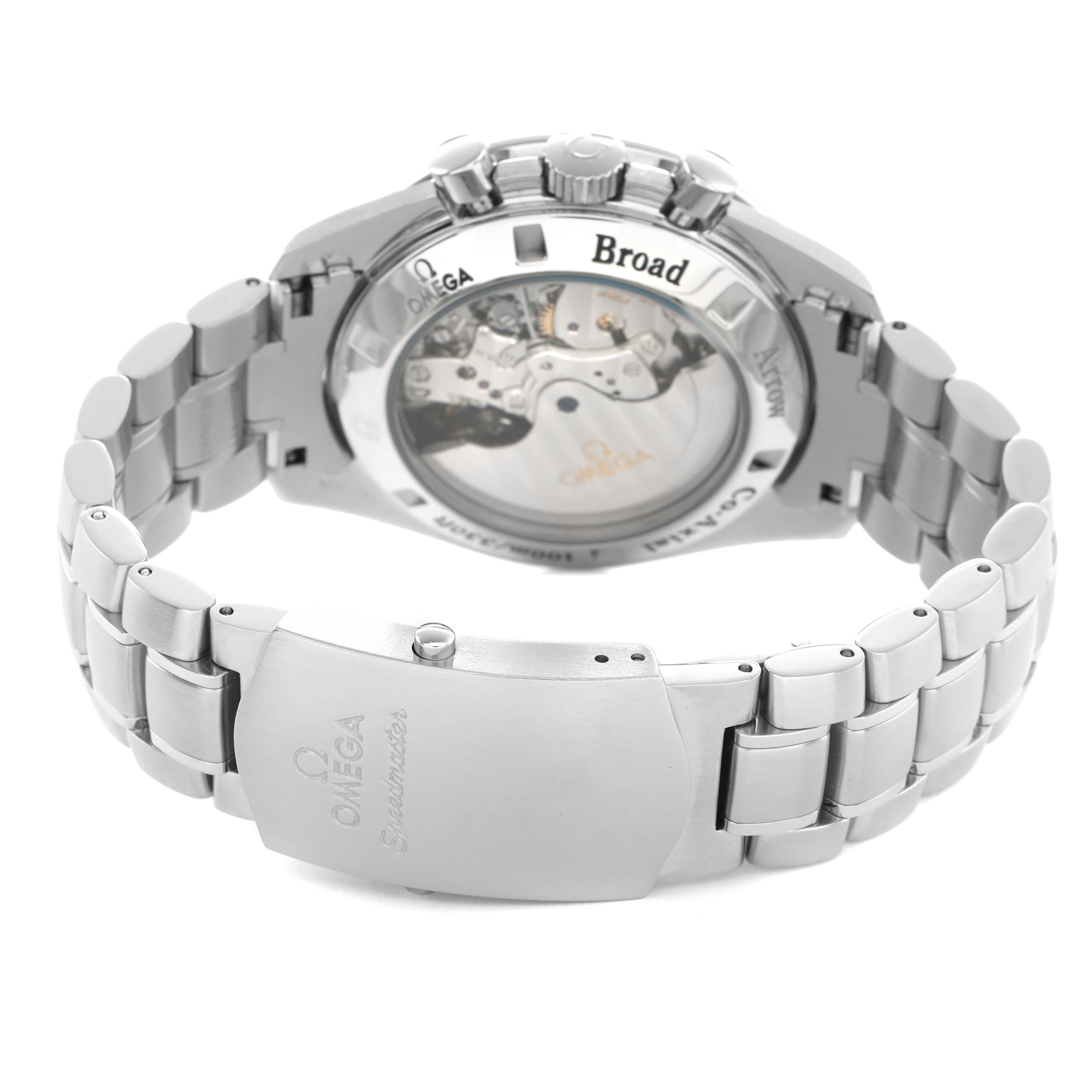 | Case: | Stainless steel round case 42.0 mm in diameter. Transparent exhibition sapphire crystal caseback. Two pushers operate the chronograph functions. Omega logo on the crown. |