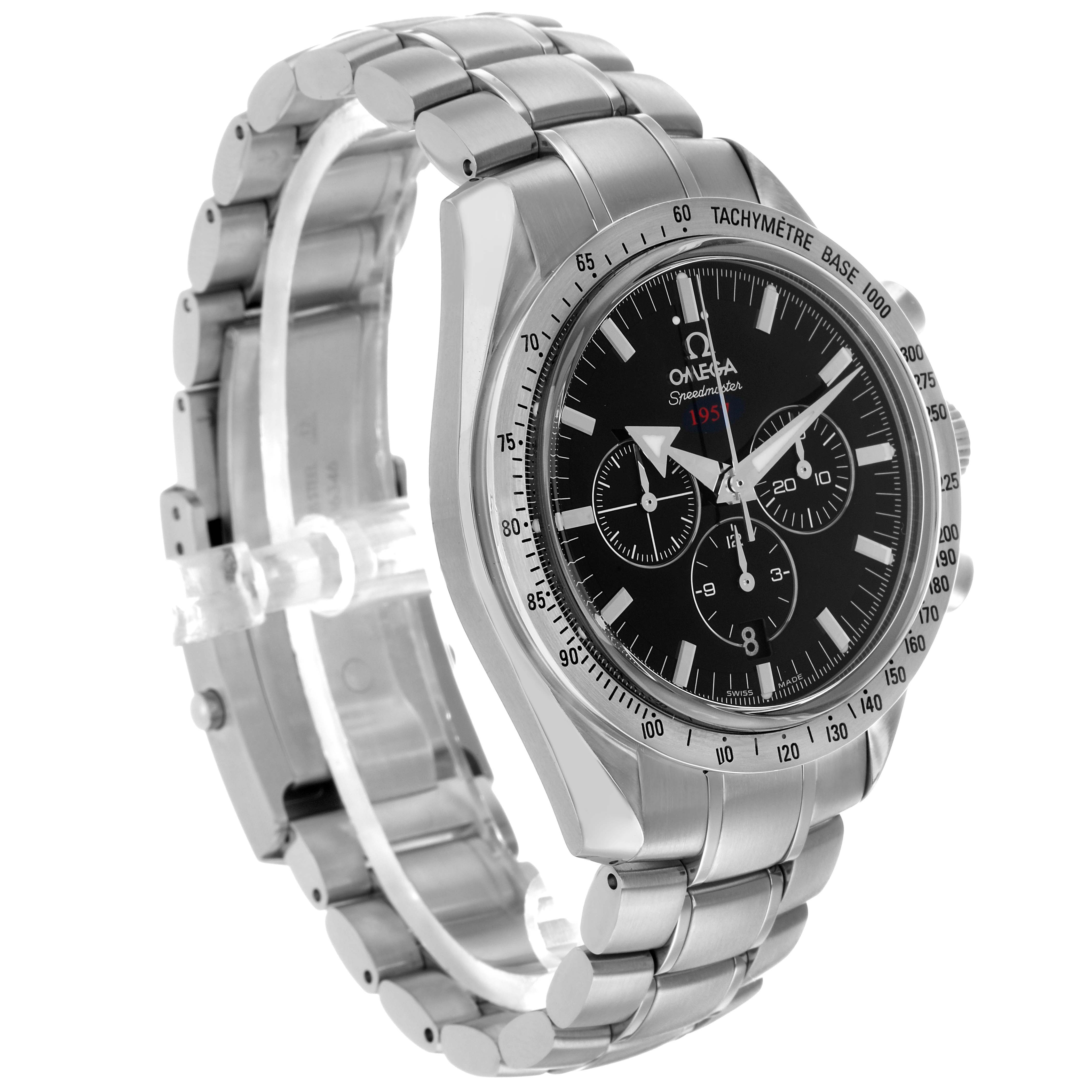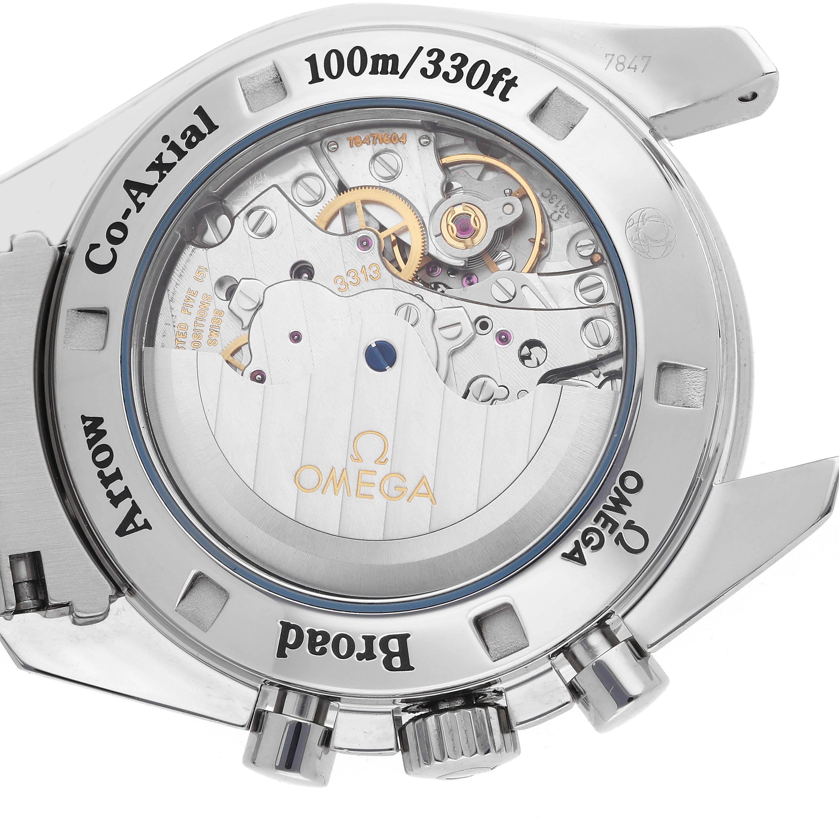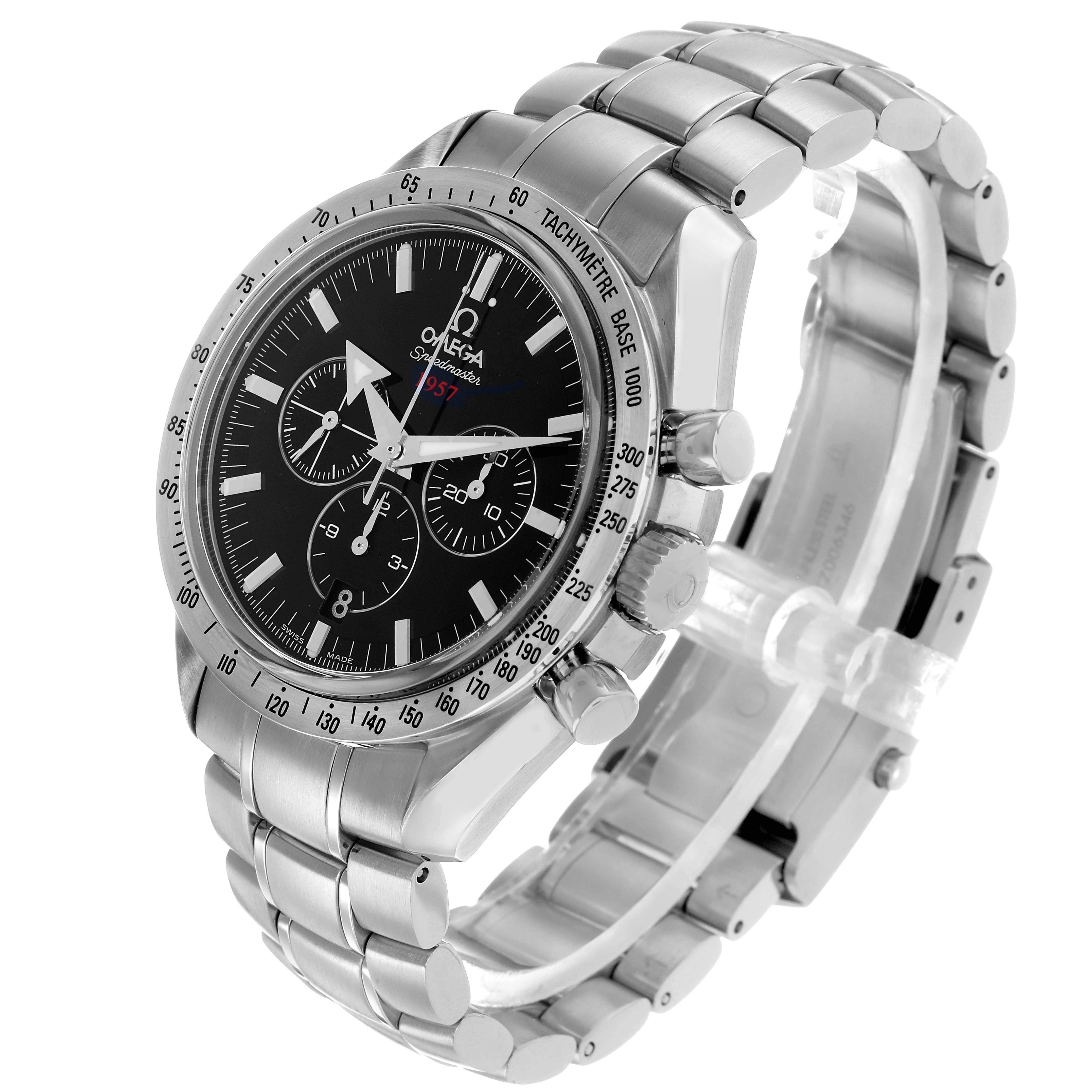 Omega Speedmaster Broad Arrow 1957 Steel Mens Watch 321.10.42.50.01.001 Cards. Automatic self-winding chronograph movement with column wheel mechanism and Co-Axial Escapement. Stainless steel round case 42.0 mm in diameter. Transparent exhibition sapphire crystal caseback. Two pushers operate the chronograph functions. Omega logo on the crown. Stainless steel bezel engraved with the tachymeter scale. Scratch-resistant sapphire crystal with anti-reflective treatment inside. Black dial with baton hour markers and luminescent broad arrow hands. Three subdials -- running small seconds and the 30-minute and 12-hour chronograph registers. Date calendar at the 6 o'clock aperture. Stainless steel bracelet with a double push-button folding clasp. Fits a 7.5" wrist.