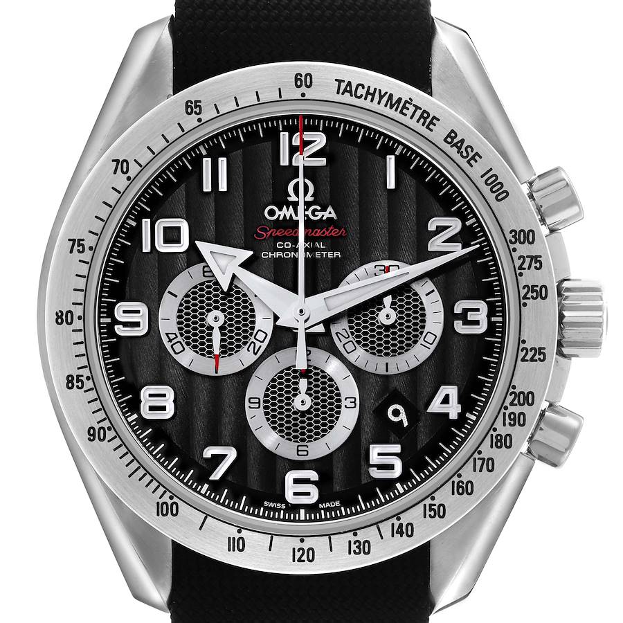 Omega Speedmaster Broad Arrow Black Dial Mens Watch 321.13.44.50.01.001. COSC-certified Omega automatic chronograph movement. Stainless steel round case 44.25 mm in diameter with polished bevelled edges, pushers and crown. Transparent exhibition sapphire crystal case back. Stainless steel bezel with engraved tachymeter scale. Scratch-resistant sapphire crystal with anti-reflective treatment inside. Black dial with vertical linear pattern. Arabic numerals. Minute markers around the outer rim. Luminescent hands and markers. 3 Chronograph subdials - 60 second, 30 minute and 12 hour. Date window between 4 and 5 o'clock. Textile strap with stainless steel deployant clasp.