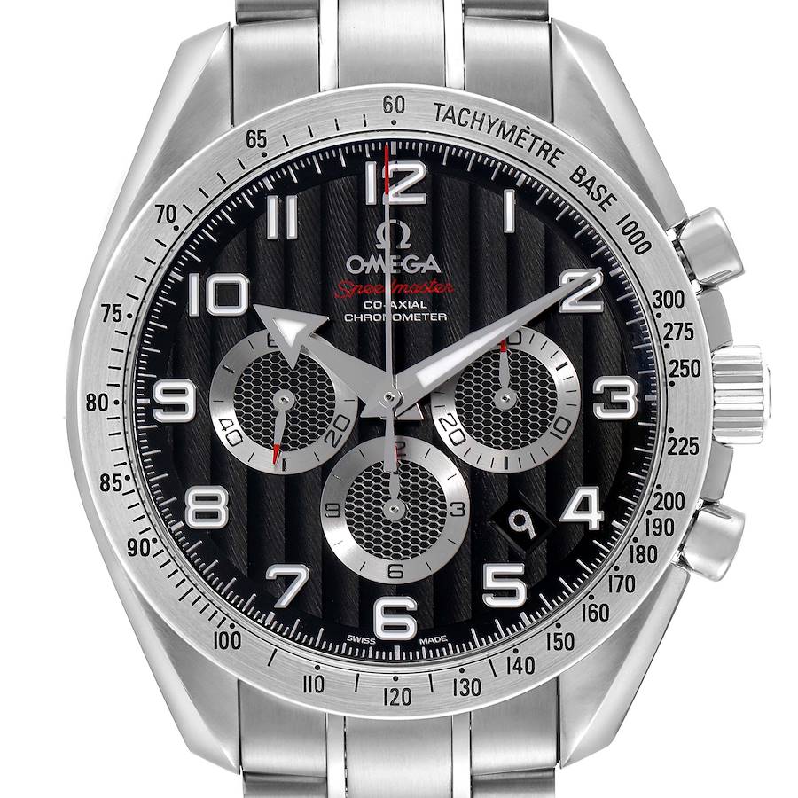 Omega Speedmaster Broad Arrow Steel Mens Watch 321.10.44.50.01.001. COSC-certified automatic self-winding chronograph movement, with Co-Axial escapement. Stainless steel round case 44.25 mm in diameter. Transparent exhibition sapphire crystal caseback. Two pushers operate the chronograph functions. Omega logo on the crown. Stainless steel bezel engraved with the tachymeter scale. Domed scratch-resistant sapphire crystal with anti-reflective treatment on both sides. Black dial with "Geneva Waves" pattern. Luminescent-inlayed Arabic numeral hour markers and Broad Arrow hands. Minute and 1/4 seconds stick markers around the outer rim. Three silver-outlined, "beehive" patterned subdials -- running small seconds, 30-minutes, and 12-hour chronograph registers. Date window between 4 and 5 o'clock. Stainless steel bracelet with a double push-button folding clasp. Fits an 7.5" wrist.