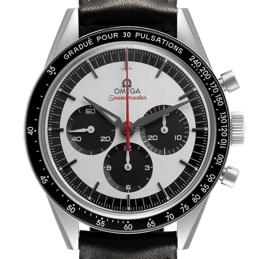 Omega Speedmaster CK2998 LE Steel Watch 311.32.40.30.02.001 Card. Manual winding chronograph movement. Caliber 1861. Stainless steel round case 39.7 mm in diameter. The Limited Edition number and the original Seahorse medallion embosed on case back. Two pushers operate the chronograph functions. Omega logo on the crown. Black ceramic bezel with a white enamel pulsometer scale. Scratch-resistant sapphire crystal with anti-reflective treatment inside. Sand-blasted silver dial with a black minute track. Red chronograph seconds hand. Blackened indexes and hands that are coated in Super-LumiNova. Three black subdials with sand-blasted rhodium-plated hands -- running seconds and the 30-minute and 12-hour chronograph registers. Black micro-perforated leather strap with a steel tang buckle. Additional Black and Grey NATO Strap.