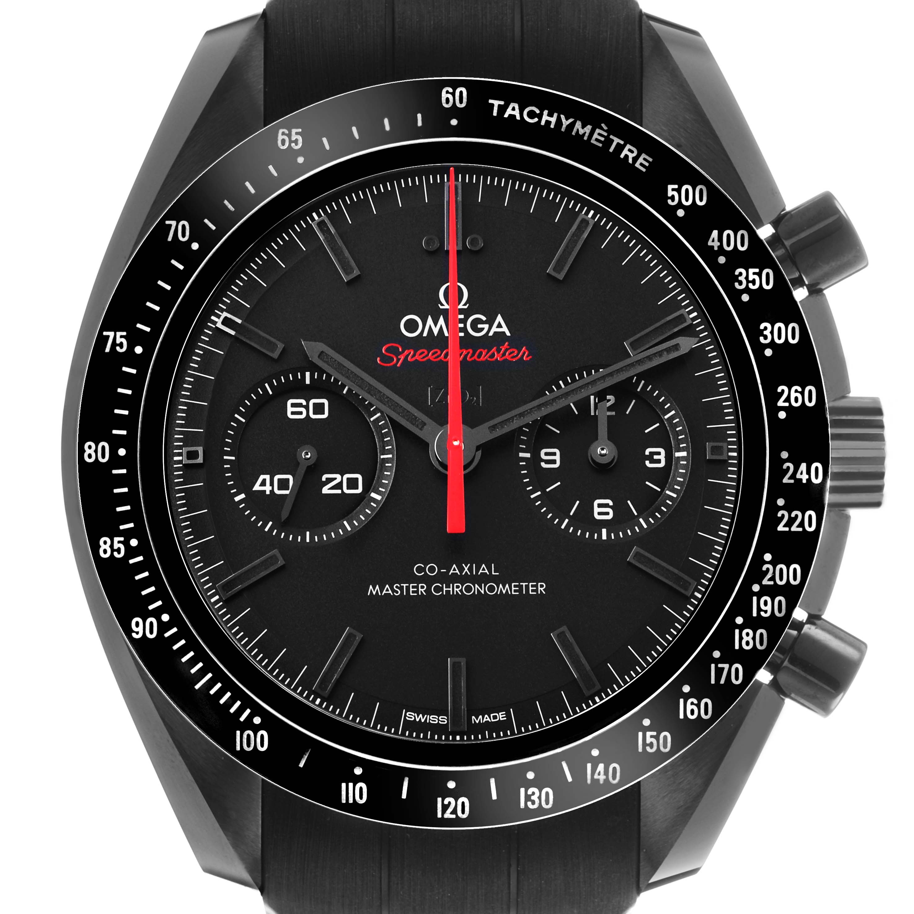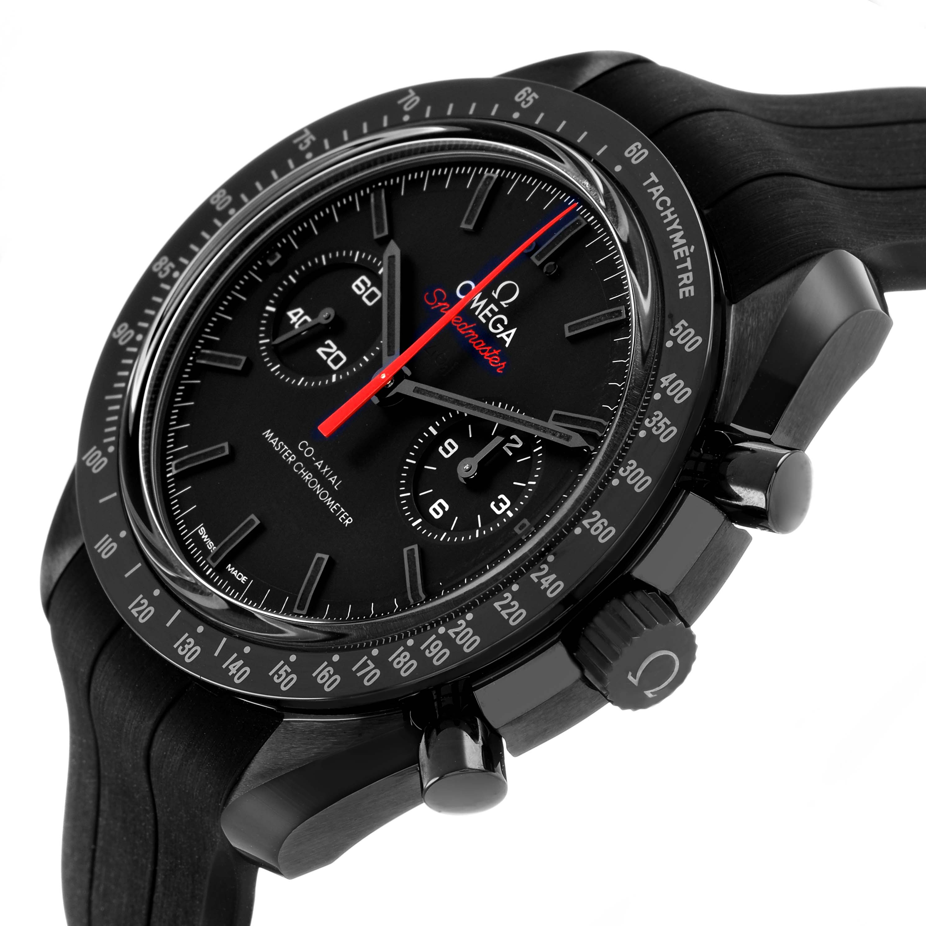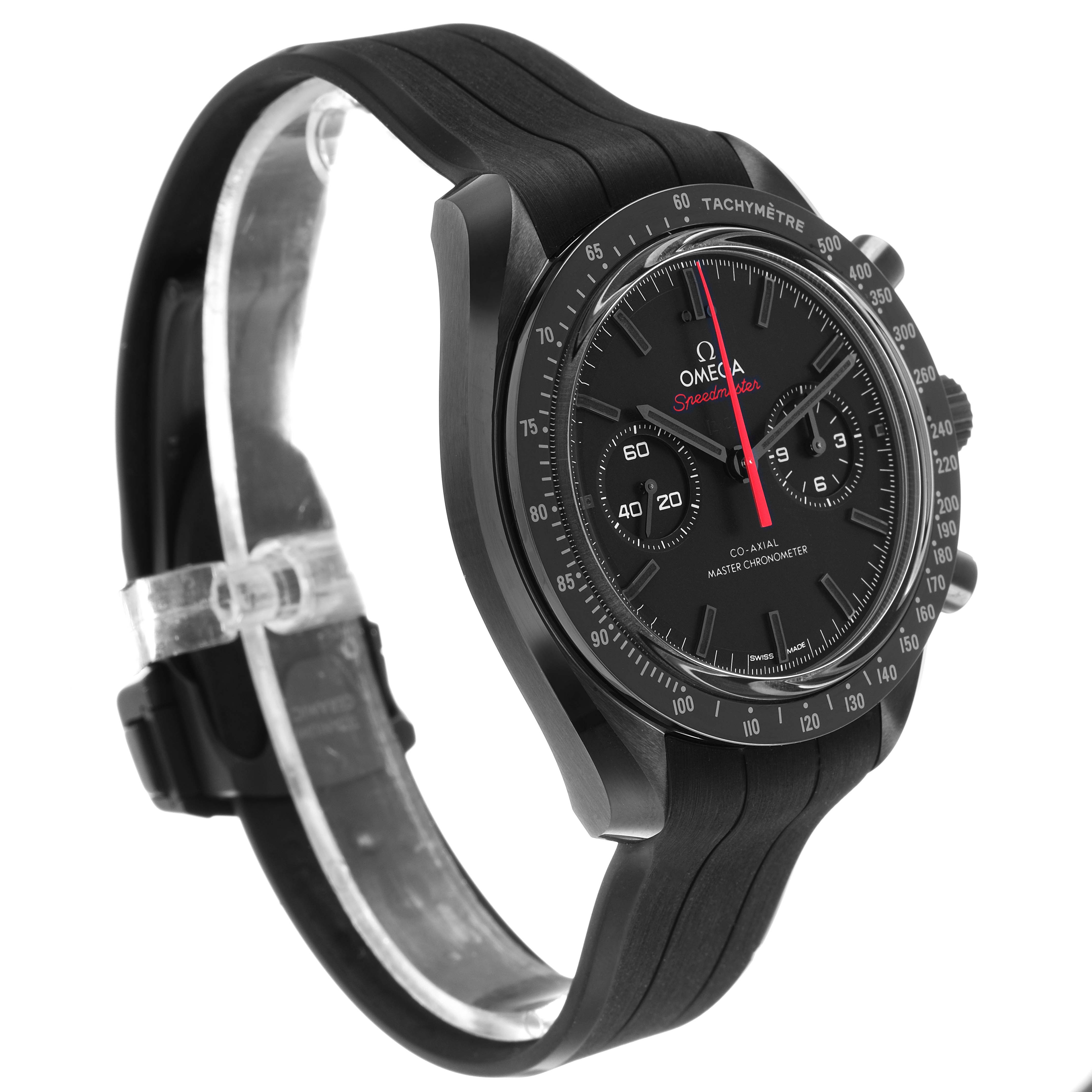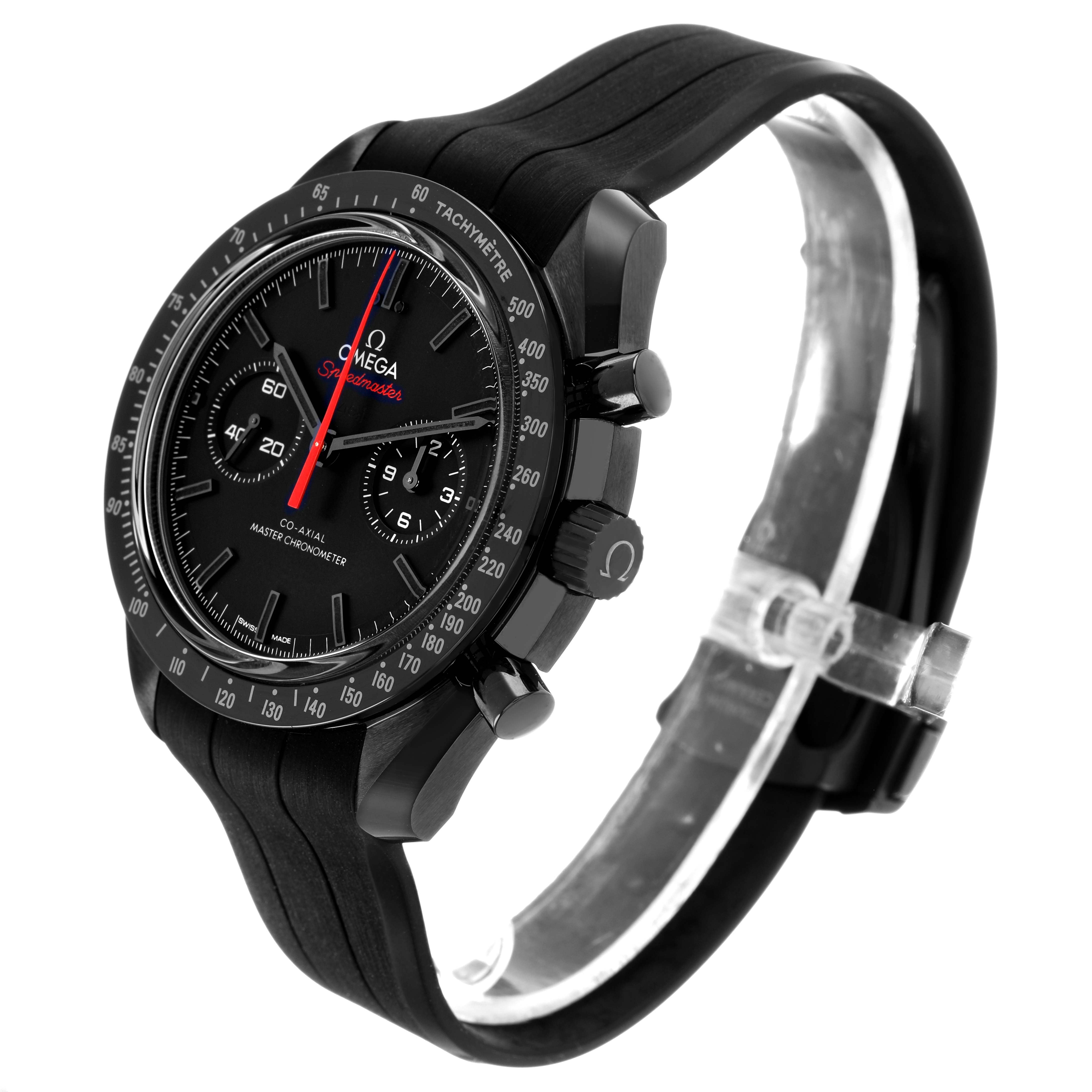 Omega Speedmaster Dark Side of the Moon Mens Watch 310.92.44.51.01.001 Unworn. Manual-winding Co-Axial Master Chronometer. 44.25 mm case in polished-brushed black ceramic. Transparent exhibition sapphire crystal caseback engraved 'Dark Side of the Moon'. Black ceramic polished bezel with tachymeter scale. Scratch resistant sapphire crystal. Ceramic dial with small-seconds display at 9H, and a 60-minute and 12-hour recorder at 3H. The hour and minute hands, as well as the bevelled indexes, are all blackened and filled with black Super-LumiNova (green emission). The central chronograph hand is red varnished. Black rubber strap with a lunar surface pattern on the underside. Double push-button black ceramic foldover clasp.