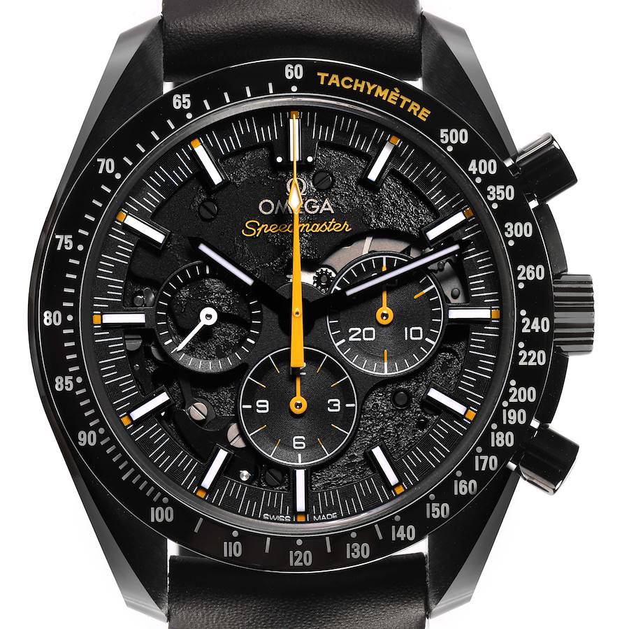 Omega Speedmaster Dark Side of the Moon Mens Watch 311.92.44.30.01.001 Box Card. Manual winding chronograph movement. Ceramic round case 44.25 mm in diameter. Exhibition transparent sapphire crystal case back with 'Dark Side of the Moon' and 'WE'LL SEE YOU ON THE OTHER SIDE' engravings. Ceramic bezel with matte chromium nitride tachymeter scale. Scratch resistant sapphire crystal. Black skeleton carbon dial with striking Moonwatch-style hands and 3 ceramic subdials to measure minutes, hours, and running seconds. Luminescent hands and hour markers. Yellow chronograph hands. Black leather strap with a double push-button deployant clasp.