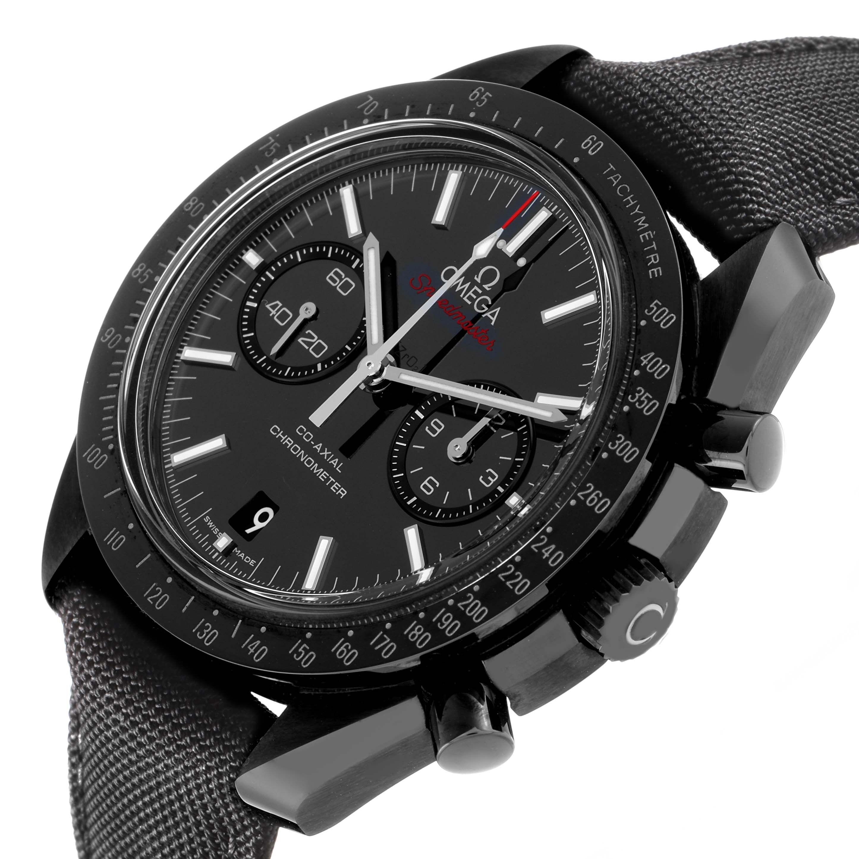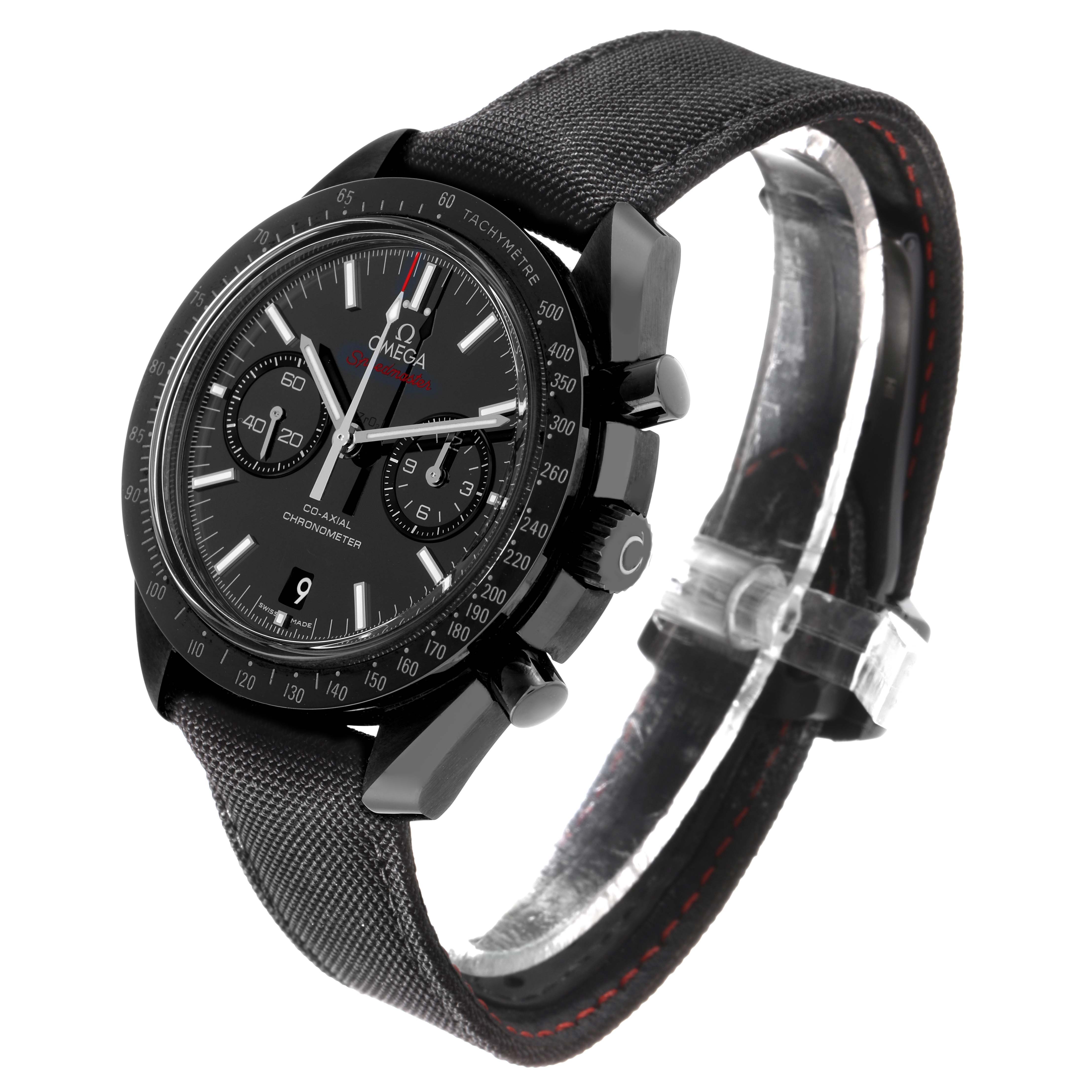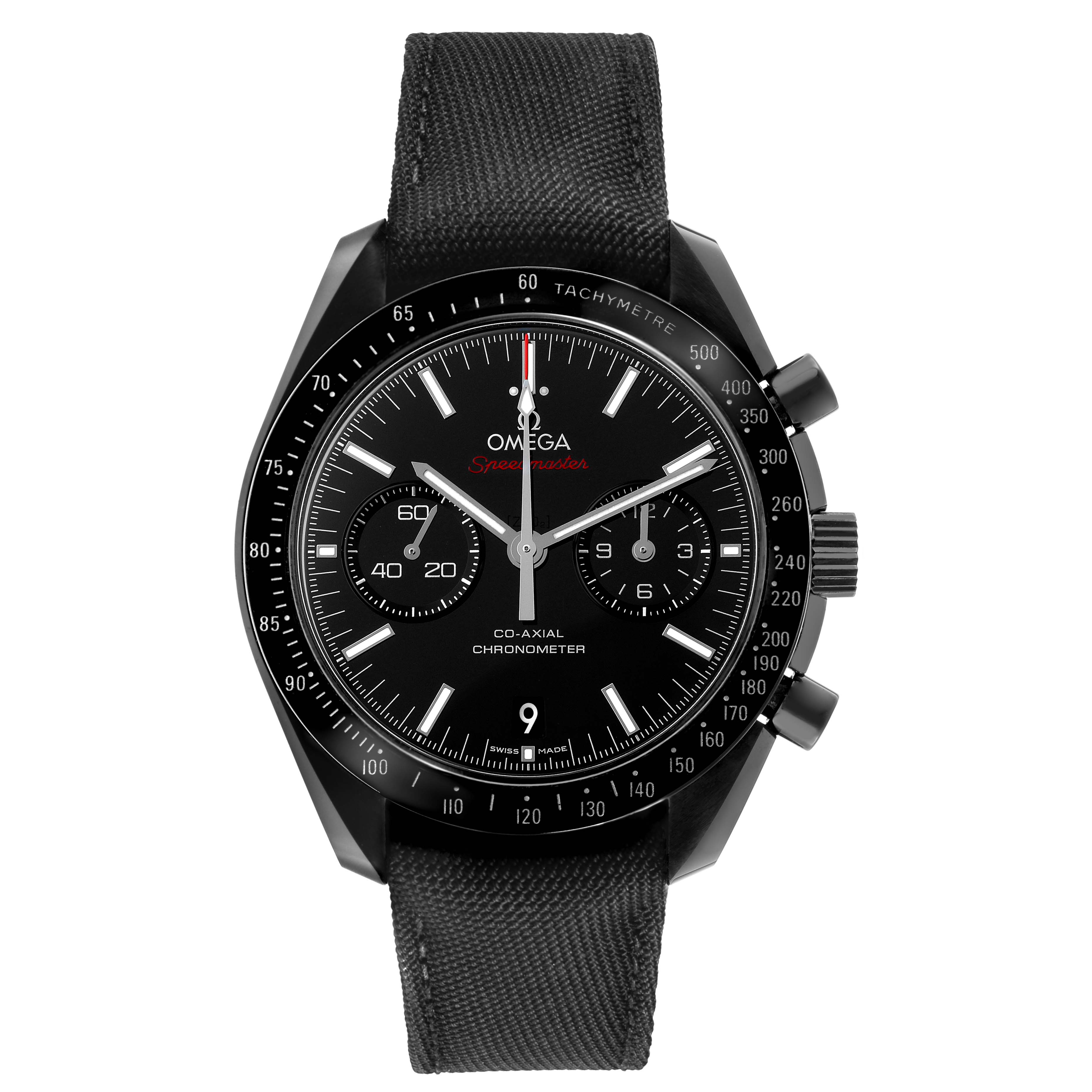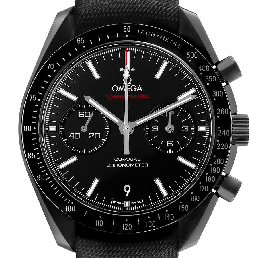 Omega Speedmaster Dark Side of the Moon Watch 311.92.44.51.01.007 Box Card. Automatic self-winding chronograph movement with column wheel mechanism and Co-Axial Escapement. Brushed and polished ceramic round case 44.25 mm in diameter. Transparent exhibition sapphire crystal caseback engraved 'Dark Side of the Moon'. Polished ceramic bezel with matte chromium nitride tachymeter scale. Scratch resistant sapphire crystal. Black zirconium oxide ceramic dial with striking Moonwatch-style hands and two ceramic subdials at 3 and 9 o'clock for 30 seconds and 12 hour. Luminescent hands and hour markers. Date display at 6 o'clock aperture. Black nylon fabric strap with a double push-button deployant clasp.