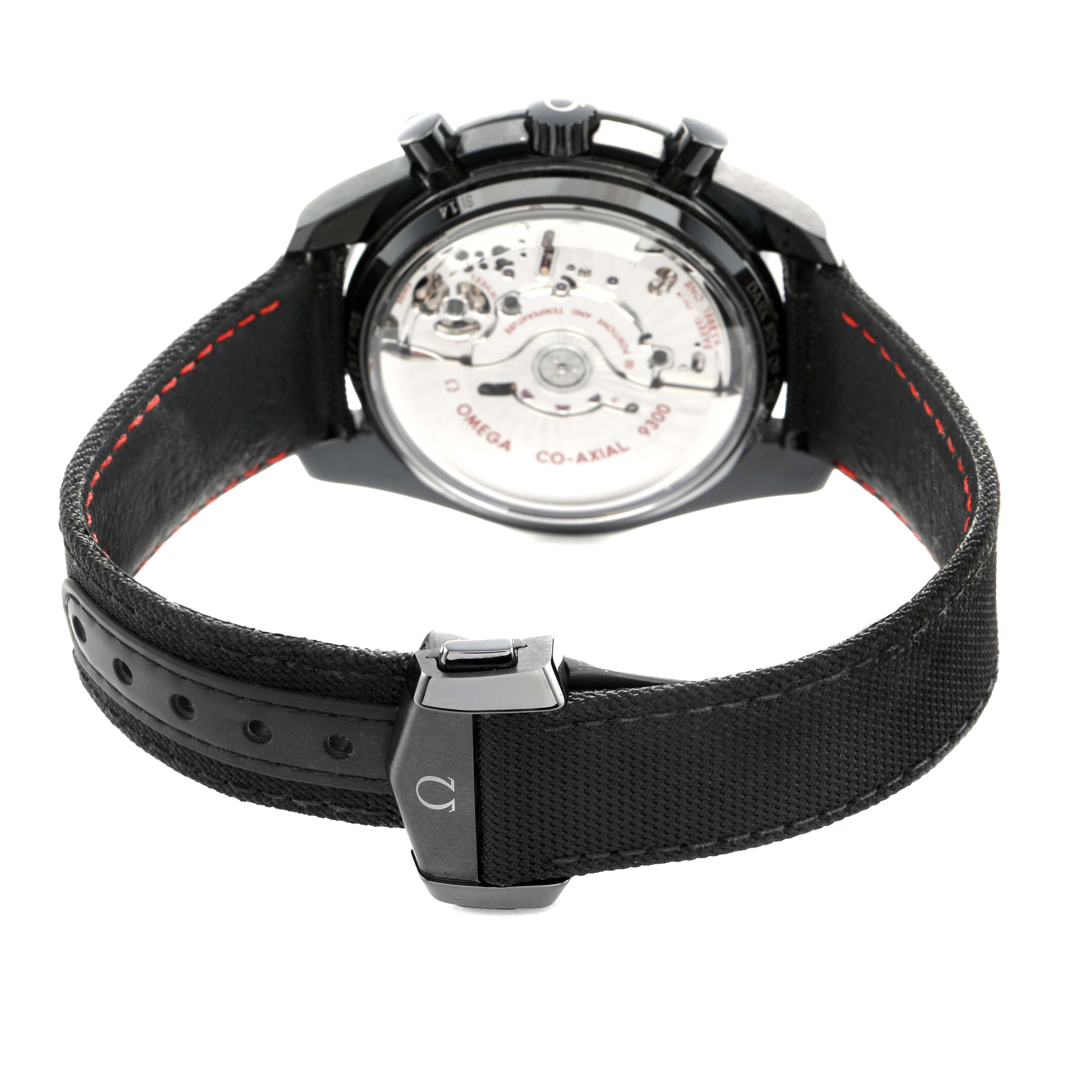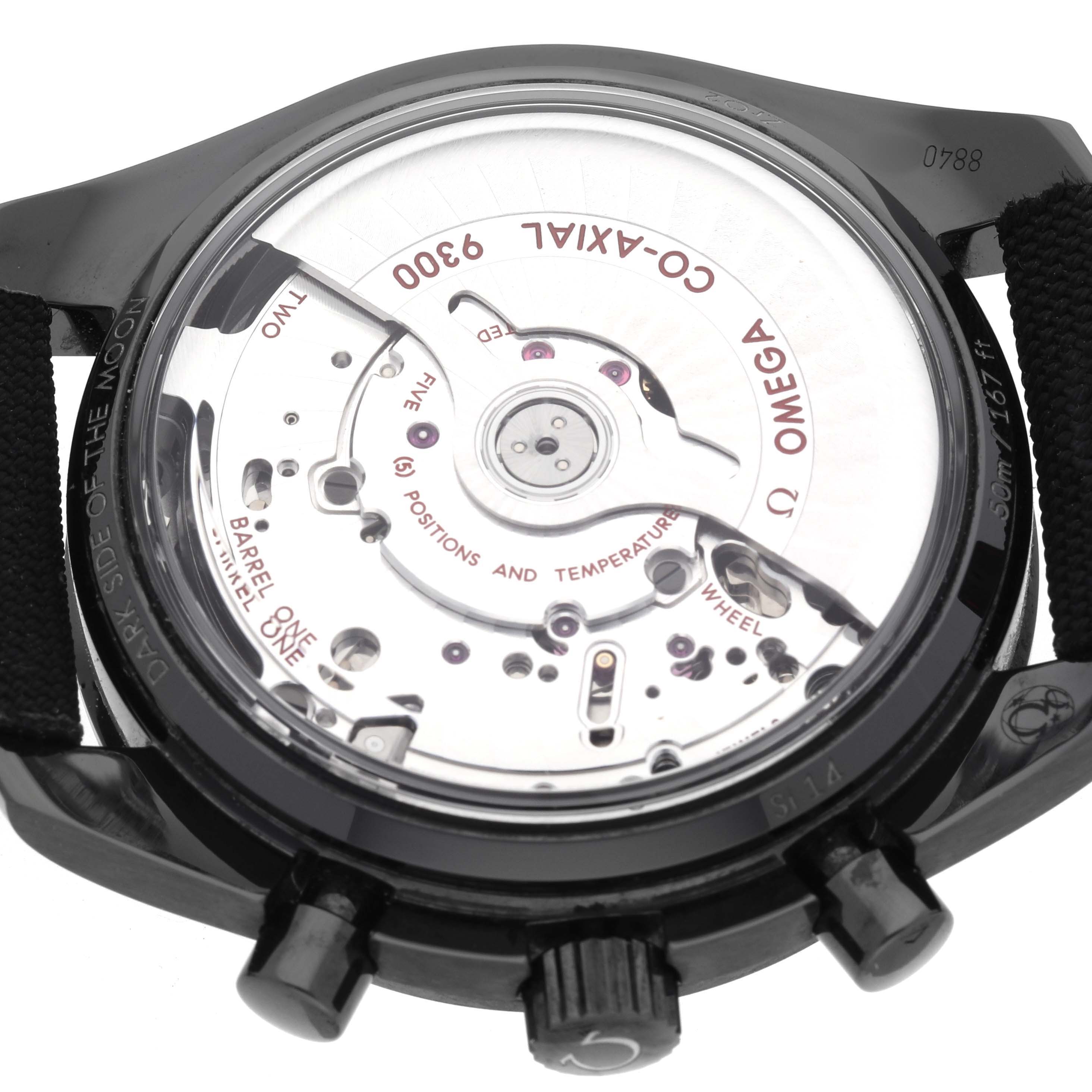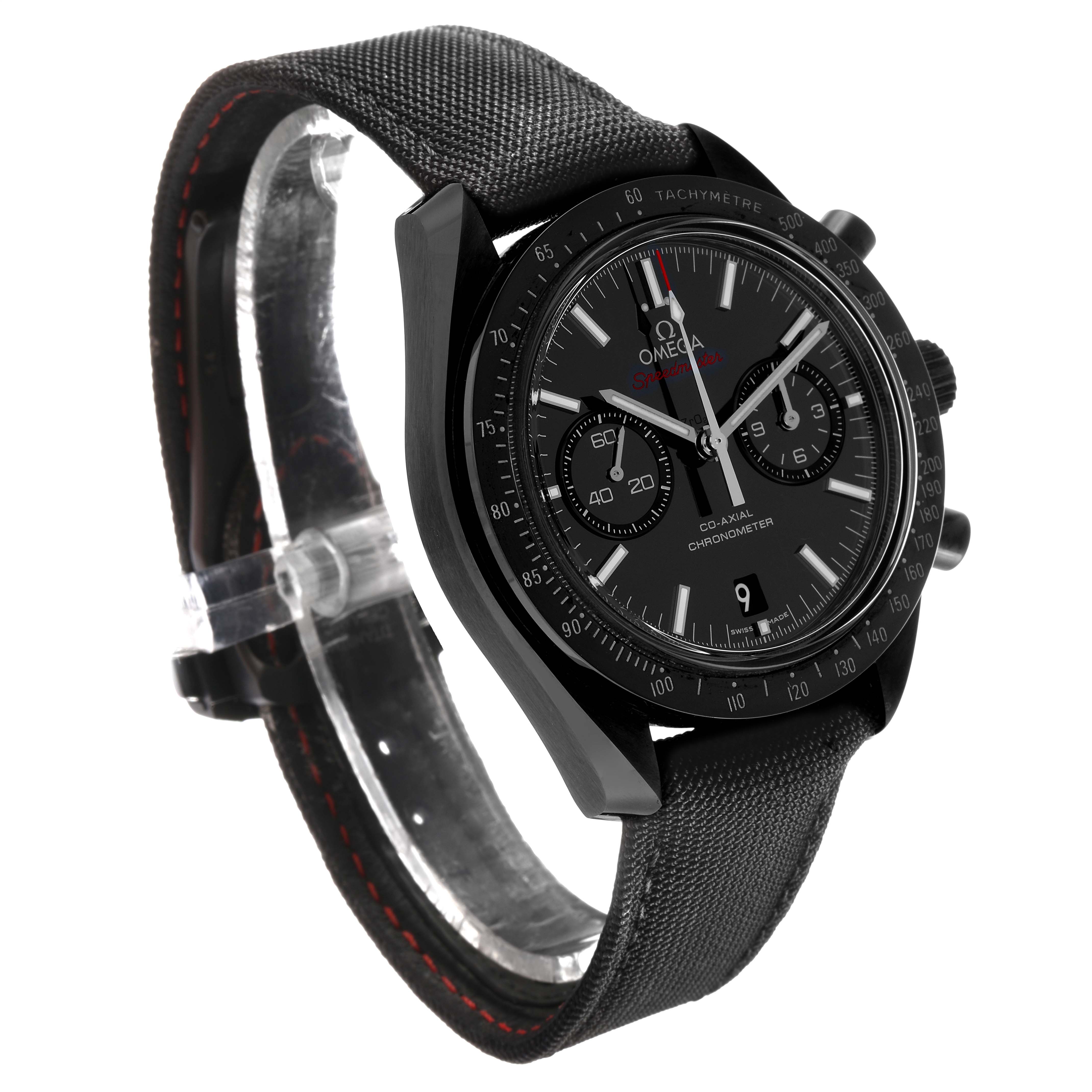 Omega Speedmaster Dark Side of the Moon Watch 311.92.44.51.01.007 Box Card. Automatic self-winding chronograph movement with column wheel mechanism and Co-Axial Escapement. Brushed and polished ceramic round case 44.25 mm in diameter. Transparent exhibition sapphire crystal caseback engraved 'Dark Side of the Moon'. Polished ceramic bezel with matte chromium nitride tachymeter scale. Scratch resistant sapphire crystal. Black zirconium oxide ceramic dial with striking Moonwatch-style hands and two ceramic subdials at 3 and 9 o'clock for 30 seconds and 12 hour. Luminescent hands and hour markers. Date display at 6 o'clock aperture. Black nylon fabric strap with a double push-button deployant clasp.