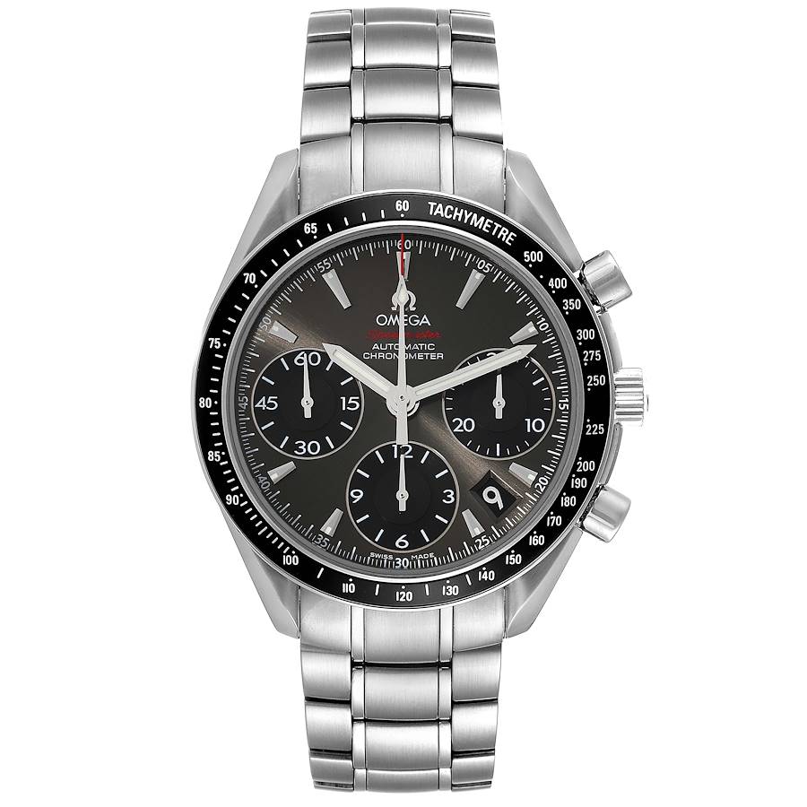 Omega Speedmaster Date Steel Grey Dial Mens Watch 323.30.40.40.06.001 Box Cards. Automatic self-winding chronograph movement. Stainless steel round case 40.0 mm in diameter. Two pushers operate the chronograph functions. Omega logo on the crown. Black ion-plated bezel engraved with the tachymeter scale. Scratch-resistant sapphire crystal with anti-reflective treatment inside. Grey dial with luminescent hands and index hour markers. Minute and 1/4-second stick markers around the outer rim. Date window between 4 and 5 o'clock. Three subdials -- running small seconds and the 30-minute and 12-hour chronograph registers. Stainless steel bracelet with a push-button folding clasp. Fits a 7 3/4" wrist.