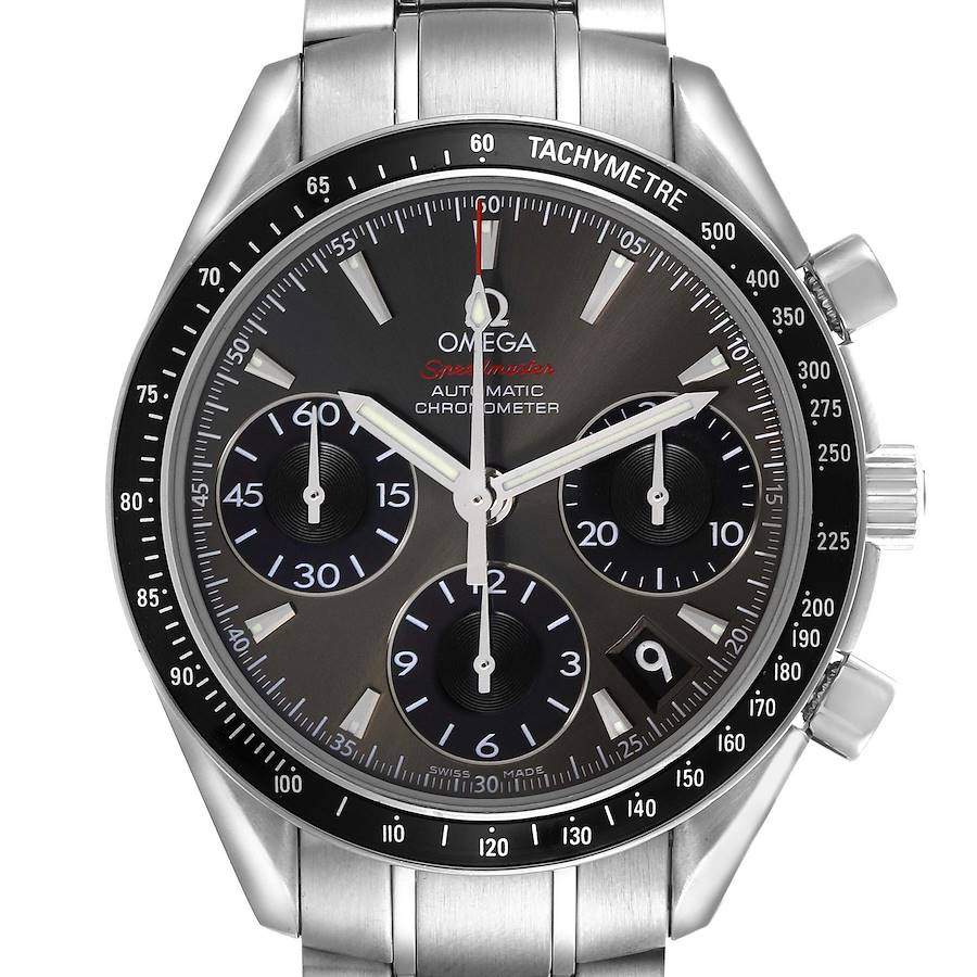 Omega Speedmaster Date Steel Grey Dial Mens Watch 323.30.40.40.06.001 Box Card. Automatic self-winding chronograph movement. Stainless steel round case 40.0 mm in diameter. Two pushers operate the chronograph functions. Omega logo on the crown. Black ion-plated bezel engraved with the tachymeter scale. Scratch-resistant sapphire crystal with anti-reflective treatment inside. Grey dial with luminescent hands and index hour markers. Minute and 1/4-second stick markers around the outer rim. Date window between 4 and 5 o'clock. Three subdials -- running small seconds and the 30-minute and 12-hour chronograph registers. Stainless steel bracelet with a push-button folding clasp. Fits a 7 1/4" wrist.
