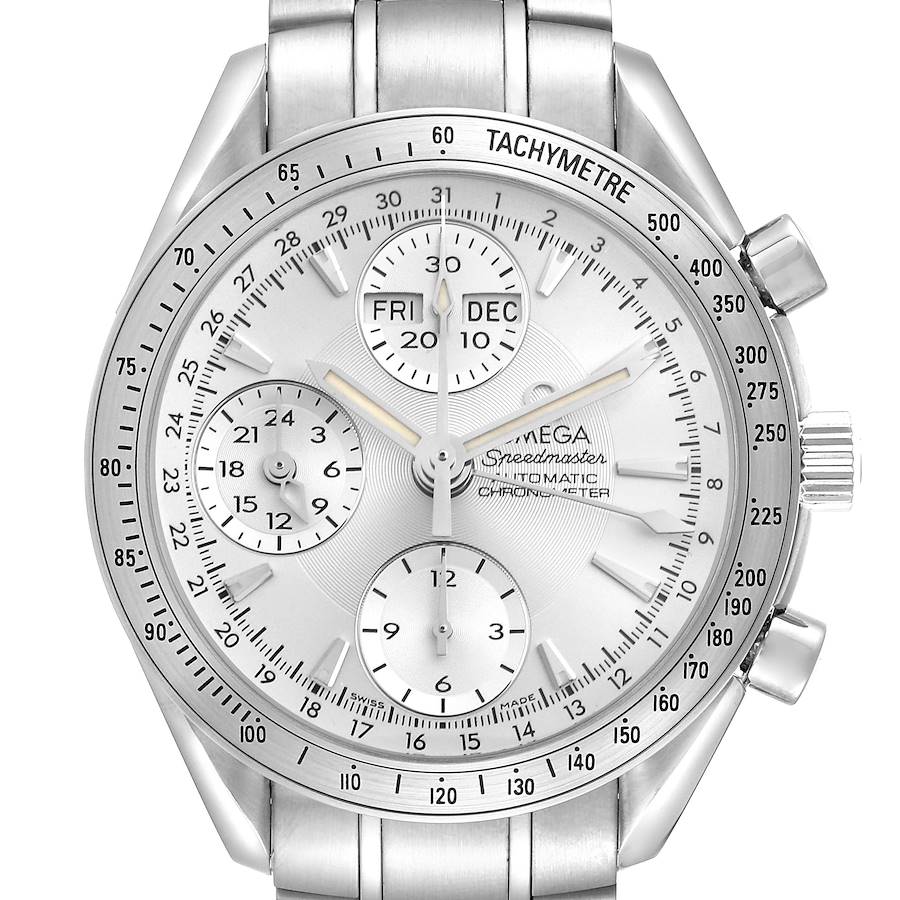 Omega Speedmaster Day Date Silver Dial Mens Watch 3221.30.00 Box Card. Automatic self-winding chronograph movement. Day, date and month indications. Stainless steel round case 40.0 mm in diameter. Two pushers operate the chronograph functions. Omega logo on the crown. Stainless steel bezel engraved with the tachymeter scale. Scratch-resistant sapphire crystal with anti-reflective treatment inside. Silver dial with index hour markers and baton hands. Three silver subdials -- 12-hours, small seconds register that shares a subdial with a 24-hour hand; the 30-minute register at 12 o'clock. Day of the week and month windows at 12 o'clock. Stainless steel bracelet with a push-button folding clasp. Fits an 8 1/4" wrist.