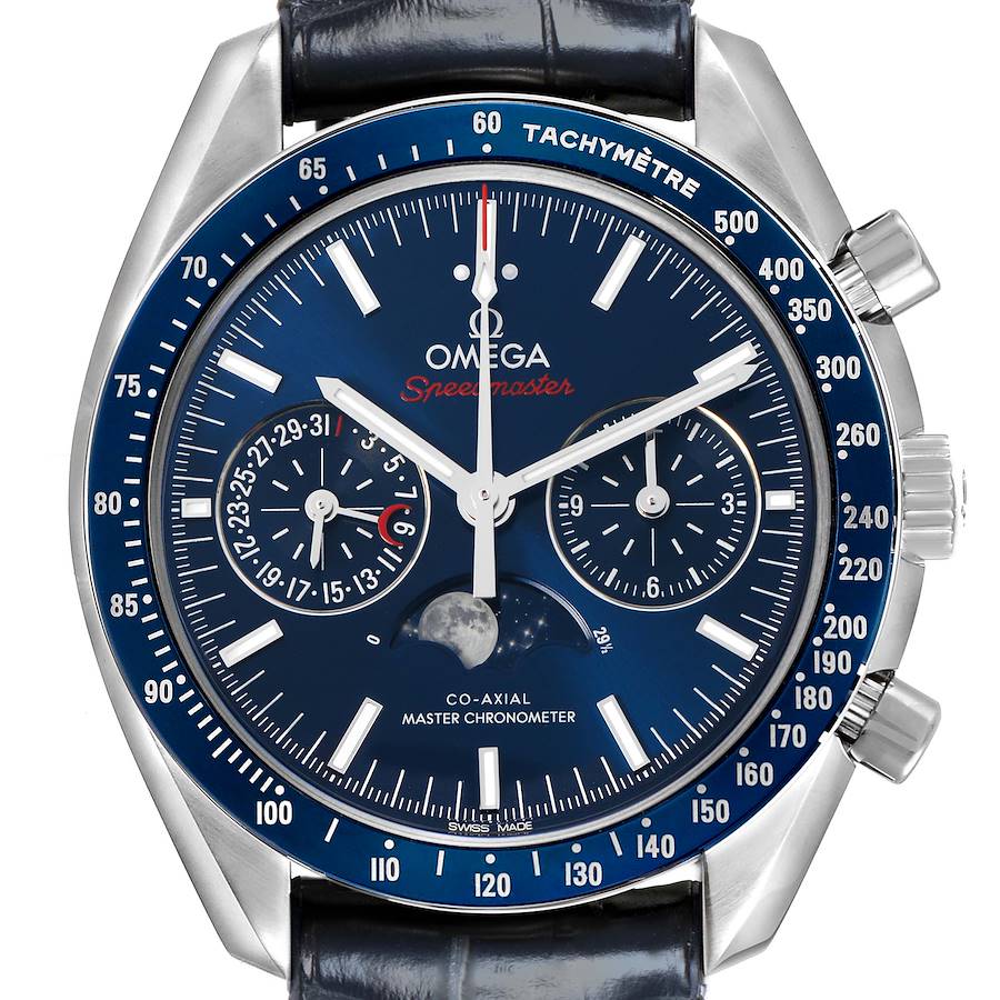 Omega Speedmaster Moonphase Chronograph Steel Mens Watch 304.33.44.52.03.001. Automatic self-winding chronograph movement with column wheel mechanism and Co-Axial Escapement. Silicon balance-spring on free sprung-balance, 2 barrels mounted in series, automatic winding in both directions to reduce winding time. Rhodium plated finish with exclusive Geneva waves in arabesque. Stainless steel case 44.25 mm in diameter. Transparent exhibition sapphire crystal case back. Two pushers operate the chronograph functions. Omega logo on a crown. Blue ceramic bezel with tachymeter scale. Scratch resistant sapphire crystal with anti-reflective treatment on both sides. Blue dial with luminous indexes and hands. Two Chronograph subdials -- date/small seconds and a 12 hour/60 minute. Moonphase display at 6 o'clock. Blue leather strap with stainless steel double push deployant clasp.