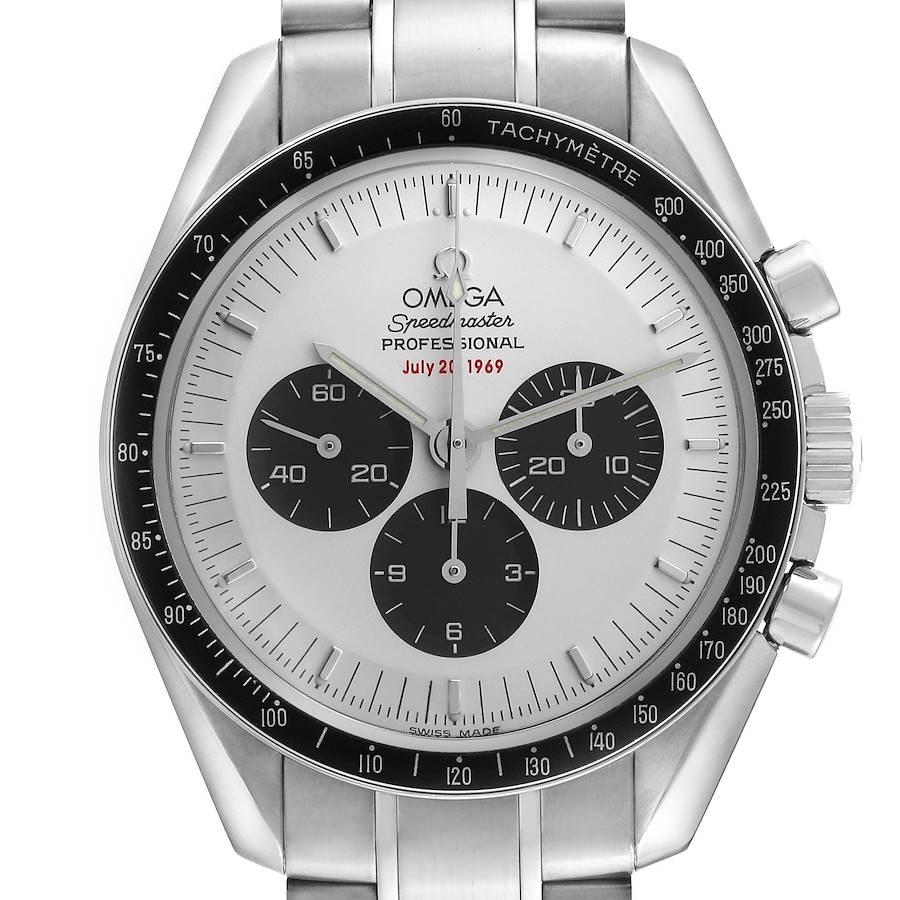 Omega Speedmaster Moonwatch Apollo 11 35th Anniversary LE Steel Watch 3569.31.00. Manual winding chronograph movement. Stainless steel round case 42 mm in diameter. Omega logo on the crown. Color version of the Apollo 11 mission patch on caseback along with the words Apollo 11 35th anniversary Limited Edition and the edition number. Black bezel with tachymeter scale. Scratch resistant domed hesalite crystal. Silver dial with luminous baton hands and hour markers. Three engine-turned subdials - running small seconds, 30 minutes, and 12 hours. Stainless steel bracelet with push button deployant clasp. Fits 7.5" wrist.
