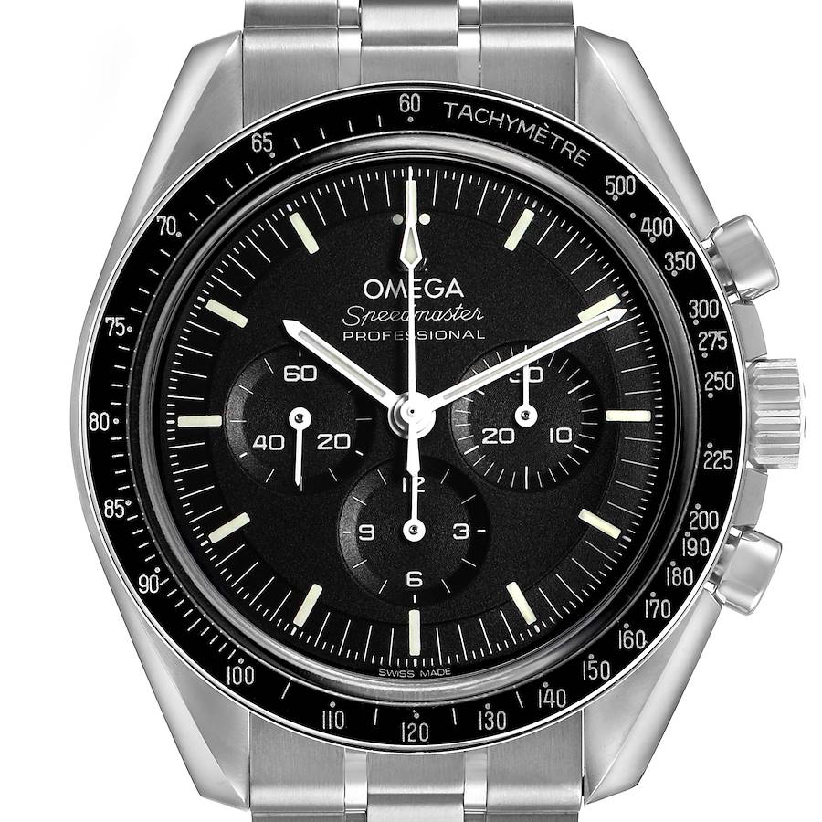 Omega Speedmaster Moonwatch Professional Mens Watch 310.30.42.50.01.002 Box Card. Manual winding chronograph movement. Stainless steel round case 42.0 mm in diameter. Omega logo on the crown. Transparent exhibition sapphire crystal case back. Two pushers operate the chronograph functions. Stainless steel bezel with an anodized aluminum bezel ring showing the tachymetre scale. Scratch resistant sapphire crystal. Black dial with luminescent sword-shaped hands and baton hour markers. Three engine-turned subdials -- running small seconds and the 30-minute and 12-hour chronograph registers. Outer minute and 1/3-second stick markers. Stainless steel bracelet with a folding clasp with double security pushers. Fits up to an 8 1/4" wrist.