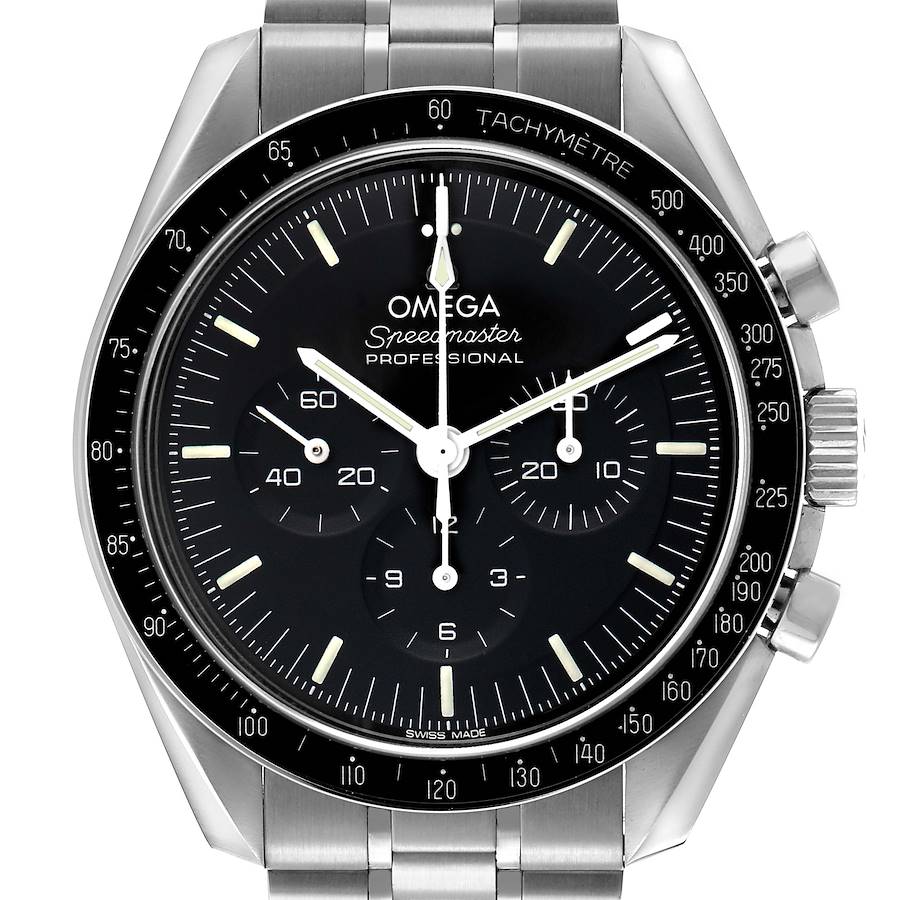 Omega Speedmaster Moonwatch Steel Mens Watch 310.30.42.50.01.002 Box Card. Manual winding chronograph movement. Stainless steel round case 42.0 mm in diameter. Omega logo on the crown. Transparent exhibition sapphire crystal case back. Two pushers operate the chronograph functions. Stainless steel bezel with an anodized aluminum bezel ring showing the tachymetre scale. Scratch resistant sapphire crystal. Black dial with luminescent sword-shaped hands and baton hour markers. Three engine-turned subdials -- running small seconds and the 30-minute and 12-hour chronograph registers. Outer minute and 1/3-second stick markers. Stainless steel bracelet with a folding clasp with double security pushers. Fits up to an 8.5" wrist.