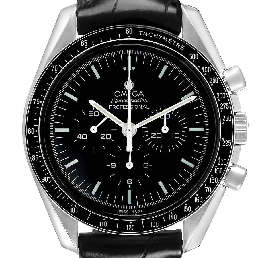 Omega Speedmaster Moonwatch Steel Mens Watch 311.30.42.30.01.005. Manual winding chronograph movement. Stainless steel round case 42.0 mm in diameter. Two pushers operate the chronograph functions. Omega logo on the crown. Solid caseback contains the text" FLIGHT-QUALIFIED BY NASA FOR ALL MANNED SPACE MISSIONS", "THE FIRST WATCH WORN ON THE MOON', and "PROFESSIONAL MOONWATCH". Stainless steel black bezel with the tachymeter scale. Hesalite acrylic crystal. Black dial with white indexes and three engine-turned subdials -- 30 minute, 12 hour, and constant seconds. Luminescent baton hands and hour markers. Black leather strap with double push button deployant clasp.
