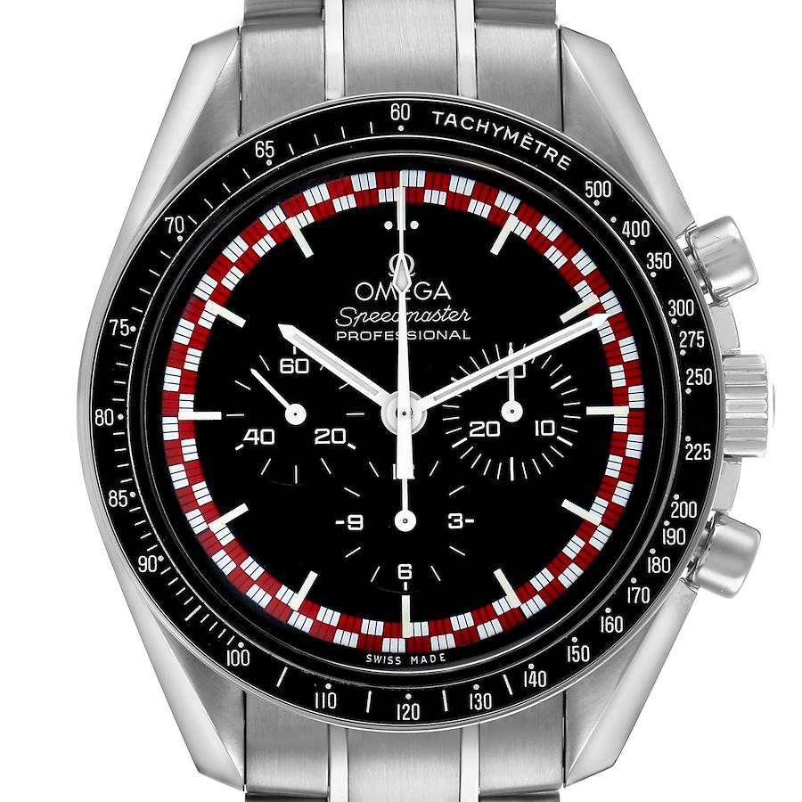 Omega Speedmaster Professional Tin Tin Moonwatch 311.30.42.30.01.004 Box Card. Manual winding chronograph movement with a 48-hour power reserve. Stainless steel round case 42.0 mm in diameter. Two pushers operate the chronograph function. Omega logo on the crown. "The First Watch Worn On The Moon" and "Flight Qualified by NASA For All Manned Space Missions" engraved in red on the caseback. Stainless steel black bezel with a tachymetre scale. Hesalite crystal. Black dial with white luminescent-inlayed index hour markers and baton hands. White arrow-tipped central chronograph hand. Three engine-turned subdials -- 30 minutes register at 3 o'clock, 12 hour register at 6 o'clock, and a small seconds register at 9 o'clock. Red and white checker patterned chapter ring. Stainless steel bracelet with a double push-button deployant clasp. Fits an 8 1/4" wrist.