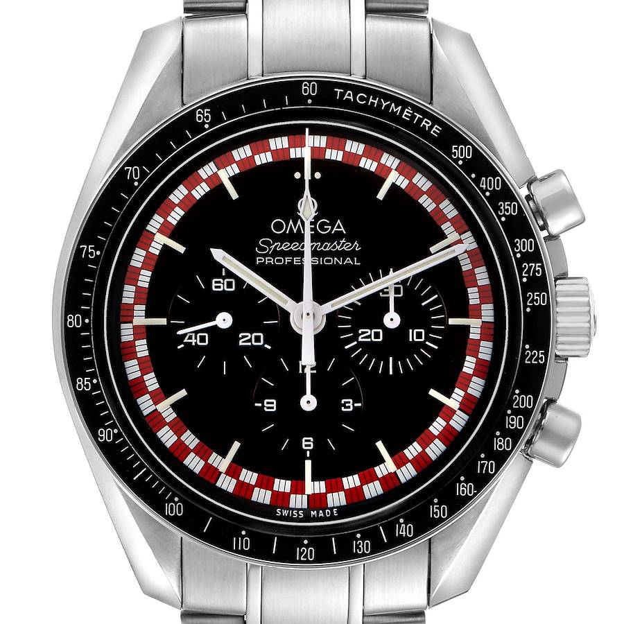 Omega Speedmaster Professional Tin Tin Moonwatch Steel 311.30.42.30.01.004 Card. Manual winding chronograph movement with a 48-hour power reserve. Stainless steel round case 42.0 mm in diameter. Two pushers operate the chronograph function. Omega logo on the crown. "The First Watch Worn On The Moon" and "Flight Qualified by NASA For All Manned Space Missions" engraved in red on the caseback. Stainless steel black bezel with a tachymetre scale. Hesalite crystal. Black dial with white luminescent-inlayed index hour markers and baton hands. White arrow-tipped central chronograph hand. Three engine-turned subdials -- 30 minutes register at 3 o'clock, 12 hour register at 6 o'clock, and a small seconds register at 9 o'clock. Red and white checker patterned chapter ring. Stainless steel bracelet with a double push-button deployant clasp. Fits an 8 1/4" wrist.