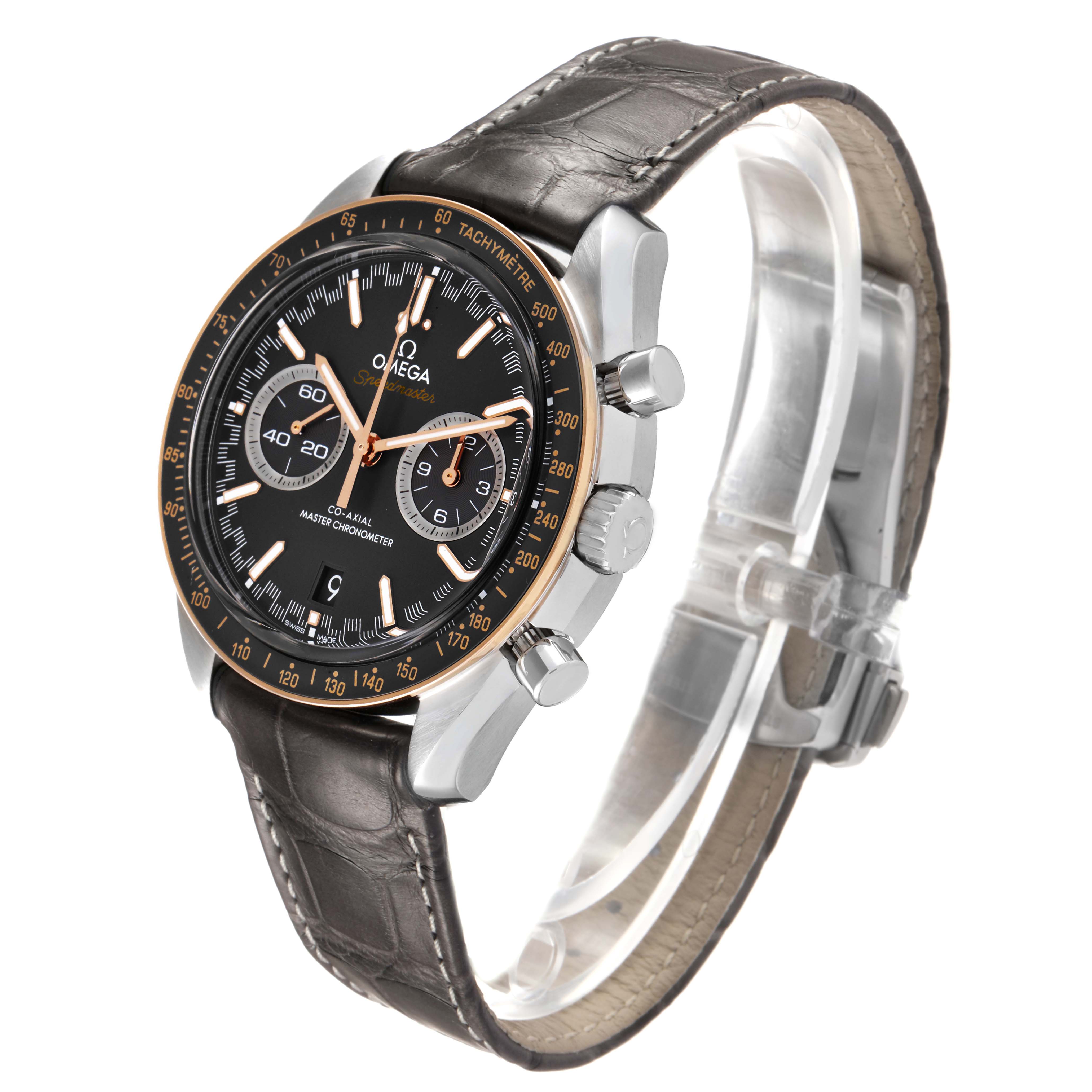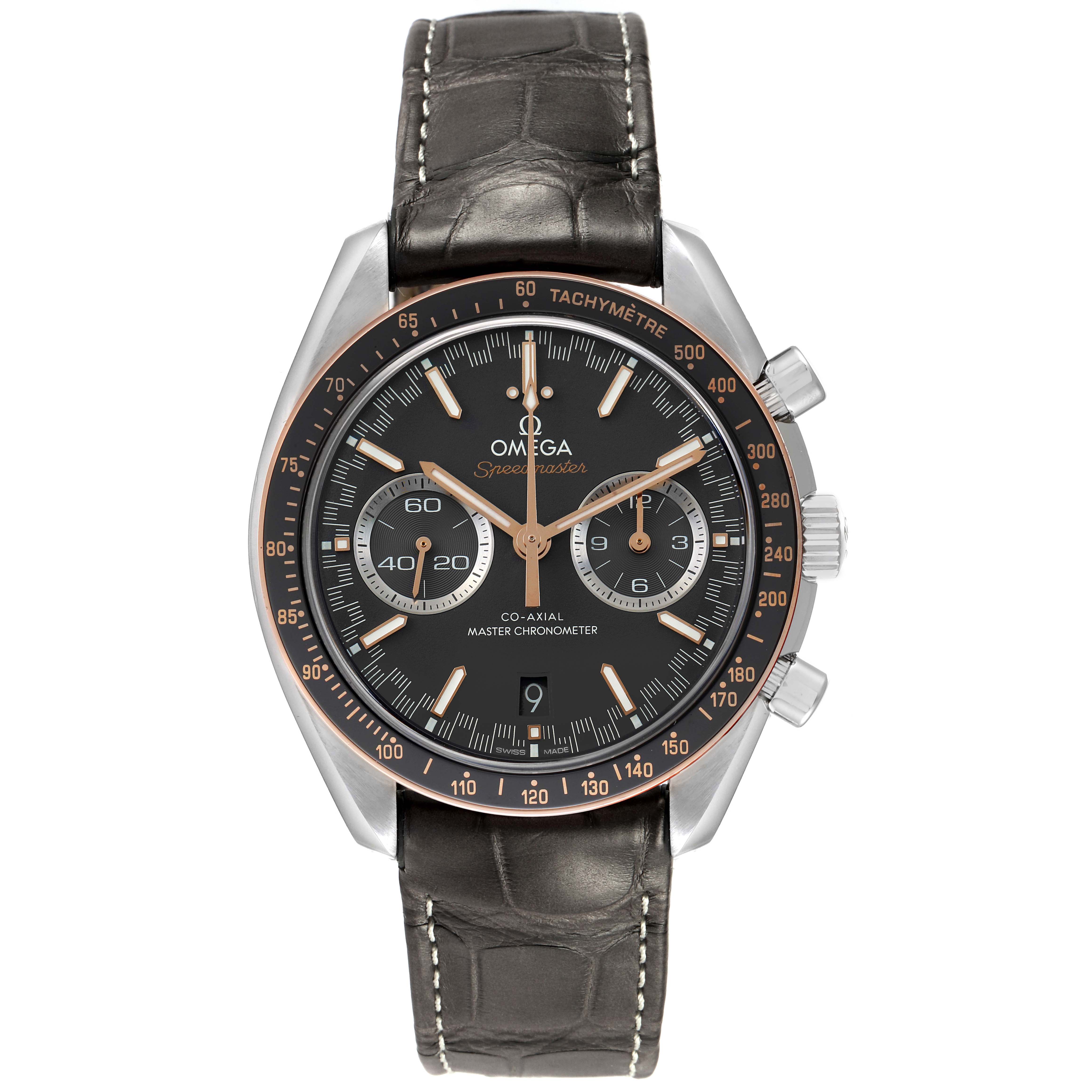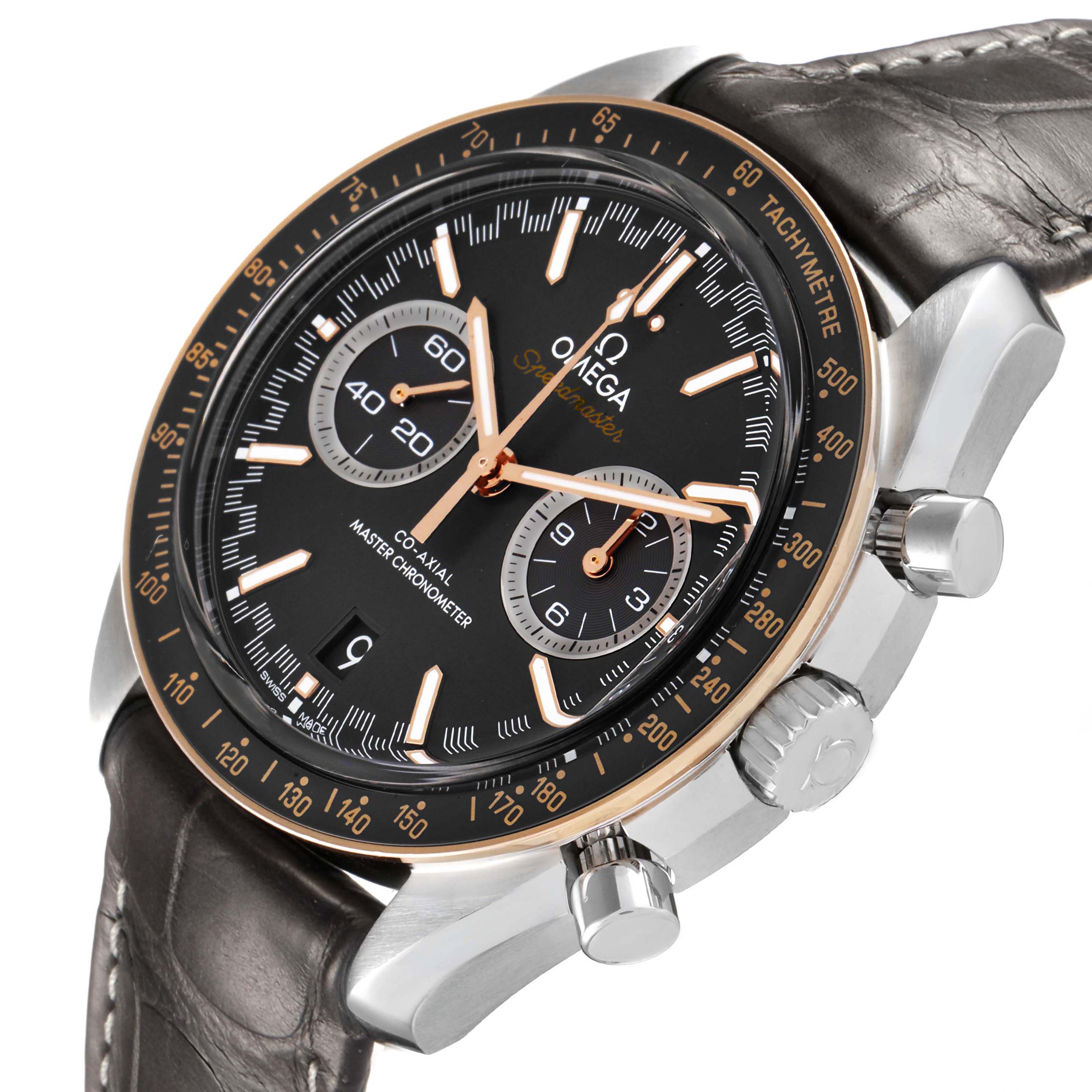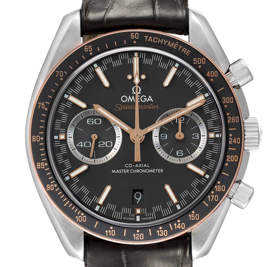 Omega Speedmaster Racing Steel Rose Gold Watch 329.23.44.51.06.001 Box Cards. Automatic self-winding chronograph movement with column wheel mechanism and Co-Axial Escapement for greater precision, stability and durability of the movement. Silicon balance-spring on free sprung-balance, 2 barrels mounted in series, automatic winding in both directions to reduce winding time. Rhodium plated finish with exclusive Geneva waves in arabesque. 60 hours power reserve. Caliber 9900. Brushed and polished stainless steel round case 44.25 mm in diameter. Exhibition case back. 18k sedna gold bezel with matte chromium nitride tachymeter scale. Scratch resistant sapphire crystal. Grey racing dial with striking Moonwatch-style hands and two subdials at 3 and 9 o'clock for 30 seconds and 12 hour. Luminiscent hands and hour markers. Date display at 6 o'clock aperture. Grey leather strap with double push-button deployant buckle.
