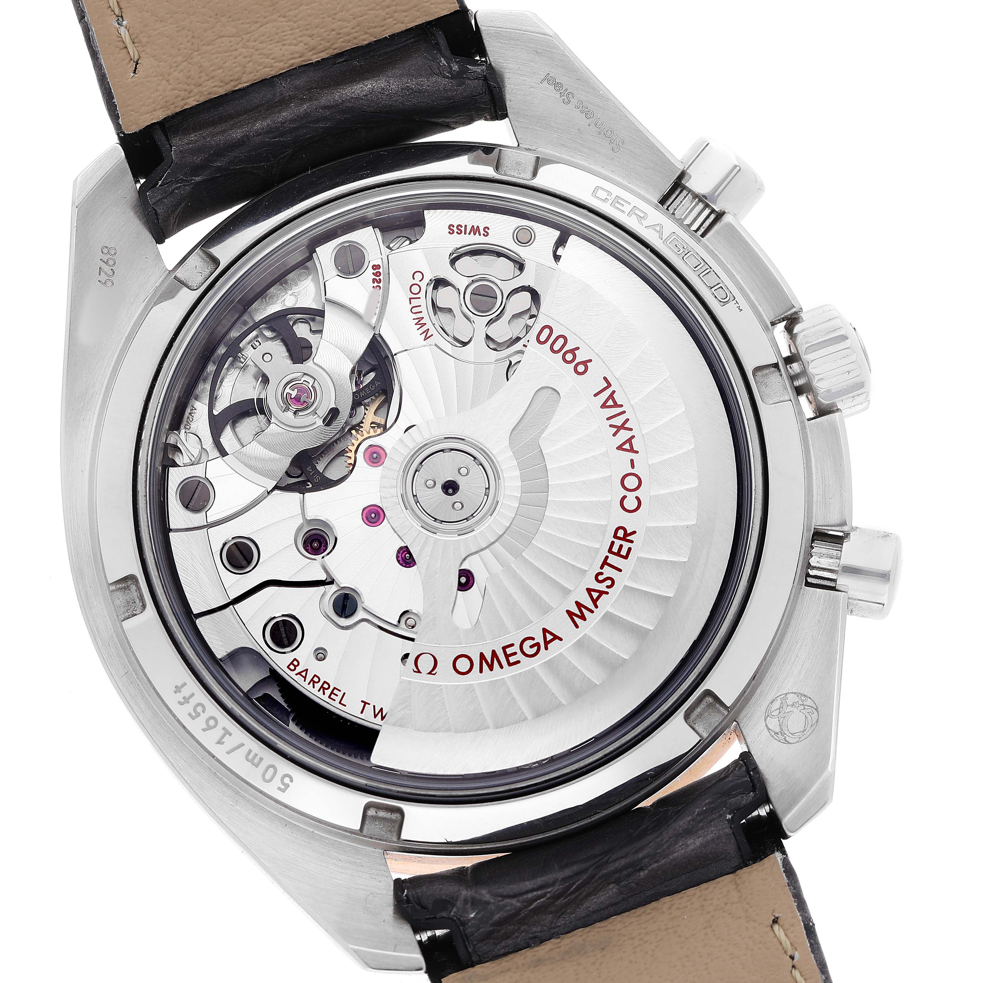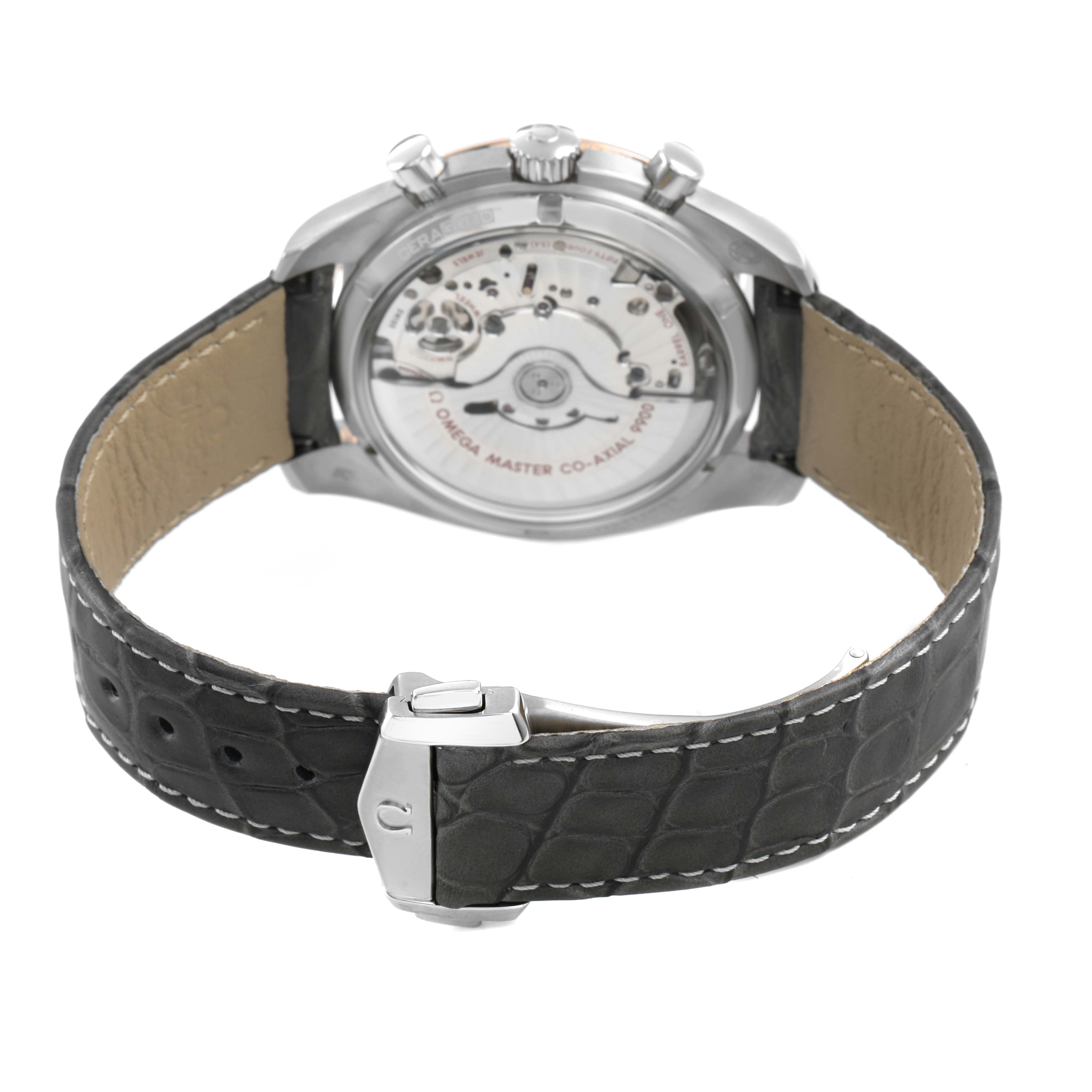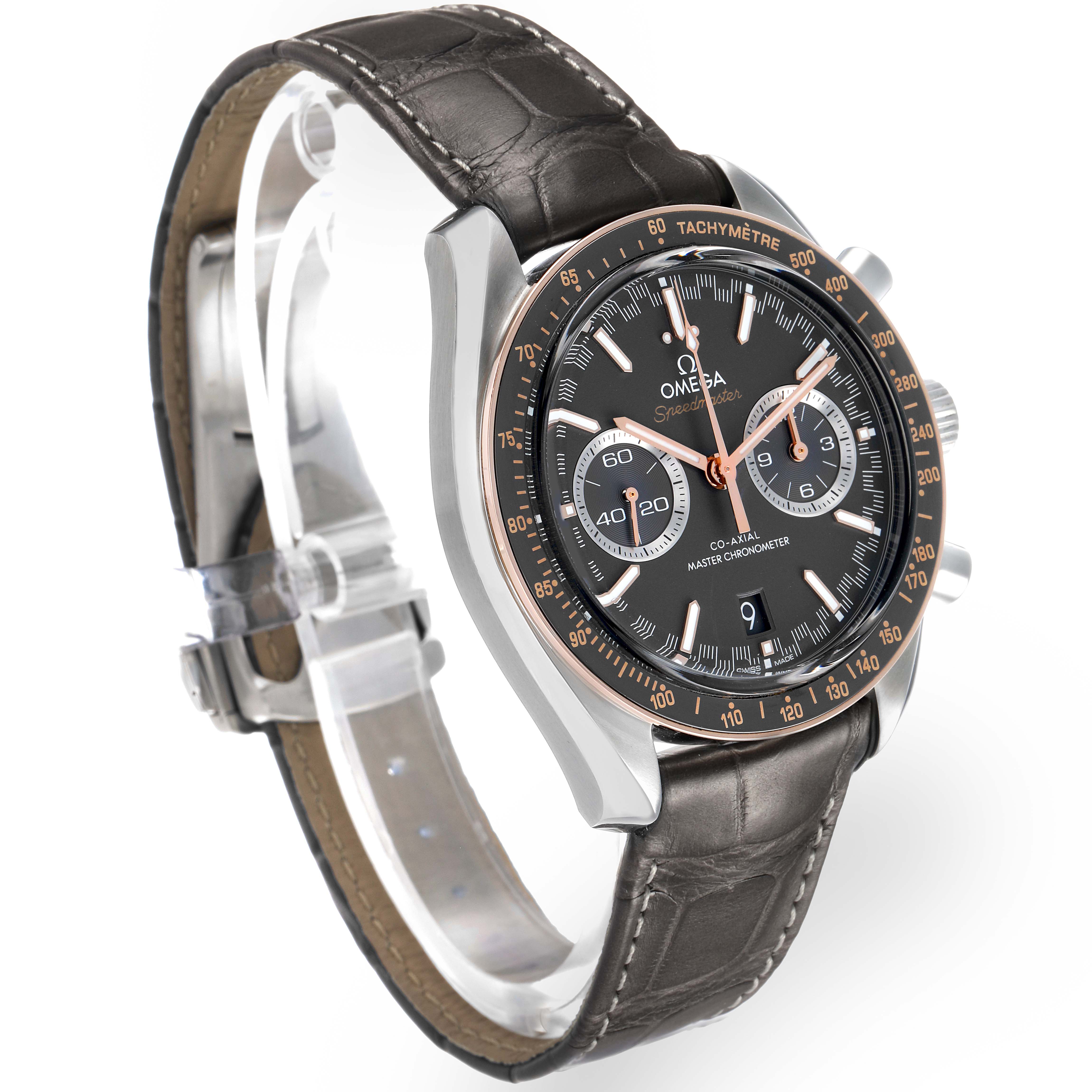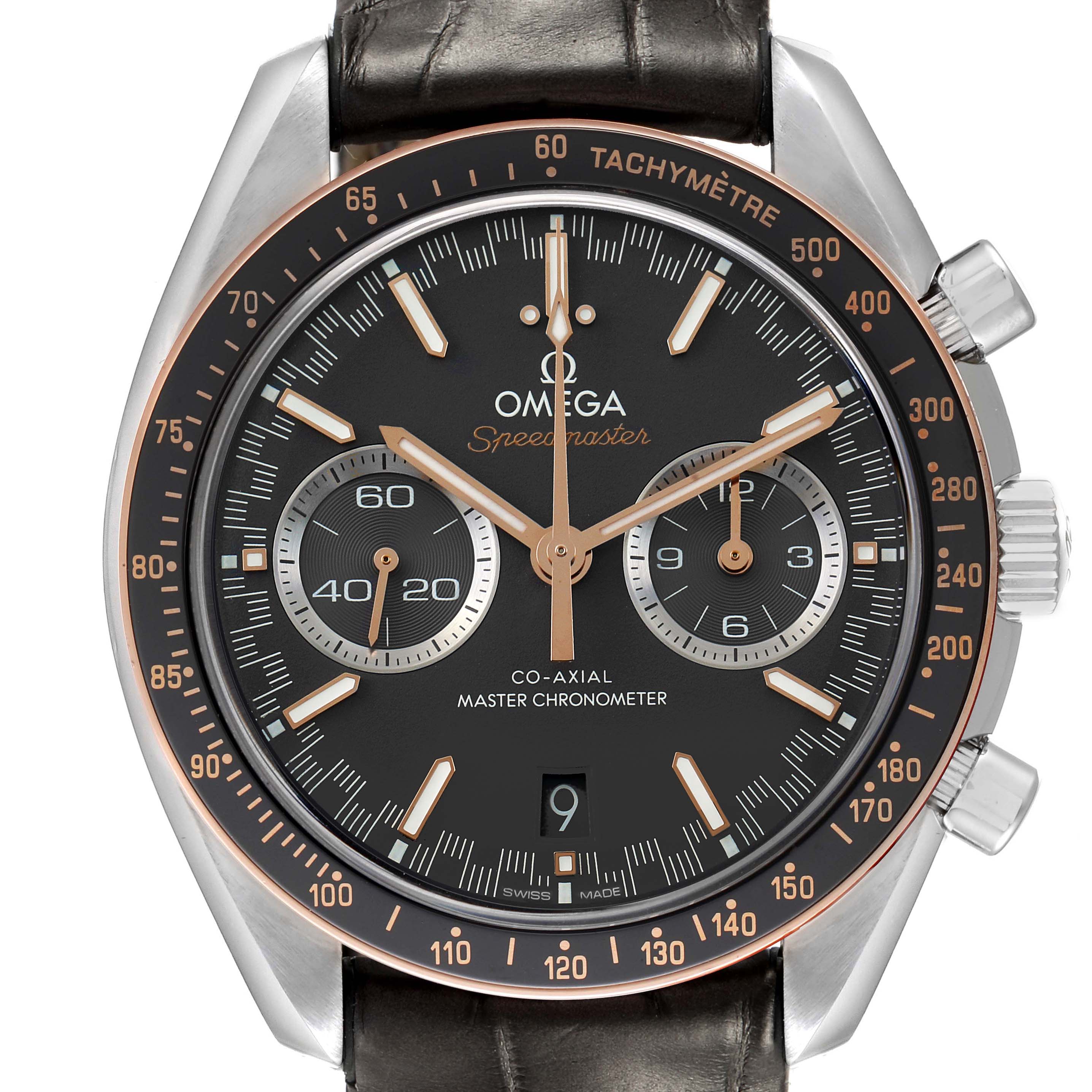 Omega Speedmaster Racing Steel Rose Gold Watch 329.23.44.51.06.001 Box Cards. Automatic self-winding chronograph movement with column wheel mechanism and Co-Axial Escapement for greater precision, stability and durability of the movement. Silicon balance-spring on free sprung-balance, 2 barrels mounted in series, automatic winding in both directions to reduce winding time. Rhodium plated finish with exclusive Geneva waves in arabesque. 60 hours power reserve. Caliber 9900. Brushed and polished stainless steel round case 44.25 mm in diameter. Exhibition case back. 18k sedna gold bezel with matte chromium nitride tachymeter scale. Scratch resistant sapphire crystal. Grey racing dial with striking Moonwatch-style hands and two subdials at 3 and 9 o'clock for 30 seconds and 12 hour. Luminiscent hands and hour markers. Date display at 6 o'clock aperture. Grey leather strap with double push-button deployant buckle.