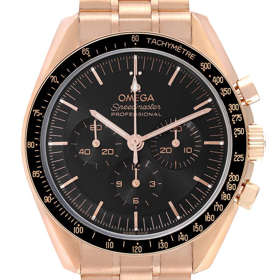 Omega Speedmaster Rose Gold Mens Moonwatch 310.60.42.50.01.001 Box Card. Manual-winding chronograph movement. 18k rose gold round case 42.0 mm in diameter. Exhibition transparent sapphire crystal case back. 18k rose gold bezel with tachymeter function. Scratch resistant sapphire crystal. Black dial with rose gold index hour markers. Luminiscent hands and hour markers. Three chronograph sub-dials -- 12 hours, 30 minutes and small seconds. 18k rose gold bracelet with push button deployant buckle. Fits 8 1/4" wrist.
