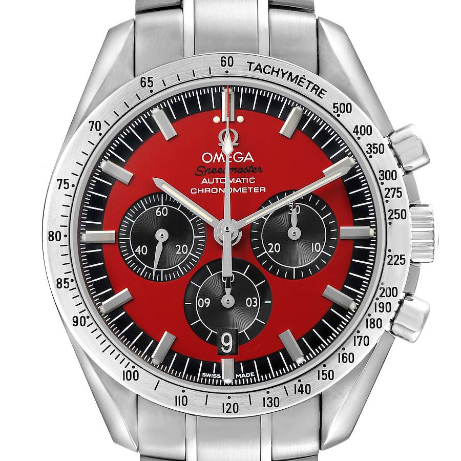 Omega Speedmaster Schumacher Legend Red LE Steel Mens Watch 3506.61.00 Card. Automatic self-winding chronograph movement. Stainless steel round case 42.0 mm in diameter. Caliber 3301. Stainless steel bezel engraved with the tachymeter scale. Scratch-resistant sapphire crystal. Red dial with luminescent sword-shaped hands and baton hour markers. Minute and 1/4-second stick markers. Date calendar at the 6 o'clock aperture. Three black subdials -- running small seconds and the 30-minute and 12-hour chronograph registers. Stainless steel bracelet with a push-button folding clasp. Fits a 7 3/4" wrist.