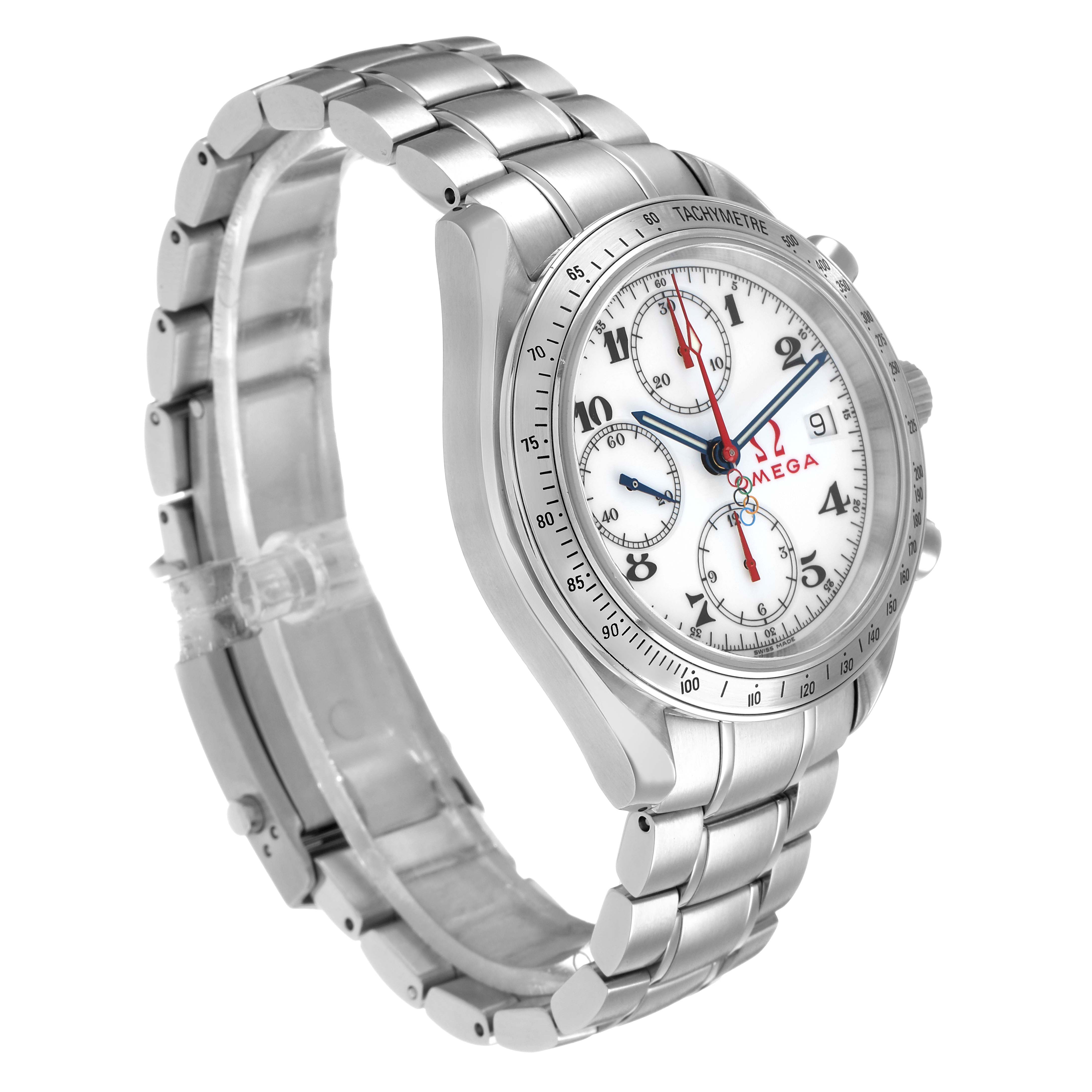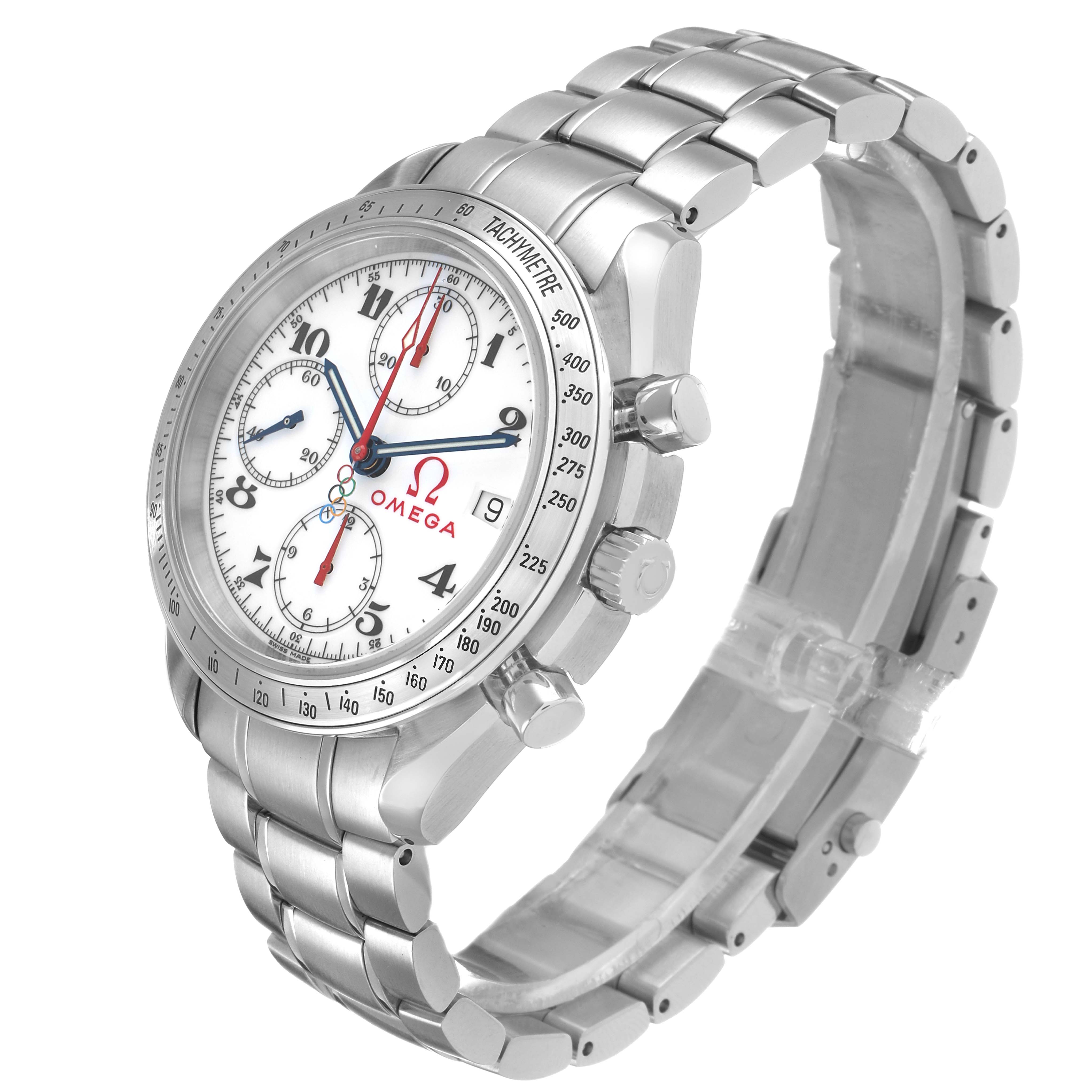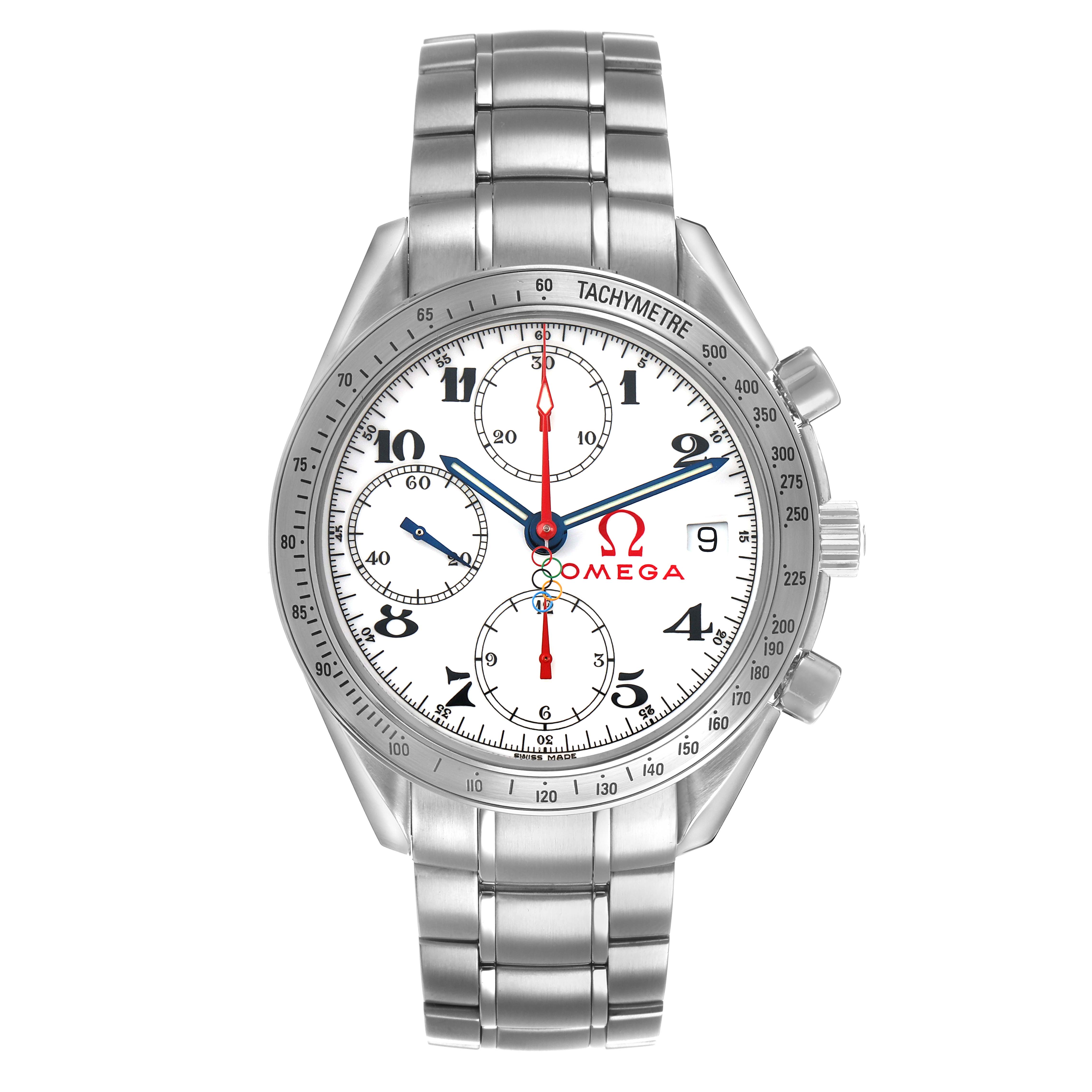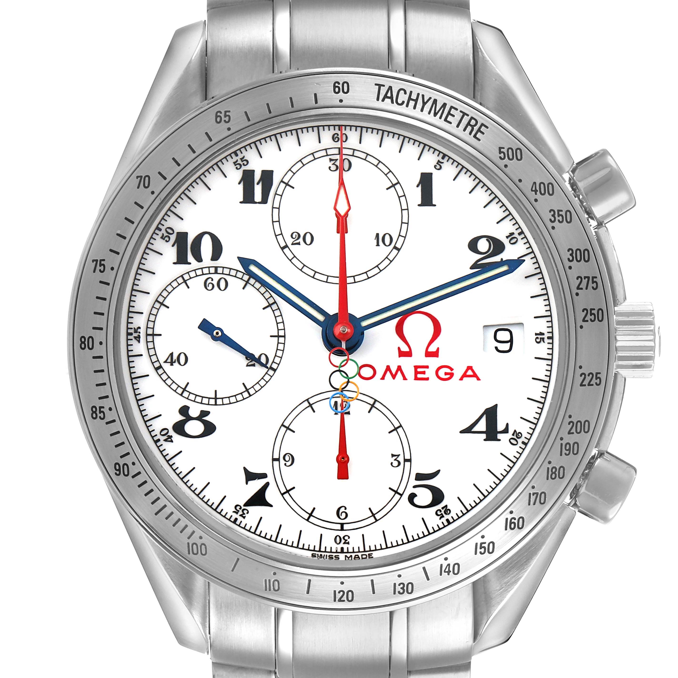 Omega Speedmaster Steel Olympic Chronograph White Dial Mens Watch 3515.20.00. Automatic self-winding chronograph movement. Caliber 1164. Stainless steel round case 39 mm in diameter. Stainless steel bezel with tachymetre function. Scratch-resistant sapphire crystal with anti-reflective treatment inside. White dial with raise index hour markers. Date window at 3 o'clock. Three chronograph subdials -- small seconds counter, 30-minutes and 12-hours. Blue and red hands. Brushed and polished stainless steel bracelet with deployent clasp. Fits 7 1/2" wrist.