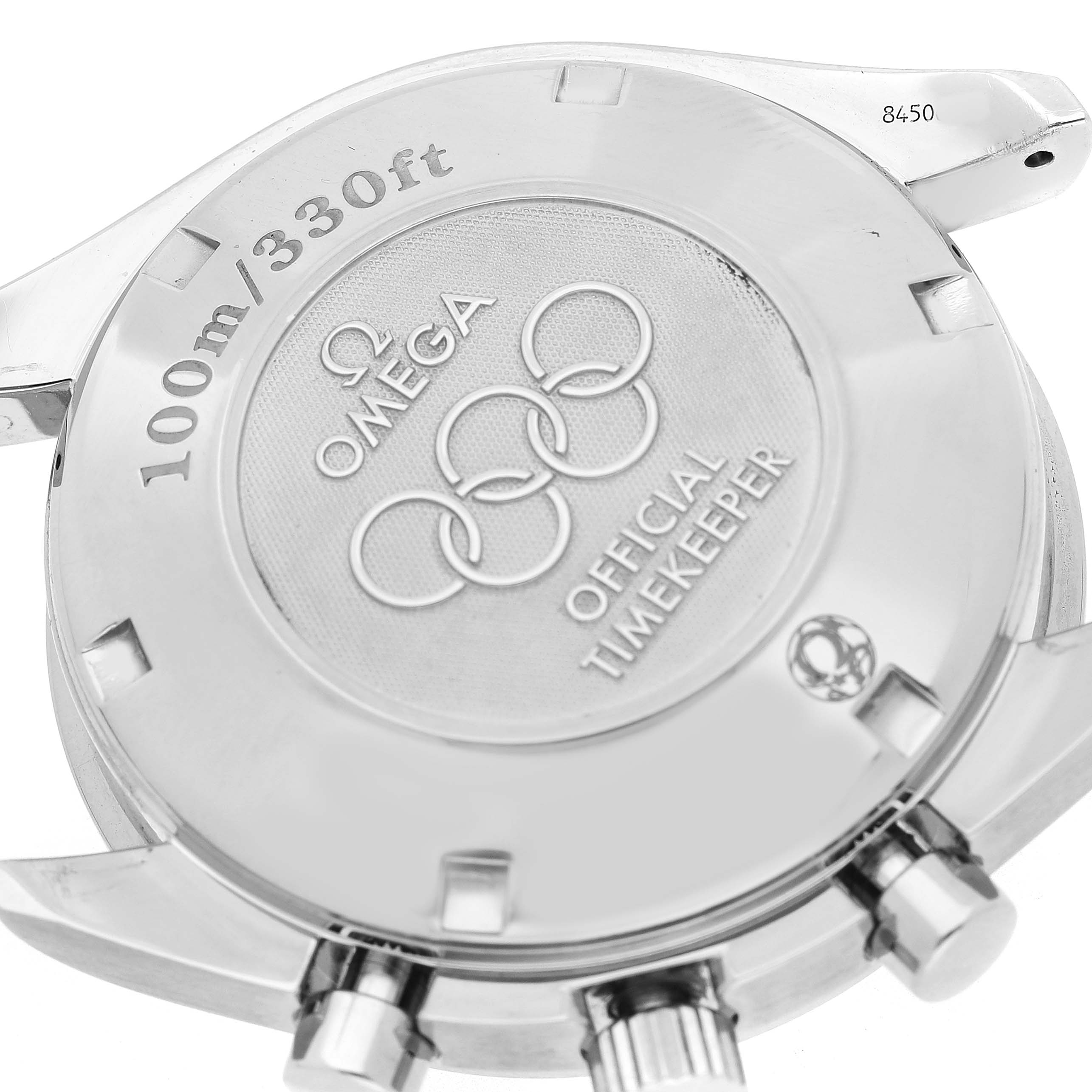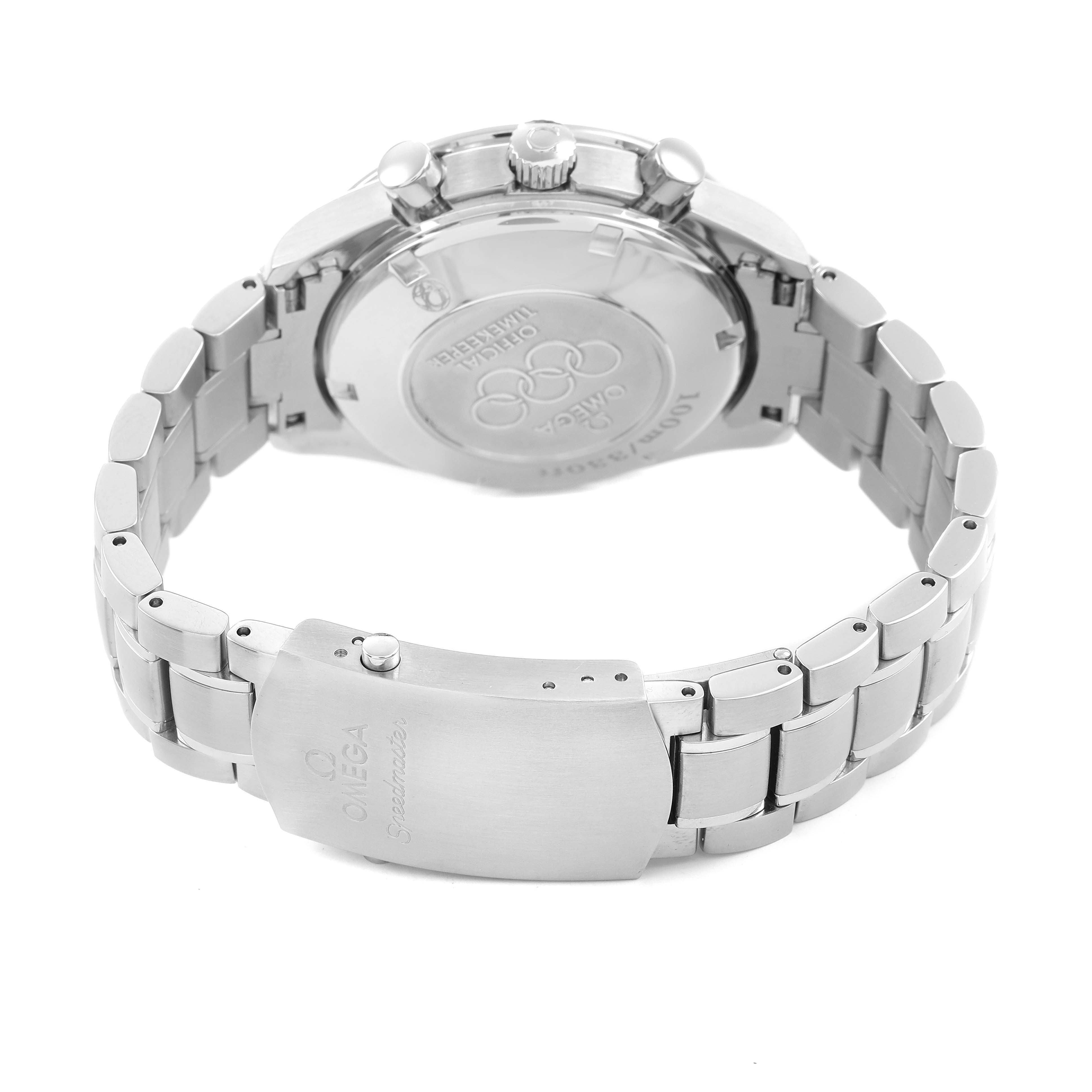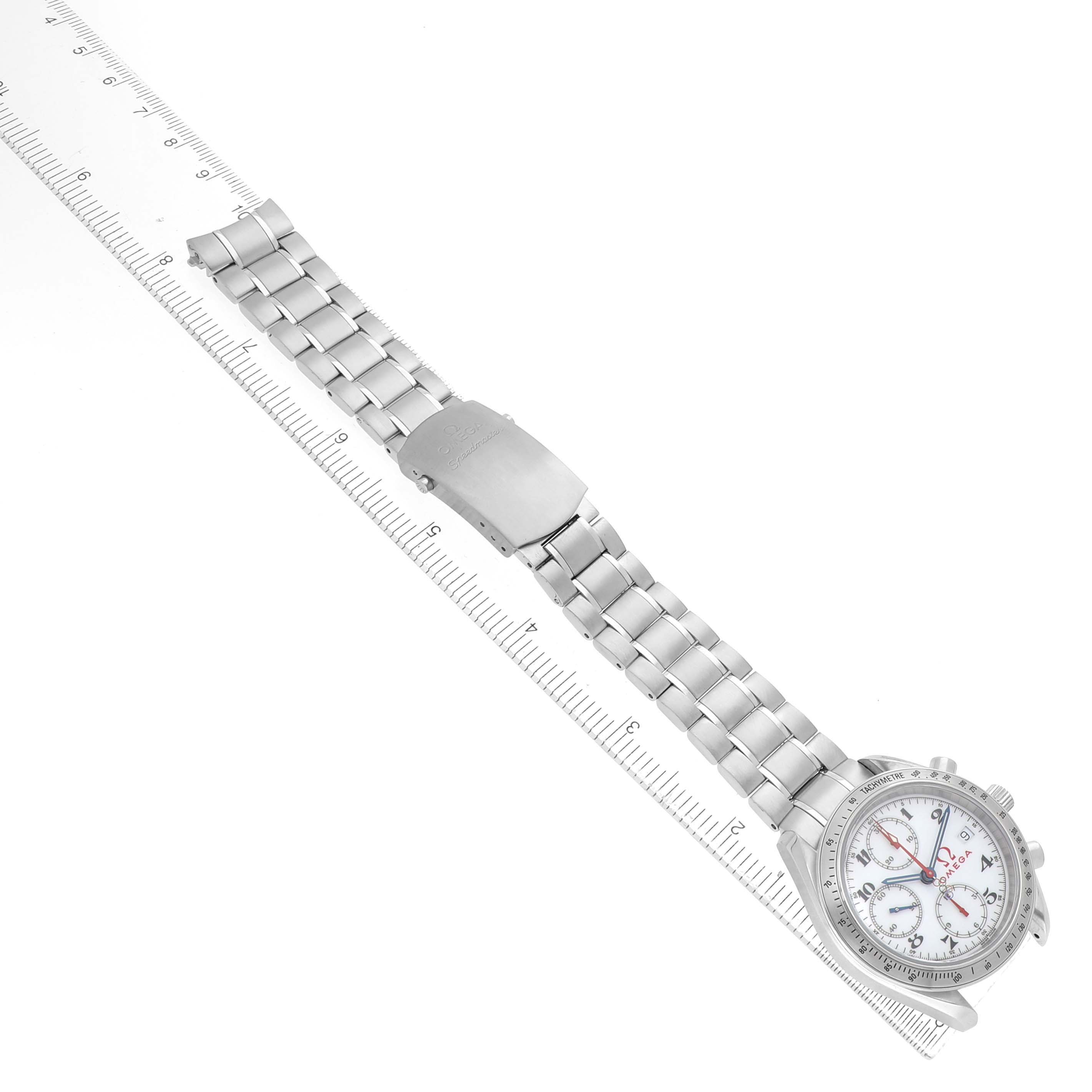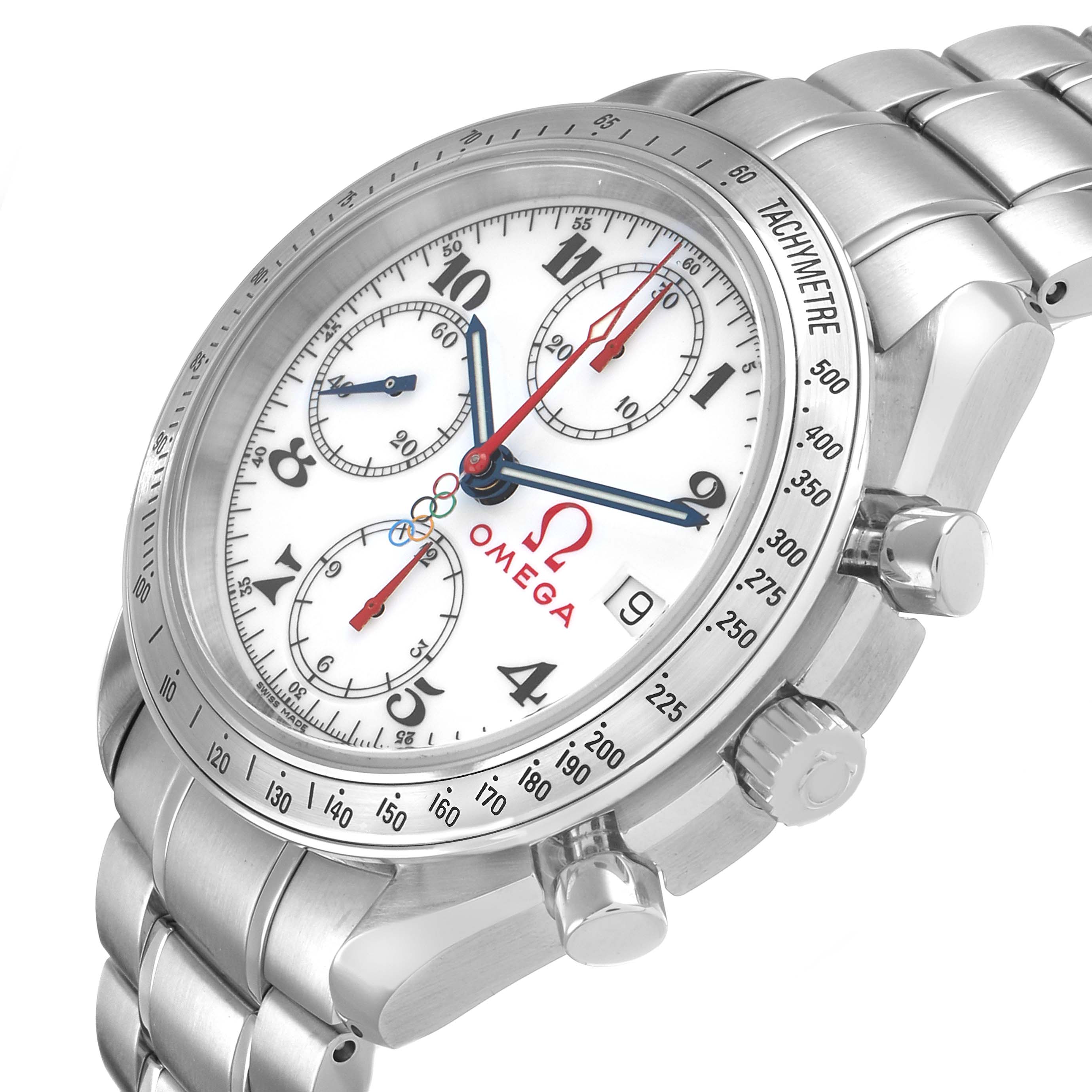 Omega Speedmaster Steel Olympic Chronograph White Dial Mens Watch 3515.20.00. Automatic self-winding chronograph movement. Caliber 1164. Stainless steel round case 39 mm in diameter. Stainless steel bezel with tachymetre function. Scratch-resistant sapphire crystal with anti-reflective treatment inside. White dial with raise index hour markers. Date window at 3 o'clock. Three chronograph subdials -- small seconds counter, 30-minutes and 12-hours. Blue and red hands. Brushed and polished stainless steel bracelet with deployent clasp. Fits 7 1/2" wrist.