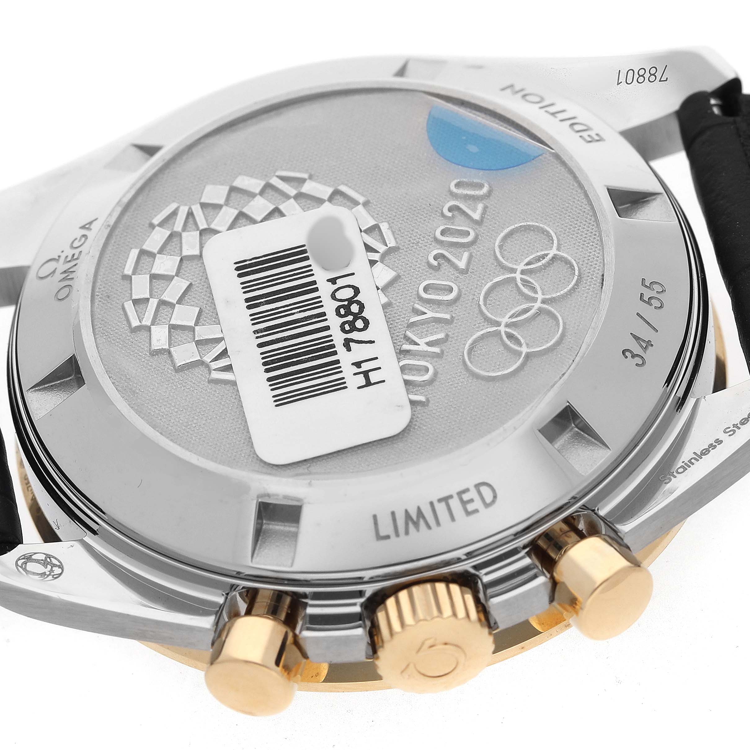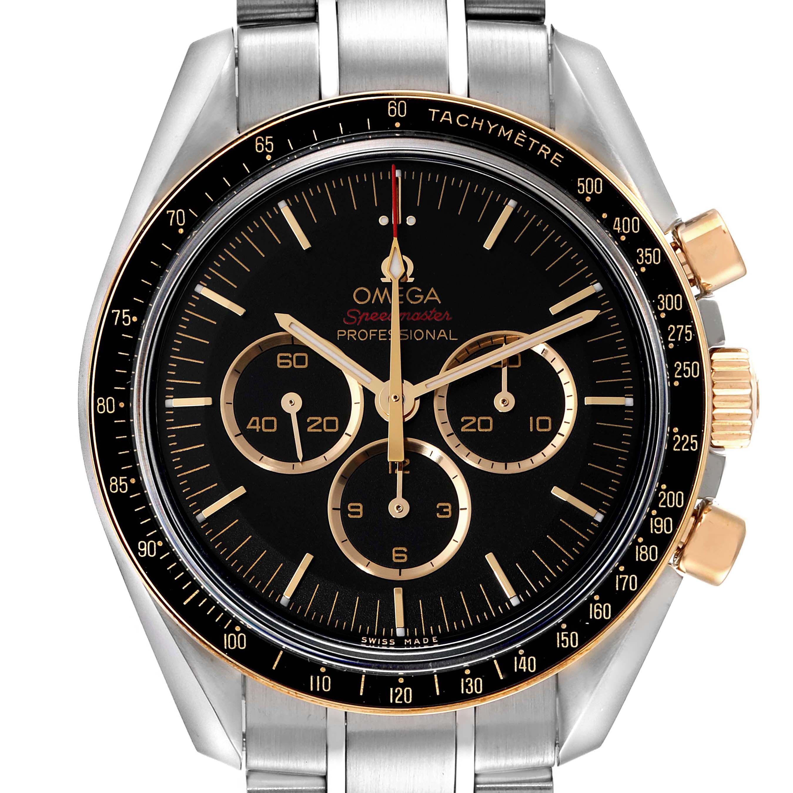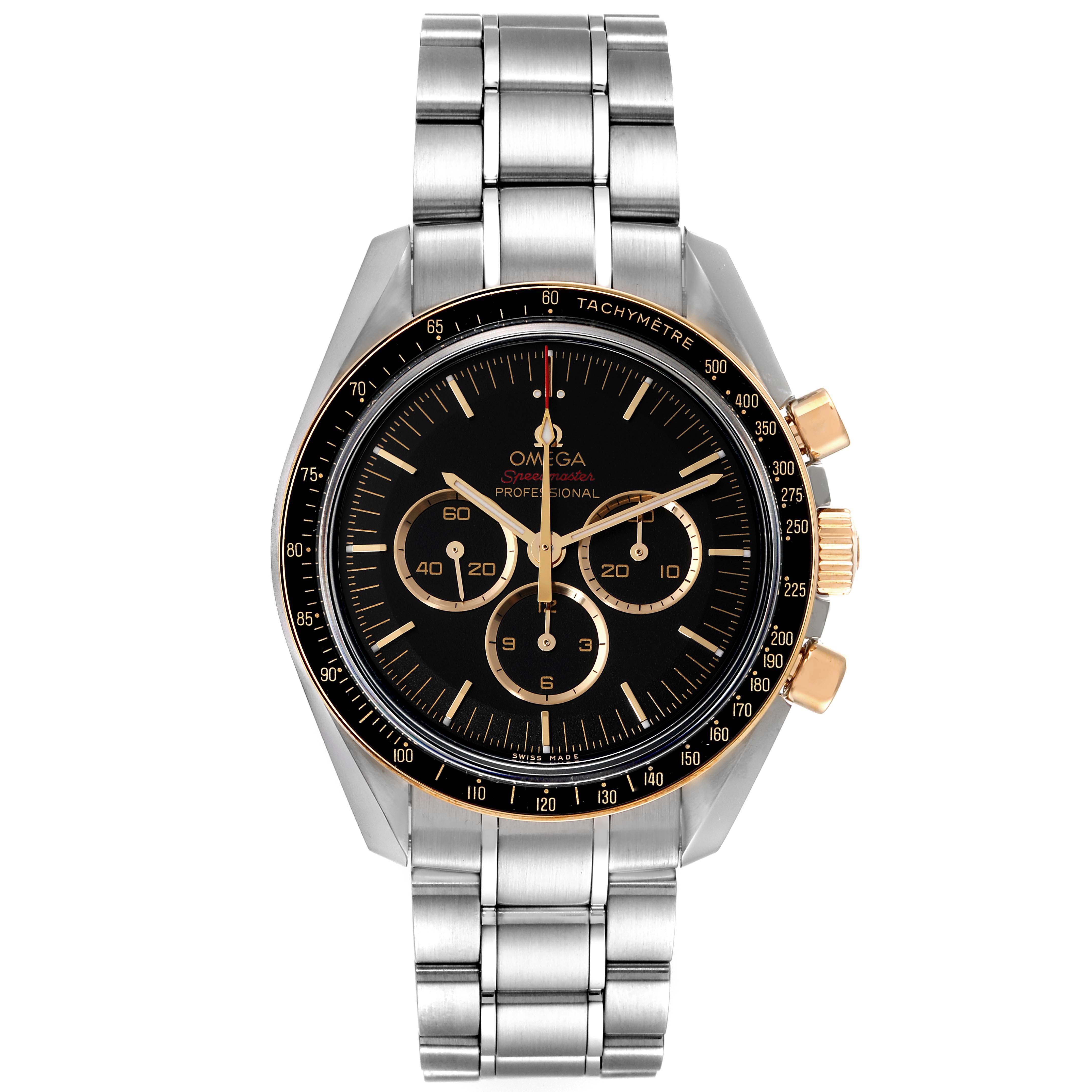 Omega Speedmaster Tokyo 2020 LE Steel Mens Watch 522.20.42.30.01.002 Unworn. Manual winding chronograph movement. Stainless steel round case 42.0 mm in diameter. 18k yellow gold crown with Omega logo. 18k yellow gold bezel with black aluminum tachymeter insert. Scratch resistant sapphire crystal. Black dial with 18k yellow gold indexes and three engine-turned subdials -- 30 minute register, 12 hour register, and constant seconds. Luminescent baton hands and hour markers. Stainless steel bracelet with double push button deployant clasp.