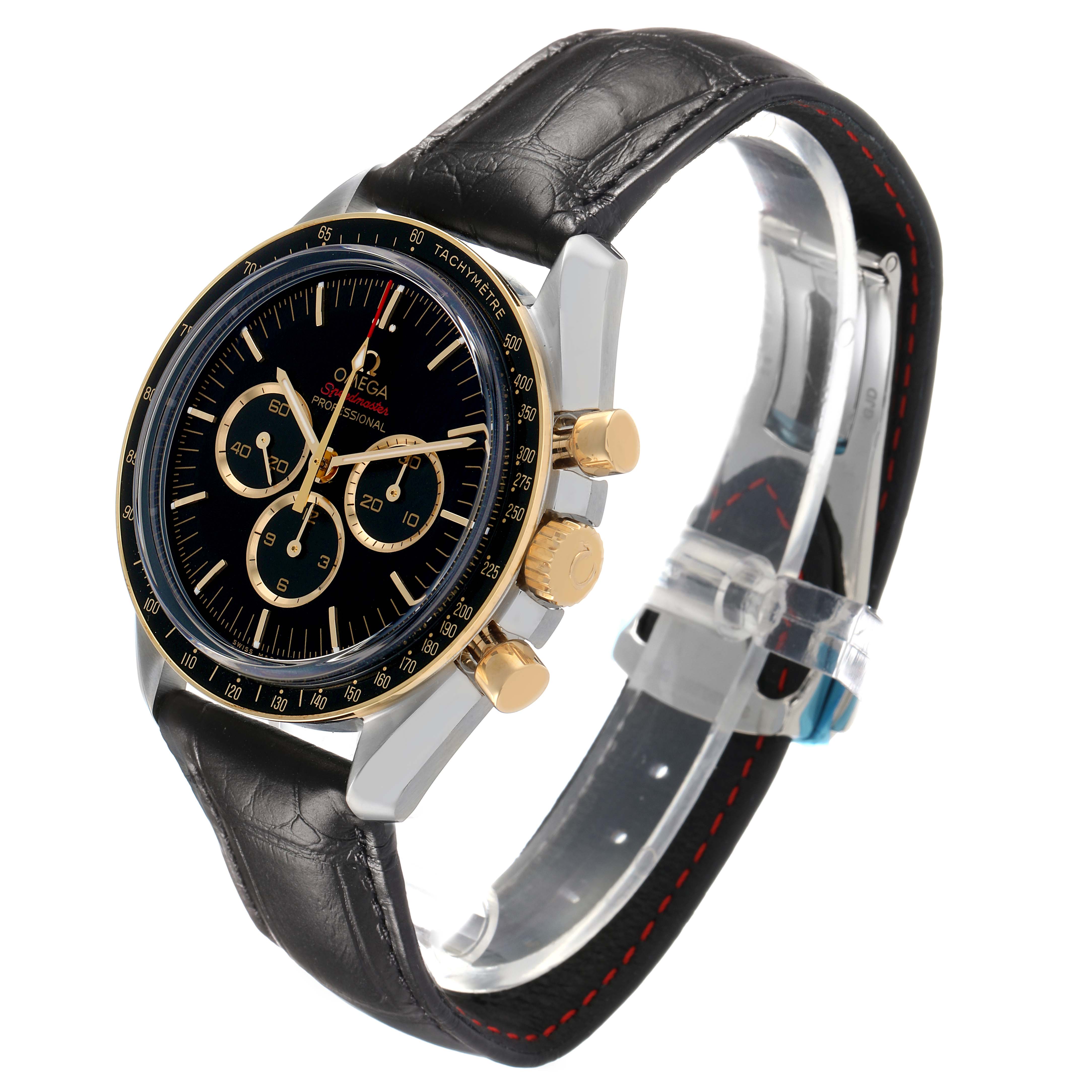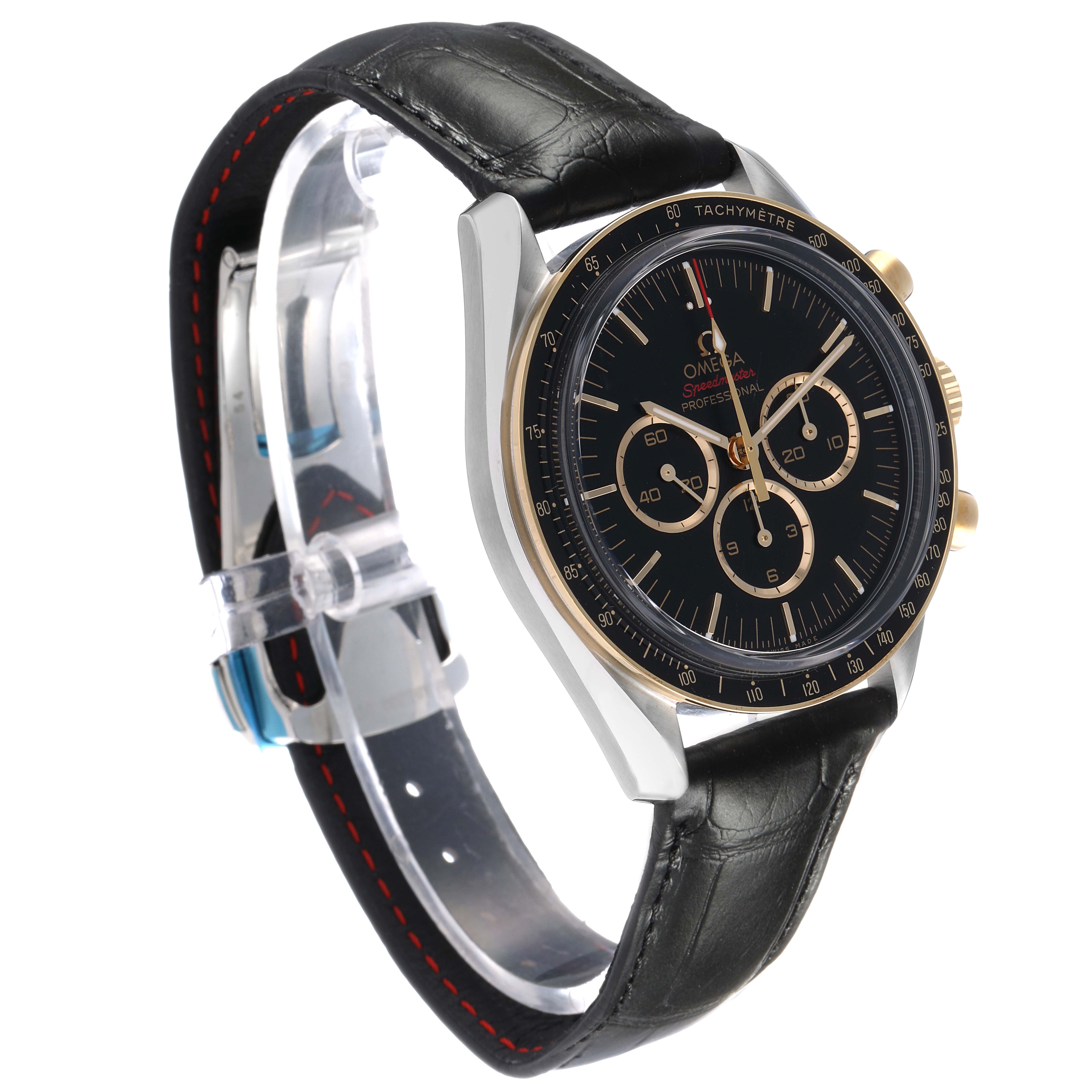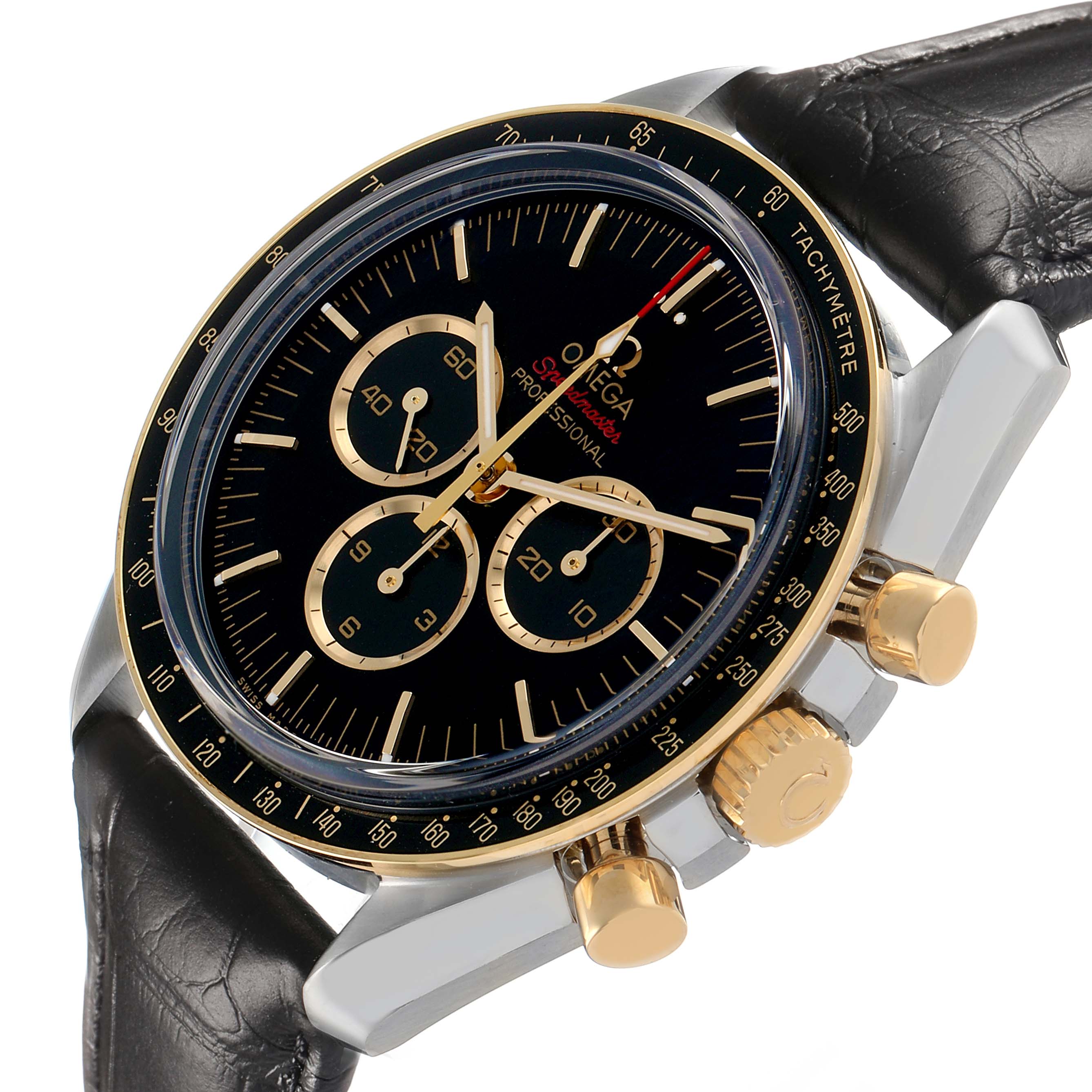Omega Speedmaster Tokyo 2020 LE Steel Mens Watch 522.20.42.30.01.002 Unworn. Manual winding chronograph movement. Stainless steel round case 42.0 mm in diameter. 18k yellow gold crown with Omega logo. 18k yellow gold bezel with black aluminum tachymeter insert. Scratch resistant sapphire crystal. Black dial with 18k yellow gold indexes and three engine-turned subdials -- 30 minute register, 12 hour register, and constant seconds. Luminescent baton hands and hour markers. Stainless steel bracelet with double push button deployant clasp.