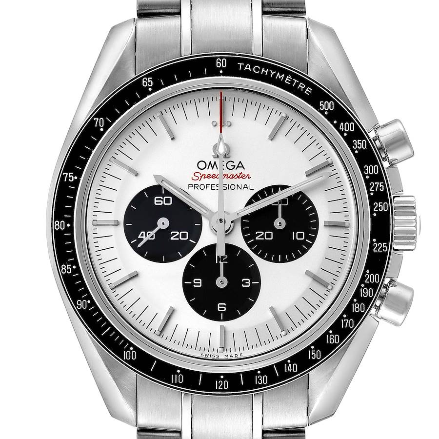 Omega Speedmaster Tokyo 2020 Olympics LE Watch 522.30.42.30.04.001. Manual winding chronograph movement. Stainless steel round case 42.0 mm in diameter. Stainless steel bezel with black aluminium tachymeter insert. Scratch resistant sapphire crystal. White dial with indexes and black engine-turned subdials - thirty minutes register, twelve hour register, constant seconds. Luminescent steel baton hands and raised hour markers. Stainless steel bracelet with double push button deployant clasp. Fits an 8 3/4" wrist.
