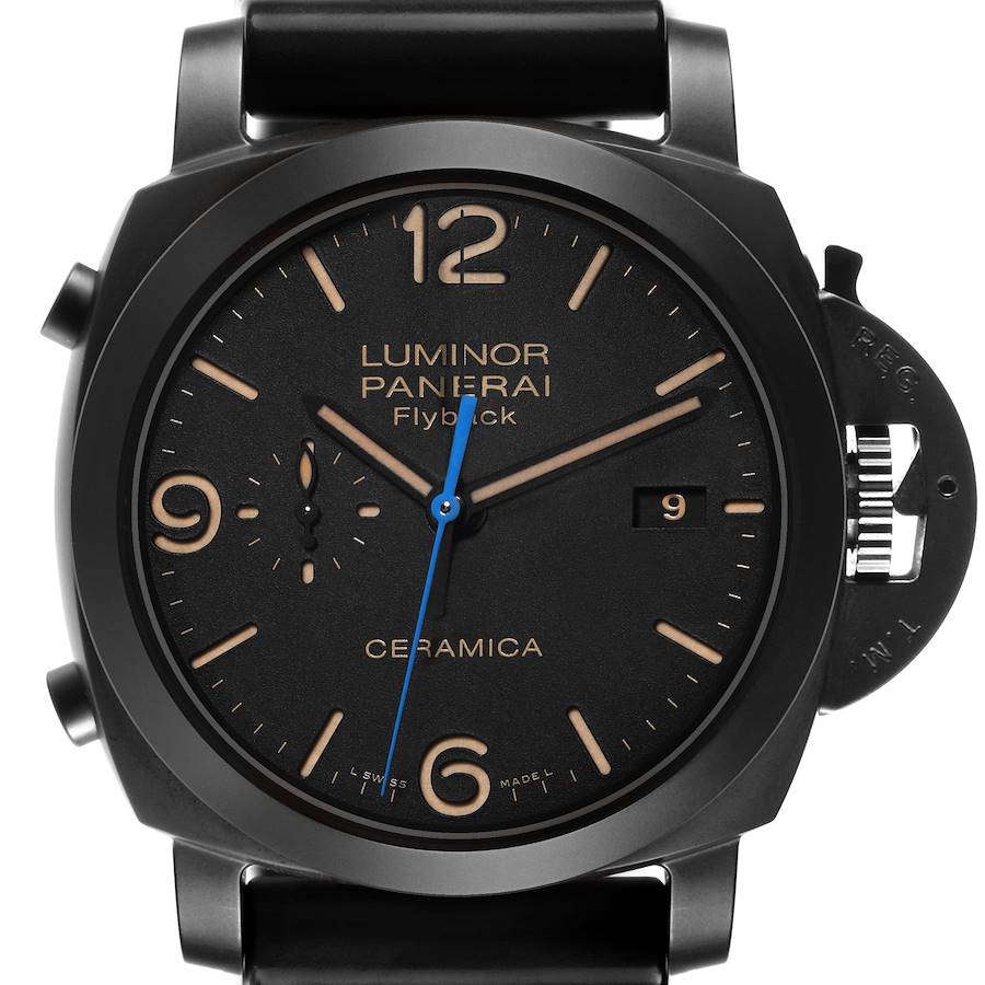 Panerai Luminor 1950 3 Days Chrono Flyback Ceramica 44 Watch PAM00580. Automatic self-winding movement. Matte black ceramic case cushion shaped case 44.0 mm in diameter. Panerai patented crown protector. Exhibition smoked sapphire case back. Push-button flyback function at eight o’clock. Matte black ceramic sloped bezel. Scratch resistant sapphire crystal. Black dial with luminous brown hour markers and hands. Arabic numerals at 6 and 12. Date display at the 3 o'clock aperture. Seconds sub-dial at the 9 o'clock. Central chronograph vibrant blue seconds and minutes hands. Black rubber strap with tang buckle.