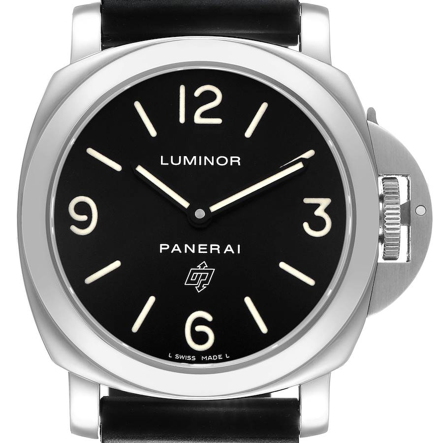 Panerai Luminor Base Logo 44 Steel Mens Watch PAM00000 Card. Manual-winding movement. Power reserve of approximately 56 hours. Two part cushion-shaped polished steel case 44.0 mm in diameter. Panerai patented crown protector. Stainless steel sloped bezel. Scratch resistant anti-reflective sapphire crystal. Black dial with luminescent sword-shaped hands and index hour markers. Arabic numerals at the 3, 6, 9 and 12 o'clock positions. Black rubber strap with a stainless steel tang buckle.