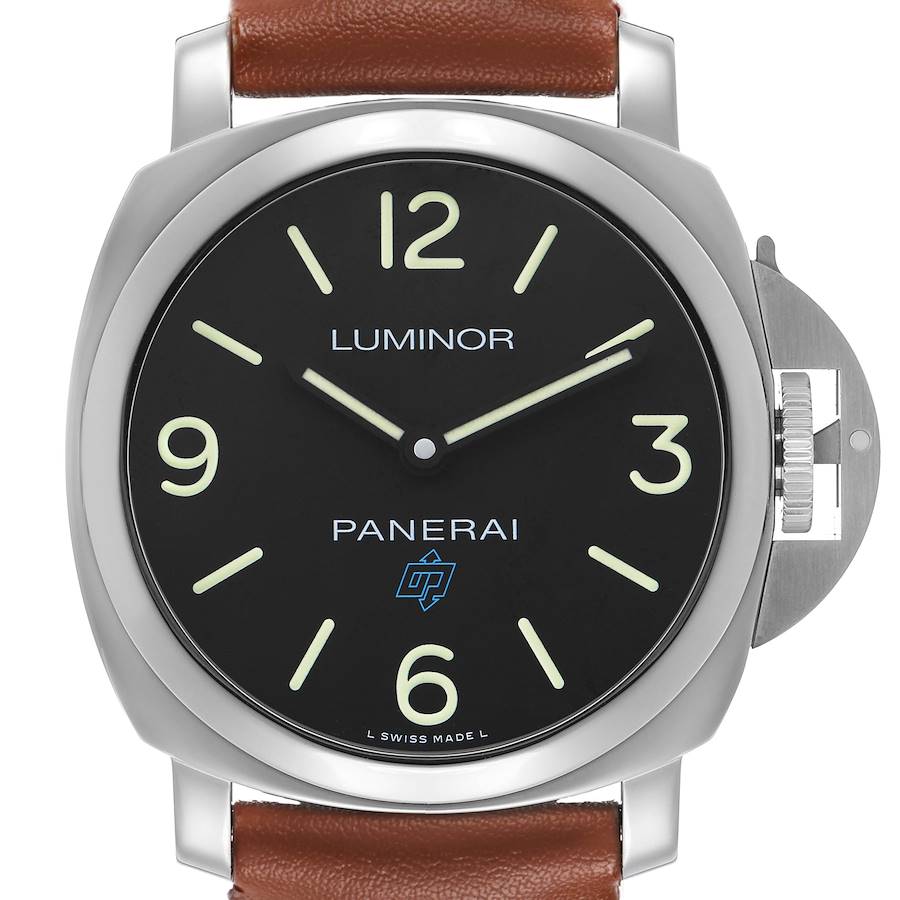 Panerai Luminor Base Logo 44mm Steel Mens Watch PAM00774. Manual-winding movement. Two part cushion shaped polished stainless steel case 44 mm in diameter. Panerai patented crown protector. Stainless steel sloped bezel. Scratch resistant anti-reflective sapphire crystal. Black dial with luminous hands and stick hour markers. Arabic numerals at 3, 6, 9 and 12 o'clock positions. Brown leather strap with stainless steel tang buckle.
