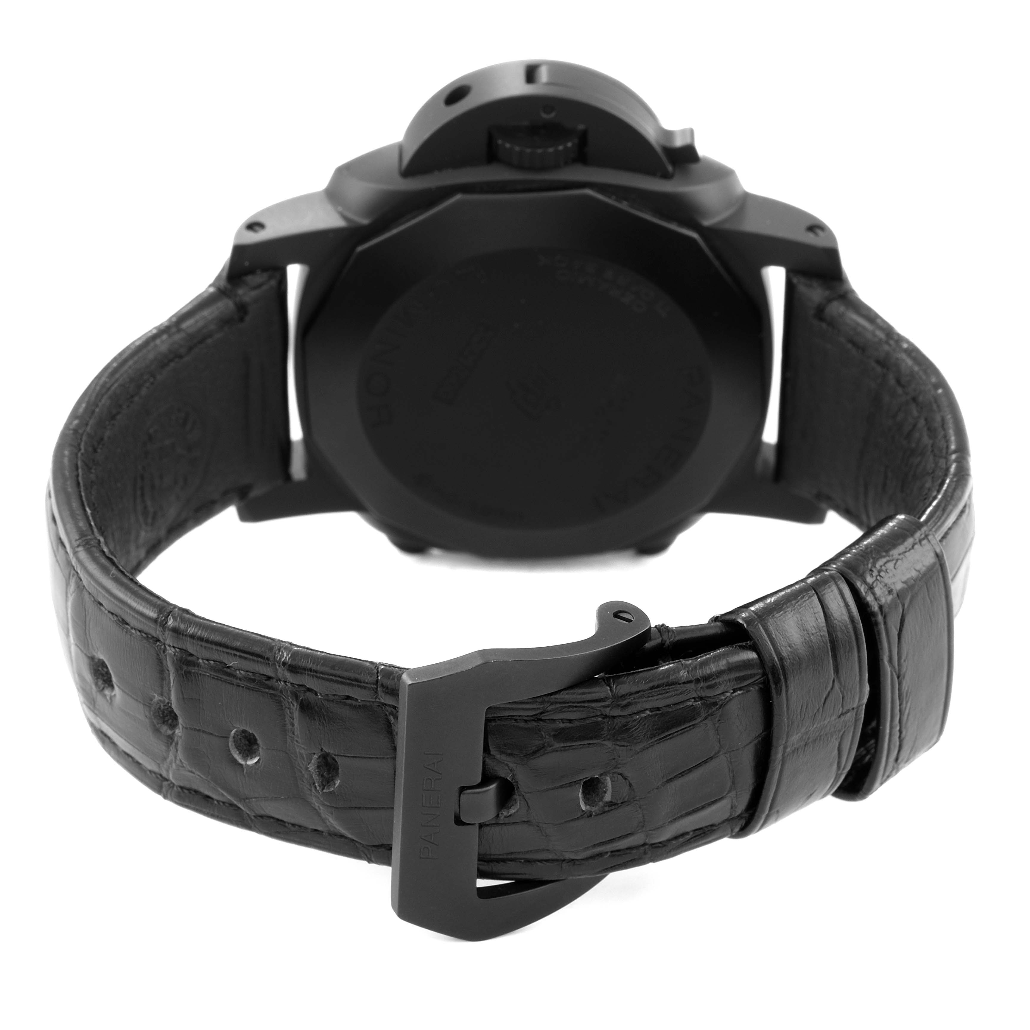 | Case: | Two part cushion shaped black ceramic case 44.0 mm in diameter. Panerai patented crown protector. Titanium caseback. |
