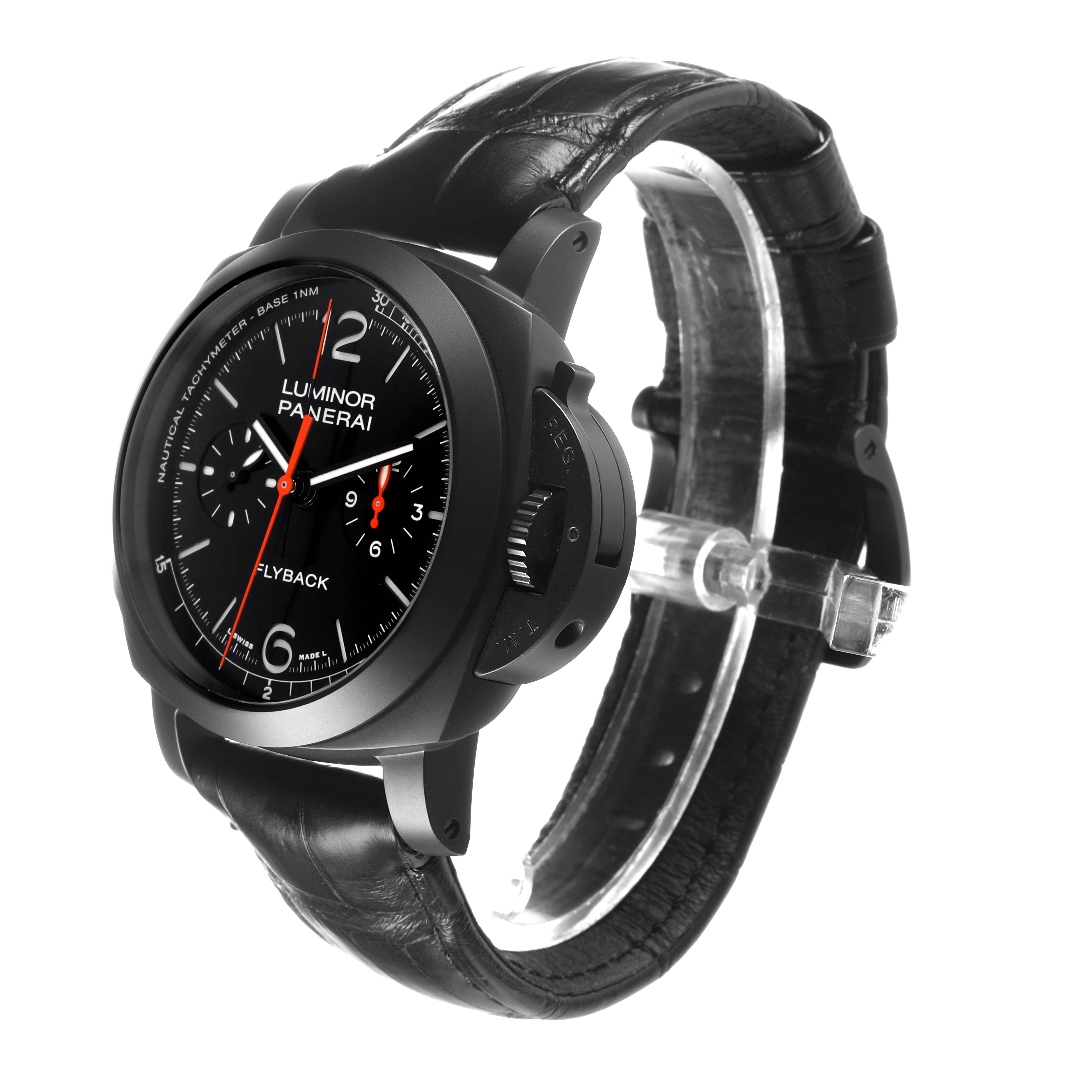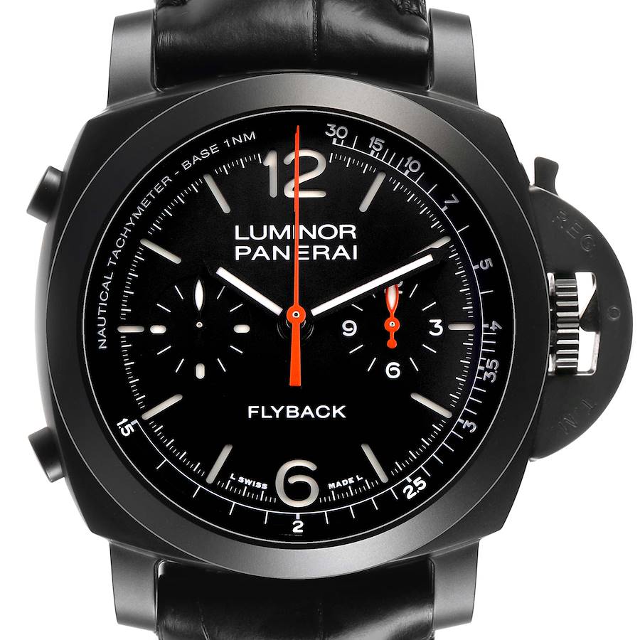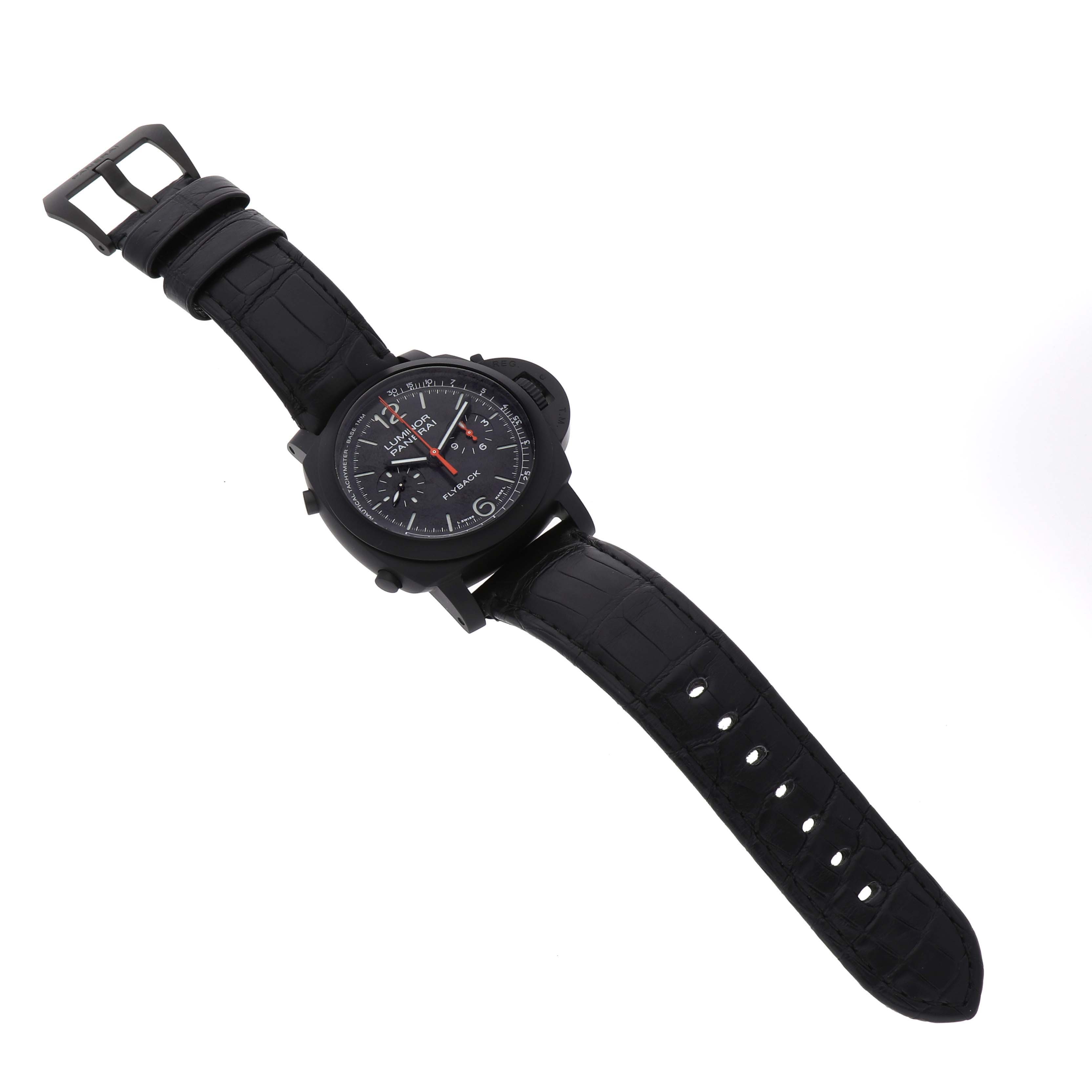 Panerai Luminor Chrono Flyback Black Dial Ceramic Mens Watch PAM01298 Card. Automatic self-winding chronograph movement. Flyback chronograph function. Two part cushion shaped black ceramic case 44.0 mm in diameter. Panerai patented crown protector. Titanium caseback. Black ceramic sloped bezel. Scratch resistant anti-reflective sapphire crystal. Black sun-brushed dial with luminous hands and hour markers. Arabic numerals at 6 and 12. Minute markers and tachymeter scale around the outer rim. Two chronograph subdials -- 60 seconds and 12 hours. Black leather strap with a black titanium tang buckle.