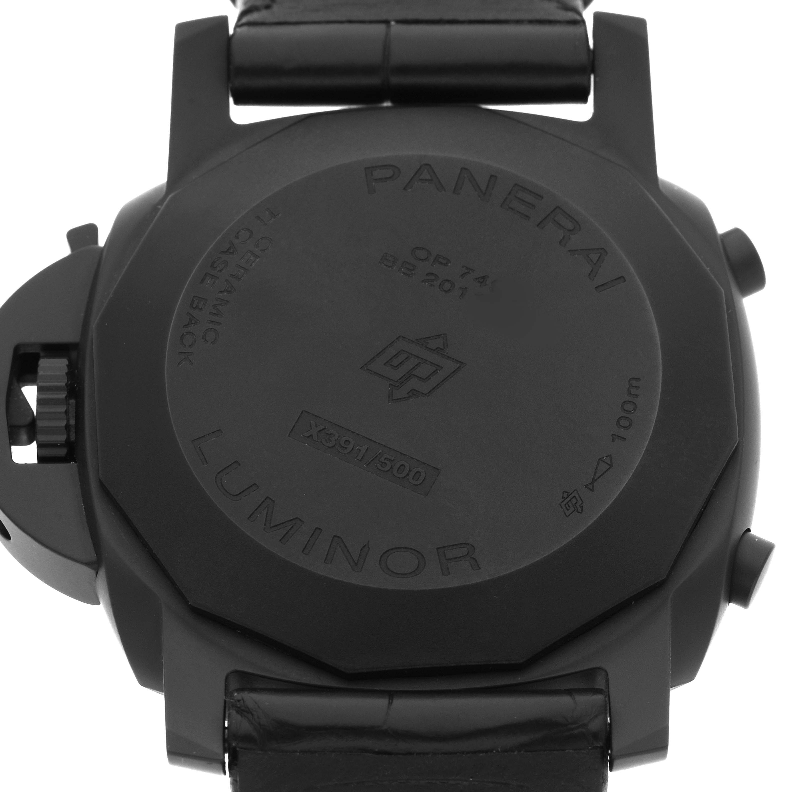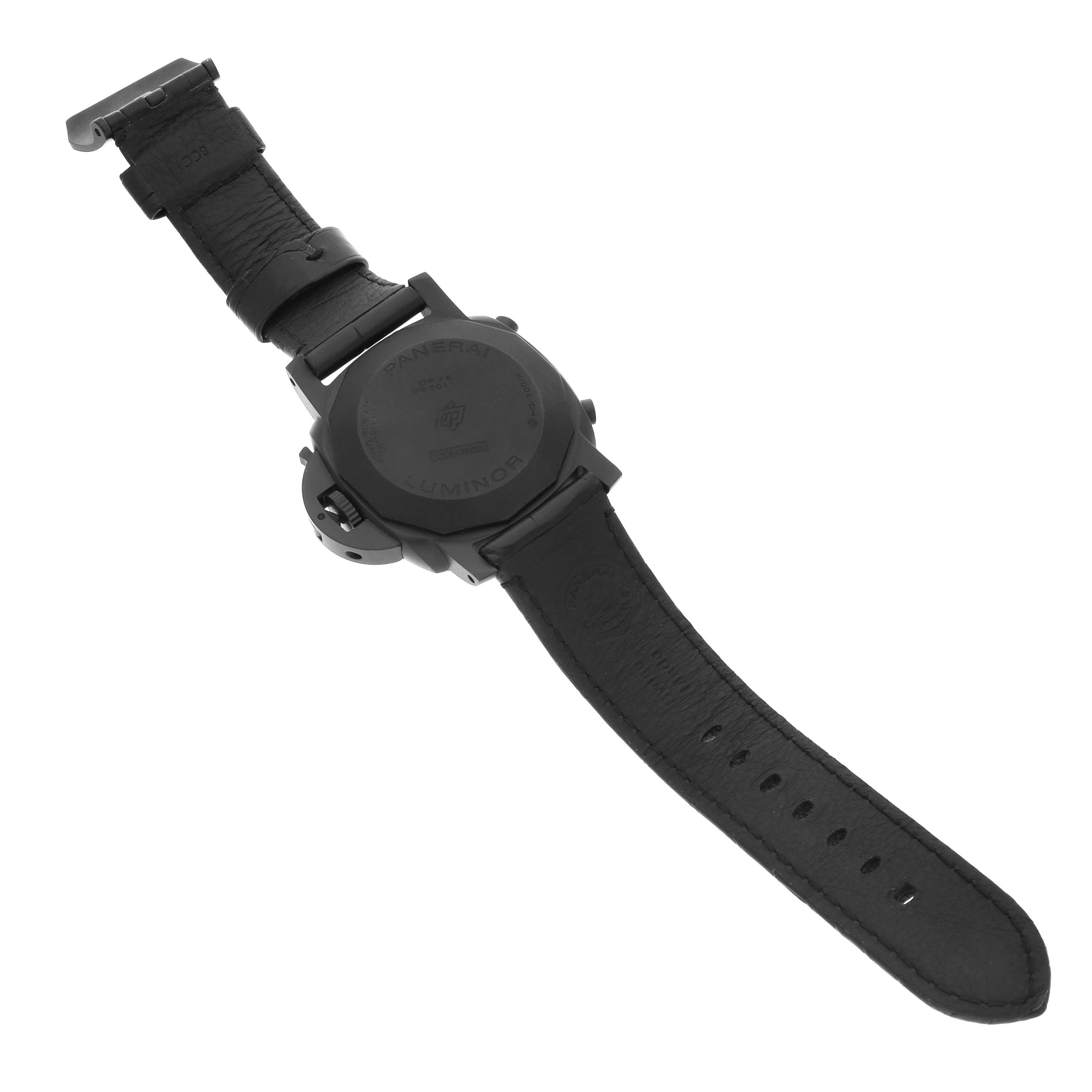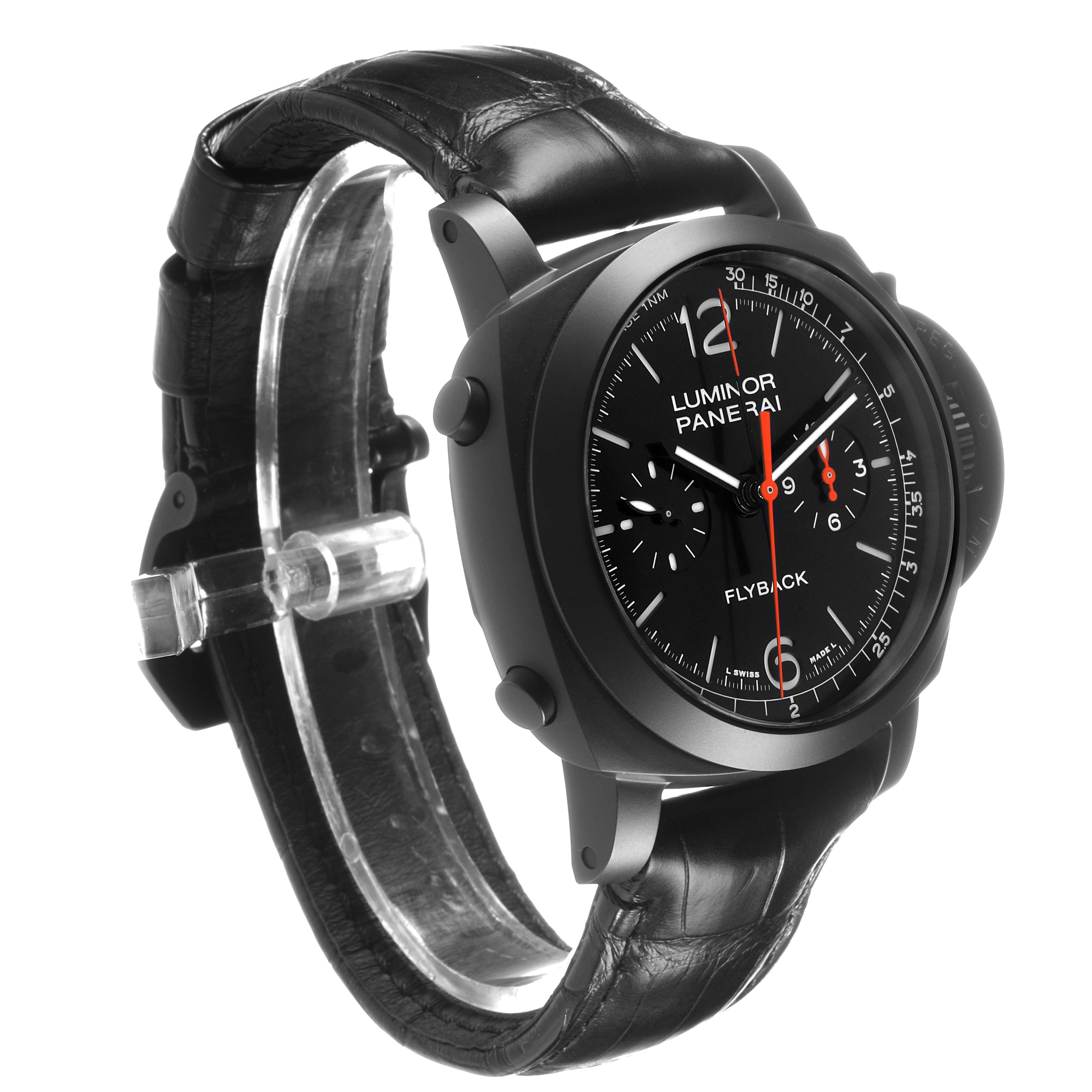 Panerai Luminor Chrono Flyback Black Dial Ceramic Mens Watch PAM01298 Card. Automatic self-winding chronograph movement. Flyback chronograph function. Two part cushion shaped black ceramic case 44.0 mm in diameter. Panerai patented crown protector. Titanium caseback. Black ceramic sloped bezel. Scratch resistant anti-reflective sapphire crystal. Black sun-brushed dial with luminous hands and hour markers. Arabic numerals at 6 and 12. Minute markers and tachymeter scale around the outer rim. Two chronograph subdials -- 60 seconds and 12 hours. Black leather strap with a black titanium tang buckle.