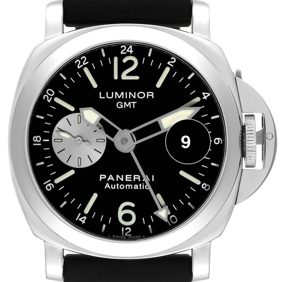 Panerai Luminor GMT Automatic Steel Mens Watch PAM00088 Box Papers. Automatic self-winding movement. GMT function. Two part, polished and brushed cushion shaped stainless steel case 44.0 mm in diameter. Polished Panerai patented crown protector. Stainless steel sloped bezel. Scratch resistant sapphire crystal with interior cyclops magnifier. Black dial with luminous inlay hour markers and hands. Arabic numerals at 6 and 12. Tachymeter scale around outer trim. Date calendar at 3. Silver second sweep subdial at 9 o'clock. Black rubber strap with stainless steel deployant buckle.