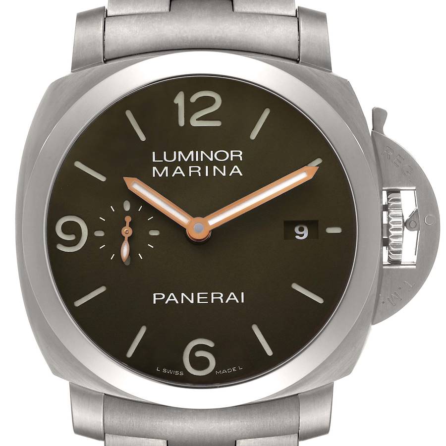 Panerai Luminor Marina 1950 3 Days Titanium Mens Watch PAM00352. Automatic self-winding movement. Two part cushion shaped titanium case 44.0 mm in diameter and 15.0 mm thick. Transparent exhibition sapphire crystal case back. Panerai patented crown protector. Titanium sloped bezel. Scratch resistant sapphire crystal. Brown dial with luminous hands and stick hour markers. Arabic numerals at 6, 9 and 12 o'clock positions. Small seconds sub dial at the 9 o'clock position. Date calendar window at 3 o'clock aperture. Titanium bracelet with push-button double deployant clasp. Fits an 7 3/4" wrist.