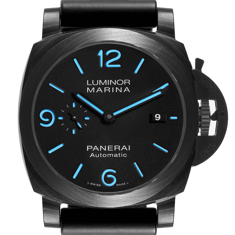Panerai Luminor Marina 1950 44 Carbotech Mens Watch PAM01661 Box Card. Automatic self-winding movement. Two part cushion shaped carbotech case 44.0 mm in diameter. Carboteck sloped bezel. Scratch resistant sapphire crystal. Black dial with luminous blue index hour markers and Arabic numeral at 6, 9, and 12 o'clock. Date at 3 o'clock and small seconds at 9 o'clock. Black rubber strap with Carboteck tang buckle.
