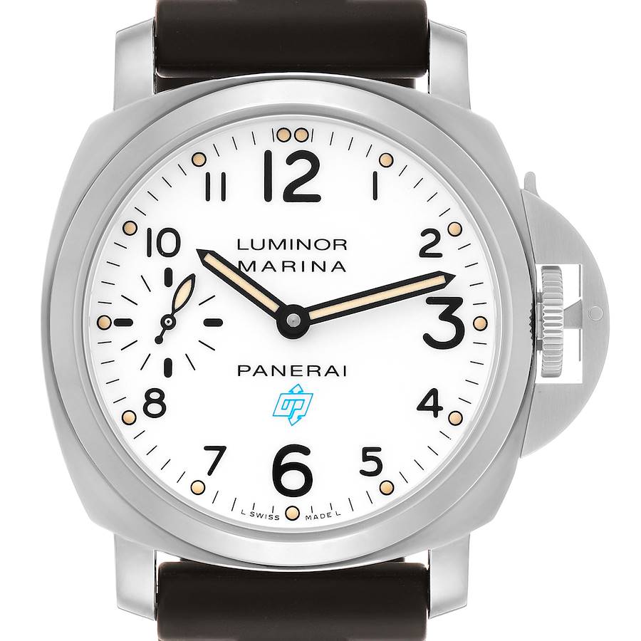 Panerai Luminor Marina 44mm White Dial Steel Mens Watch PAM00660 Card. Manual-winding movement. Two part cushion shaped stainless steel case 44 mm in diameter. Panerai patented crown protector. Stainless steel sloped bezel. Scratch resistant sapphire crystal. White dial with arabic numerals. Minute markers around the outer rim. 60 seconds subdial at 9 o'clock. Brown rubber strap with stainless steel tang buckle.