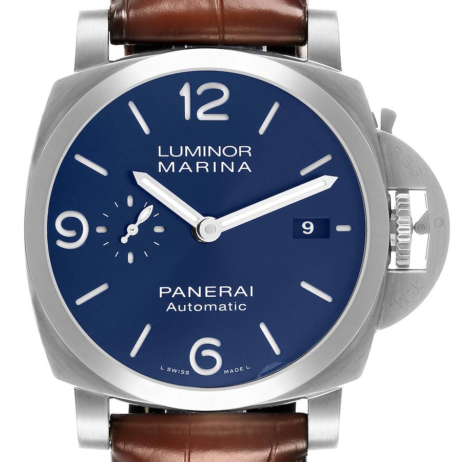 Panerai Luminor Marina Quaranta Steel Blue Dial Mens Watch PAM01370. Automatic self-winding movement. Brushed stainless steel cushion case 40mm in diameter. Panerai patented crown protector. Stainless steel smooth bezel. Scratch resistant sapphire crystal. Blue dial with luminescent hands and baton hour markers. Arabic numerals at 6 and 12 o'clock positions. Small seconds sub-dial at the 9 o'clock position. Date calendar window at 3 o'clock aperture. Brown leather strap with stainless steel tang buckle.