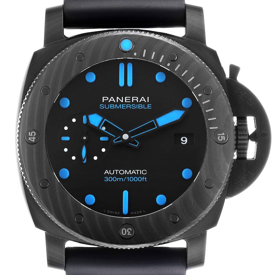 Panerai Luminor Submersible 1950 Carbotech Mens Watch PAM01616 Box Card. Automatic self-winding movement. Two part cushion shaped black carbotech case 47.0 mm in diameter. Panerai patented crown protector. Unidirectional rotating bezel with a black ceramic top ring. Vintage blue luminous filled dot starting point. Engraved 15 minute zone with blue colored luminous fill. Raised 5 minute indexes. Scratch resistant sapphire crystal. Black dial with blue colored luminous dot hour markers. Blackened steel hands, partially skeletonized with blue colored luminous filled tips. Date window at 3. Small seconds subdial at 9 o'clock with black steel hand with luminous fill. Black rubber strap with tang buckle.