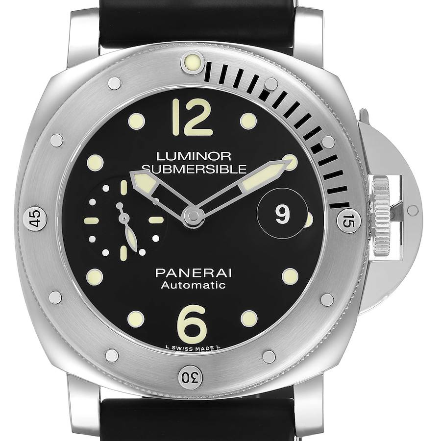 Panerai Luminor Submersible 44 Steel Mens Watch PAM01024 Box Papers. Automatic self-winding movement. Stainless steel cushion case 44.0 mm in diameter. Panerai patented crown protector. Stainless steel unidirectional rotating diver's bezel. Scratch resistant sapphire crystal with interior cyclops magnifier. Black dial with luminous hands and dot hour markers. Arabic numerals at 6 and 12 o'clock positions. Small seconds sub dial at the 9 o'clock position. Date calendar window at 3 o'clock aperture. Black rubber strap with stainless steel tang buckle.