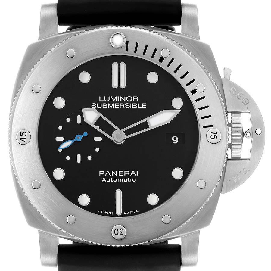 Panerai Luminor Submersible 47 3 Days Titanium Mens Watch PAM01305. Automatic self-winding movement. Titanium cushion-shaped case 47.0 mm in diameter. Panerai patented crown protector. Transparent exhibition sapphire crystal caseback. Titanium unidirectional rotating time-lapse diver's bezel. Scratch resistant sapphire crystal. Black dial with luminescent skeleton hands and dot hour markers. Small seconds subdial at 9 o'clock with a blue seconds hand. Date calendar at the 3 o'clock aperture. Black rubber strap with a titanium tang buckle.
