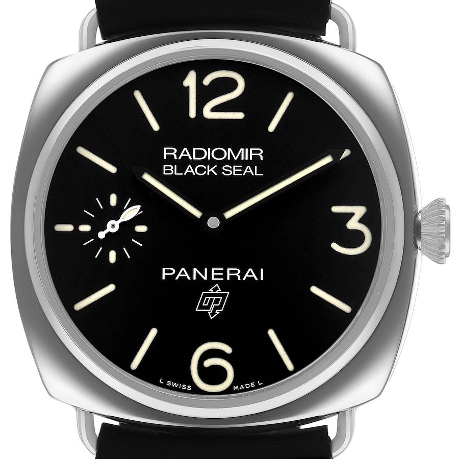 Panerai Radiomir Black Seal 45 3 Days Steel Mens Watch PAM00754. Manuel winding movement. Two part cushion-shaped stainless steel case 45.0 mm in diameter. Panerai logo on the crown. Stainless steel smooth sloped bezel. Scratch resistant anti-reflective sapphire crystal. Black dial luminescent sword-shaped hands and baton hour markers. Arabic numerals at 3, 6 and 12 o'clock. Small seconds subdial at 9 o'clock. Black rubber strap with a stainless steel tang buckle.