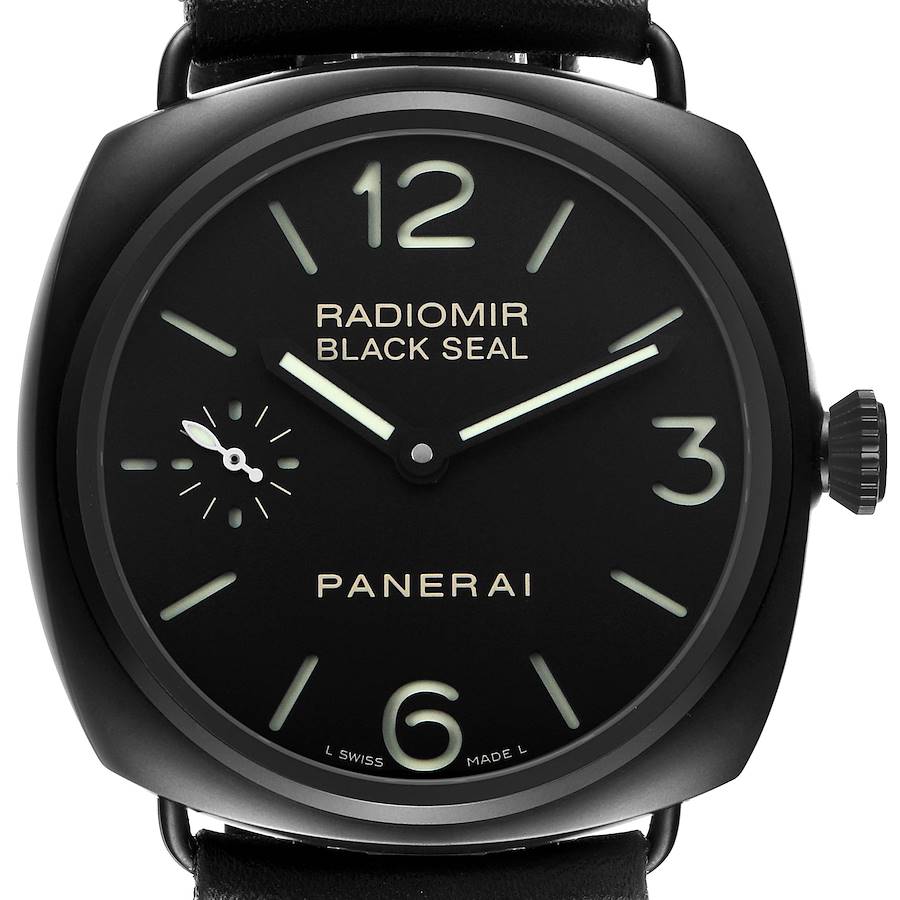 Panerai Radiomir Black Seal Ceramic Mens Watch PAM00292 Papers Card. Manual-winding movement. Cushion shaped black seal ceramic 45.0 mm in diameter. Black seal ceramic sloped bezel. Scratch resistant sapphire crystal. Black dial with luminous hands and baton hour markers. Arabic numerals at 3, 6 and 12 o'clock positions. Small seconds sub-dial at 9 o'clock. Black leather strap with ceramic tang buckle.