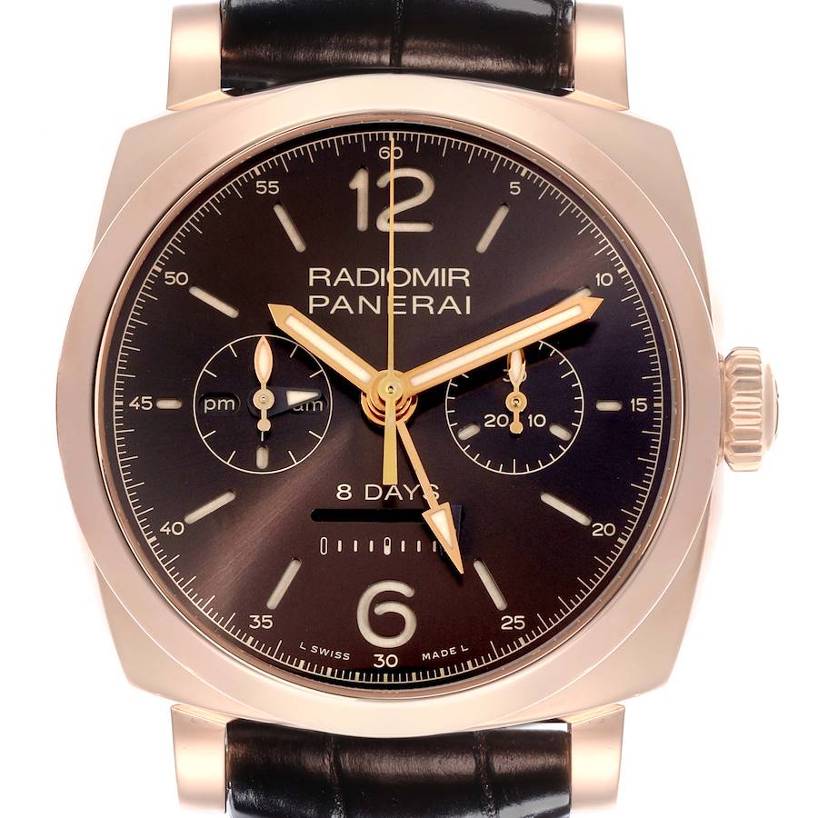 NOT FOR SALE Panerai Radiomir Monopulsante 8 Days GMT Rose Gold Watch PAM00502 Box Papers PARTIAL PAYMENT. Manual winding movement. Two part cushion shaped 18k rose gold case 44.0 mm in diameter. Case thickness: 17 mm. Exhibition transparent sapphire crystal case back. 18k rose gold sloped bezel. Scratch resistant anti-reflective sapphire crystal. Brown dial with luminous rose gold hands and stick hour markers. Arabic numerals at 6 and 12 o'clock positions. Minute markers around the outer rim. Linear power reserve indicator at 6. Seconds and 24h indicator at 9 o’clock, Chronograph sub dial at 3. Black leather strap with with 18k rose gold deployant buckle.