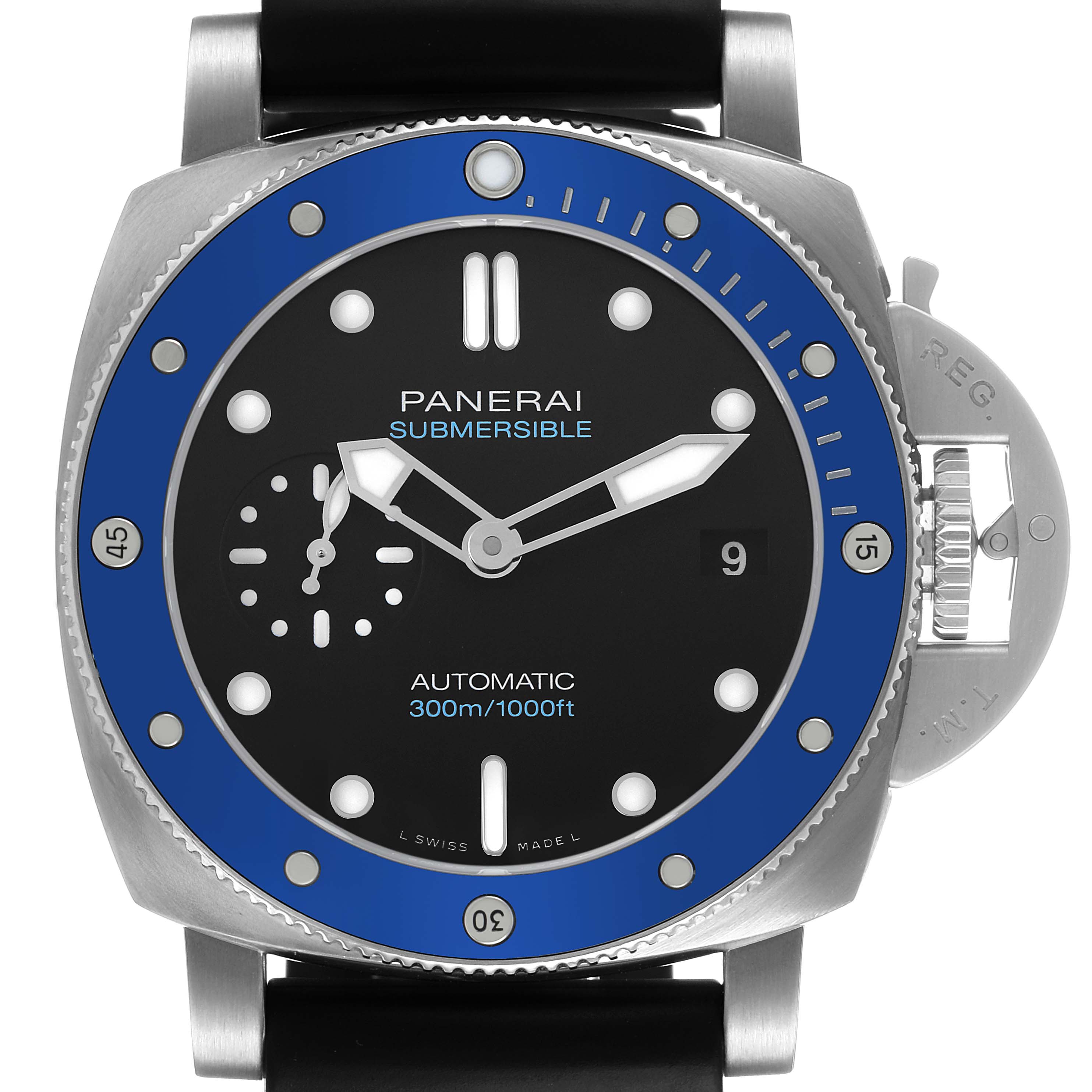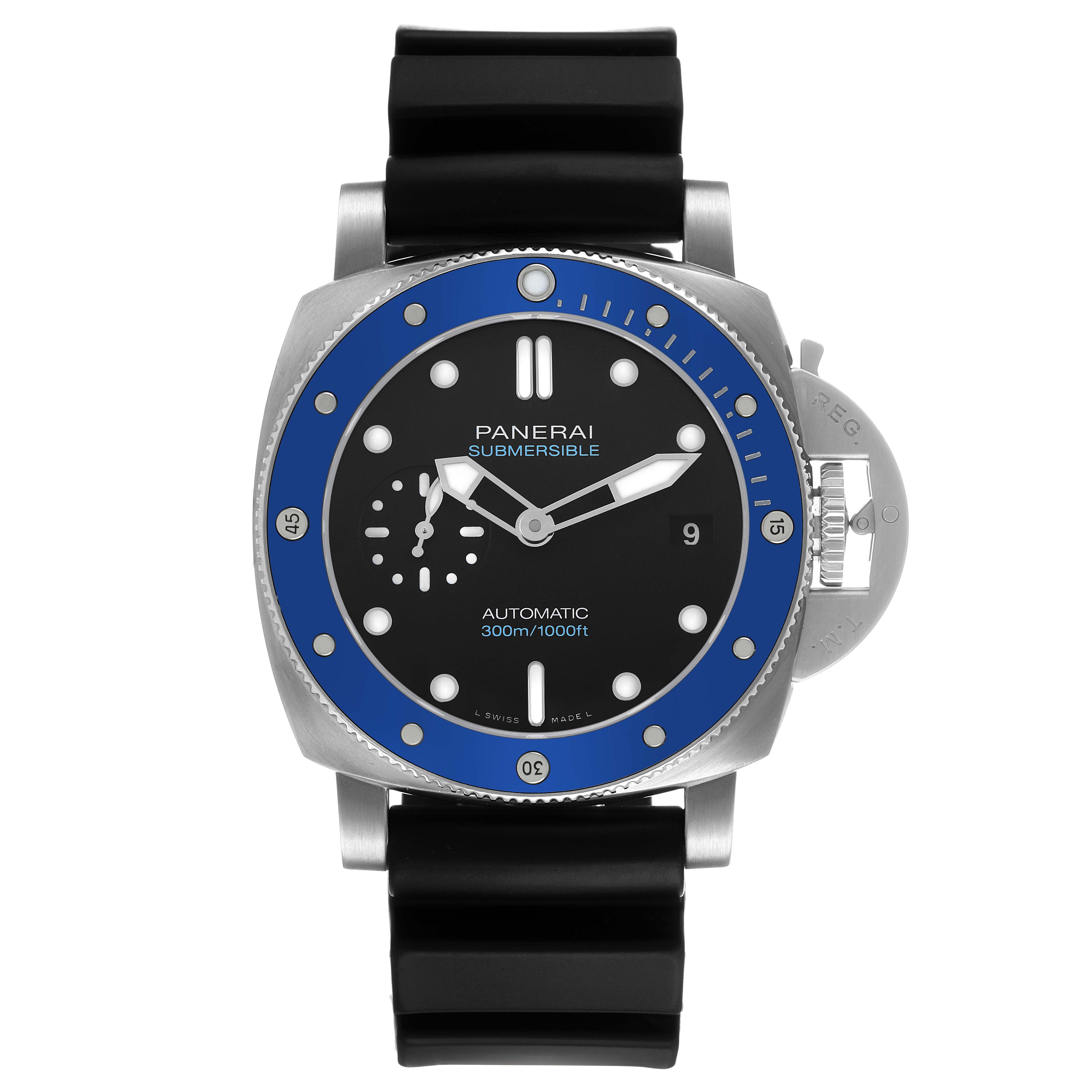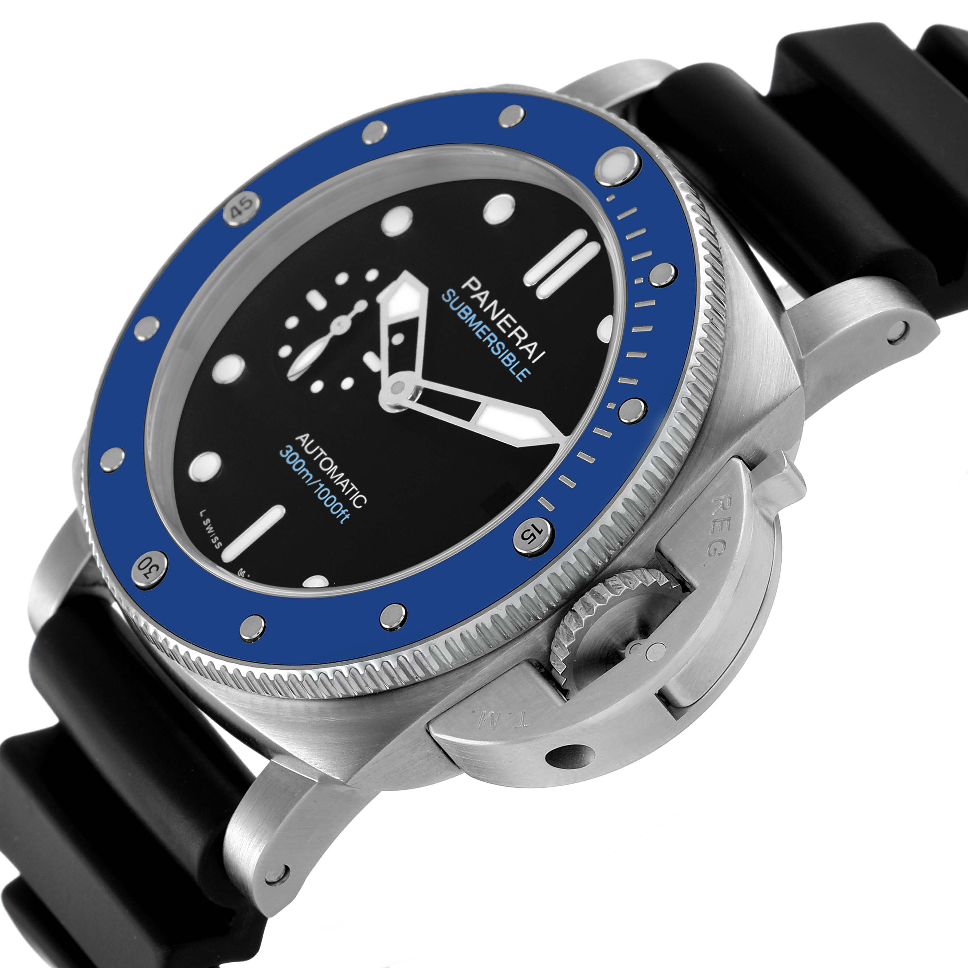 Panerai Submersible Azzurro Steel Black Dial Mens Watch PAM01209 Box Papers. Automatic self-winding movement. Two part cushion shaped stainless steel case 42.0 mm in diameter. Panerai patented crown protector. Blue ceramic anti-clockwise unidirectional rotating bezel with graduated scale. Scratch resistant sapphire crystal. Black dial with luminous baton hands and hour markers. Date window at 3. Small seconds subdial at 9. Black rubber strap with stainless steel tang buckle.