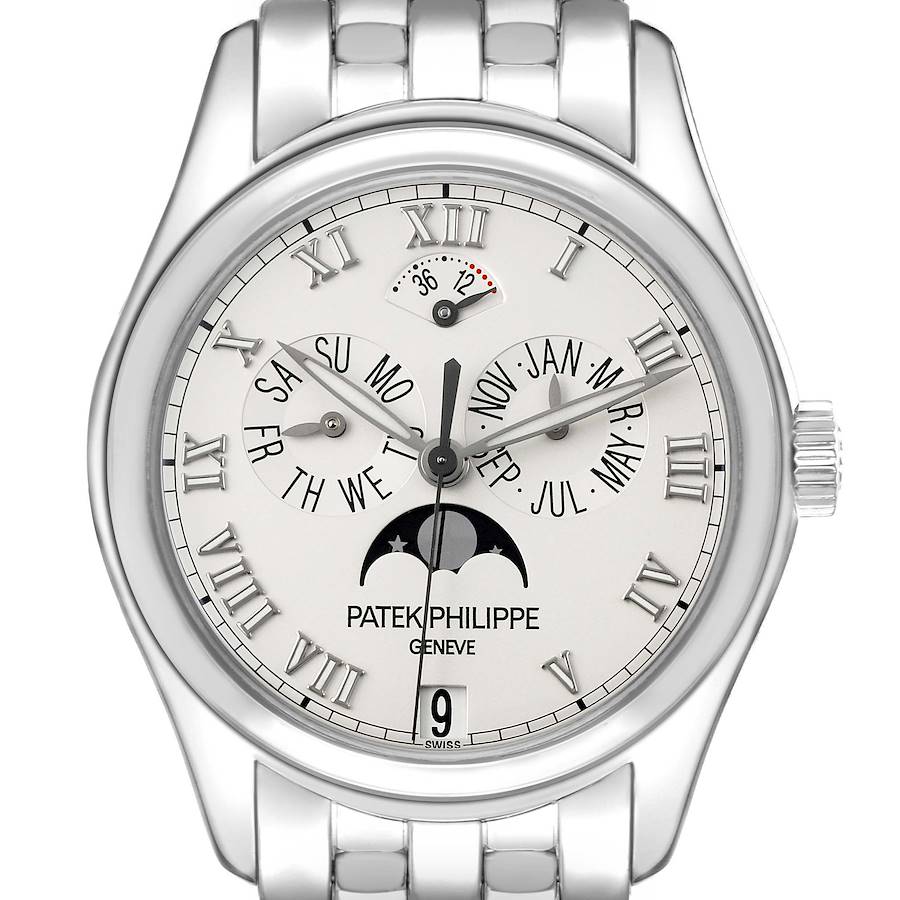 Patek Philippe Annual Calendar Moonphase White Gold 5036G 5036 Box Papers. Automatic self-winding lever movement. 48 hour power reserve and phases of the moon, sweep centre seconds, nickel finished lever movement with free-sprung gyromax balance. 18k white gold case 36.5mm in diameter. . Scratch resistant sapphire crystal. Silver dial with luminescent Roman numerals, outer minute track, and centre sweep seconds. Two subdials for the day and month, sector for power-reserve indication, and aperture for moon-phase. Date aperture at 6 o'clock. 18K white gold brick link bracelet. Fits 7 1/4" wrist.